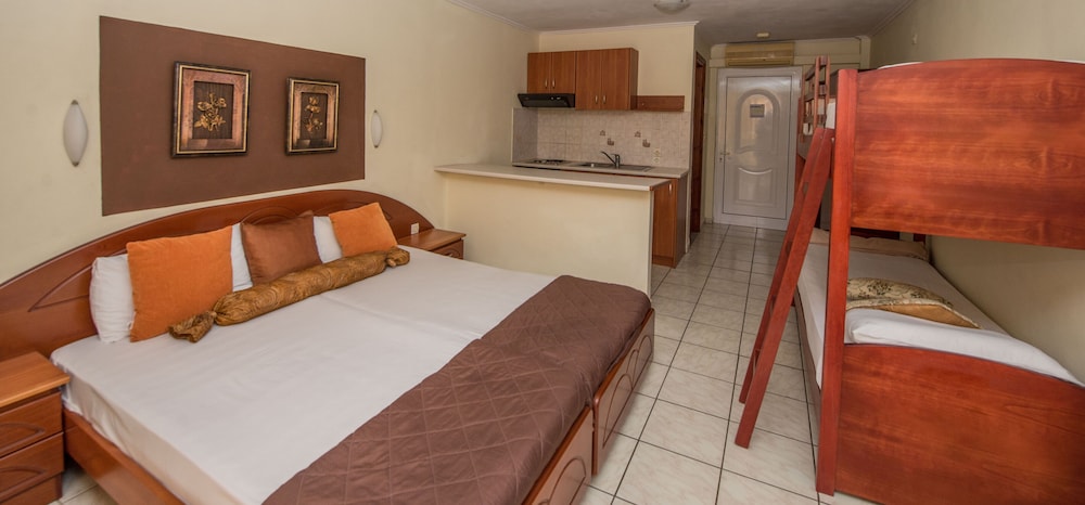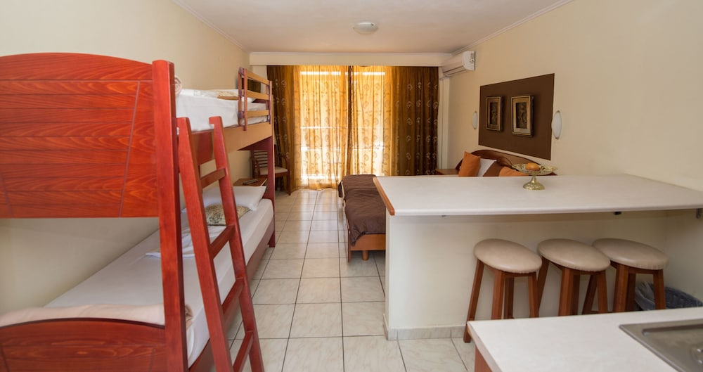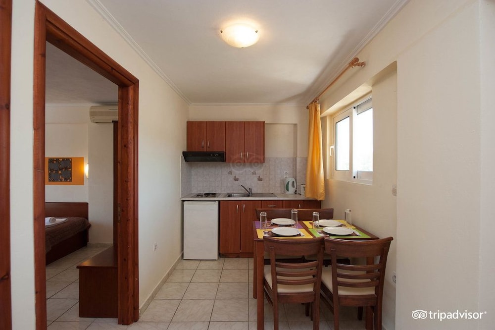 Damia the hotel owner was lovely, the pool area is very spacious with lots of beds and umbrellas. The pool was a good size for a nice swim. The apartment was a nice size with a view af the pool, overall we had a lovely stay.