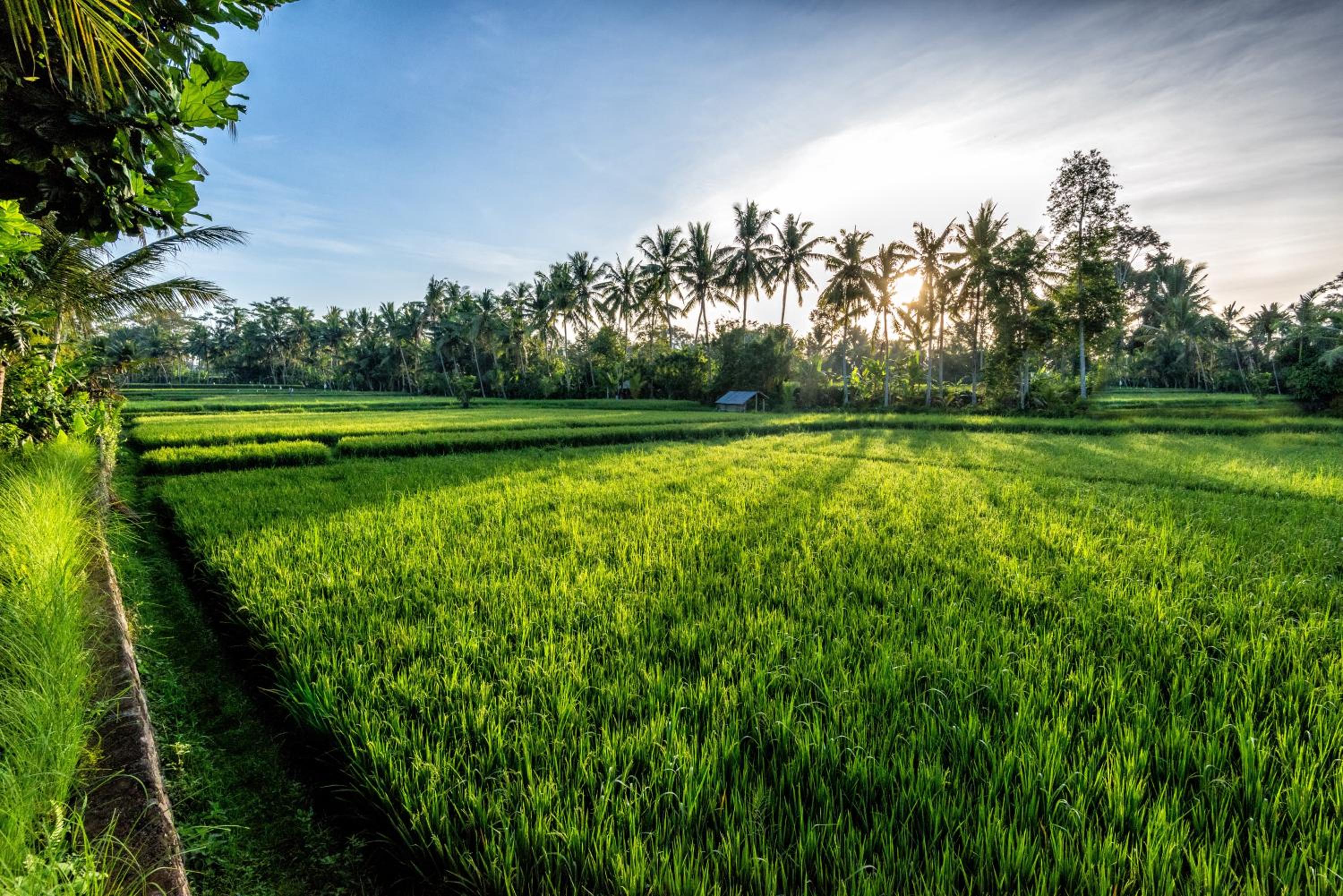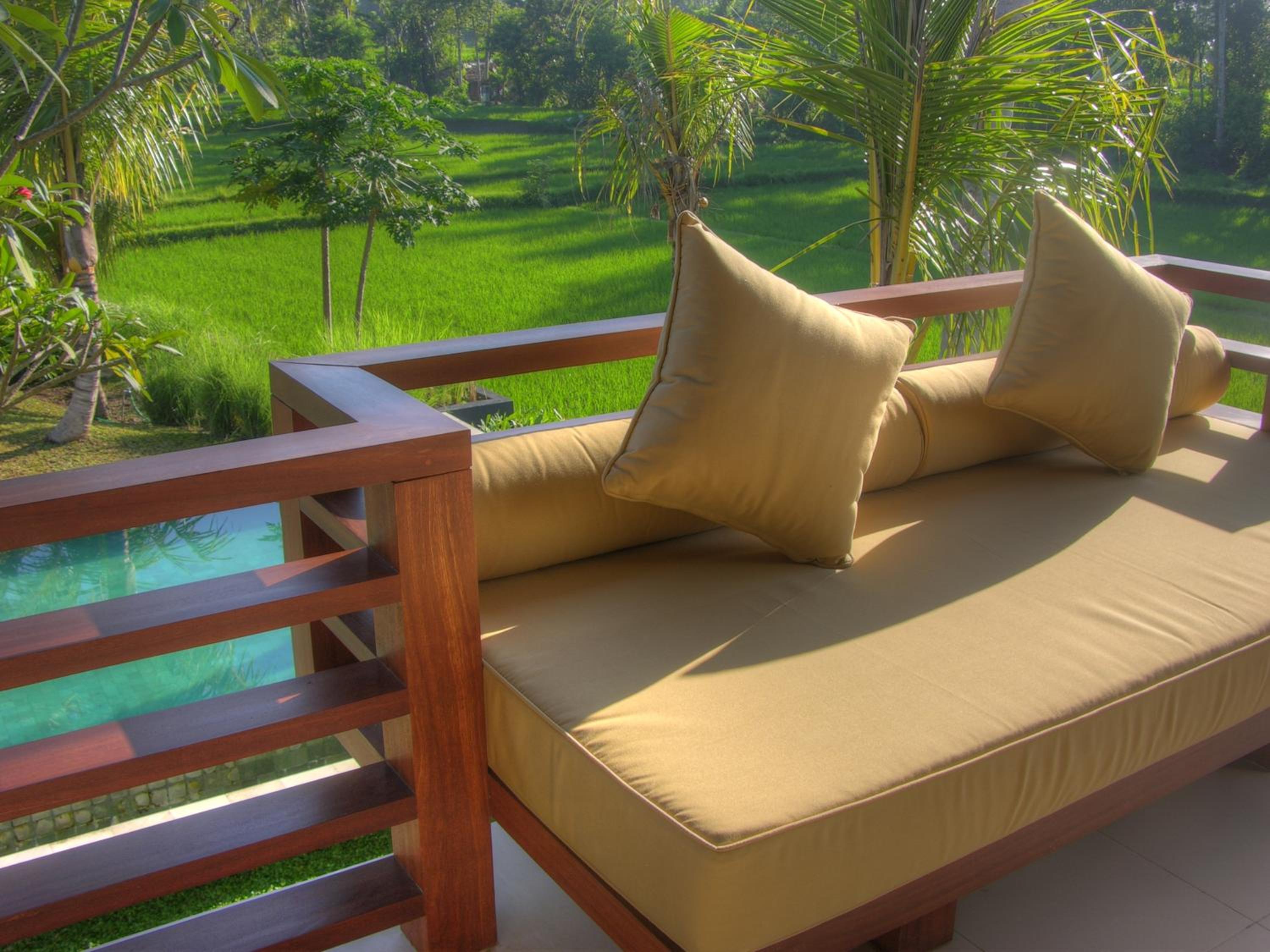 The swimming pool has a nice view onto a rice paddy field.