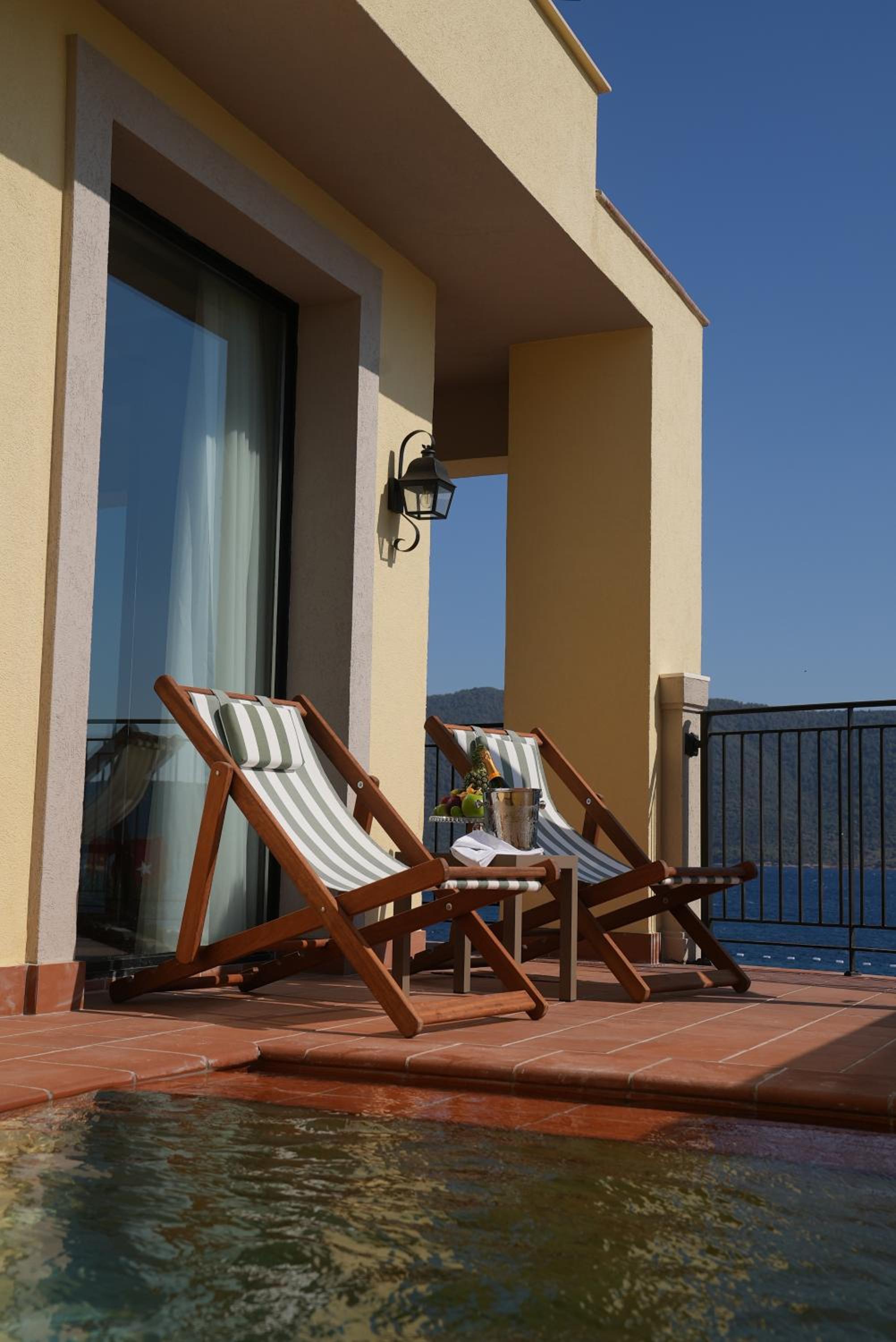 Outstanding traditional Turkish breakfast with every option available including very fresh orange juice and a good choice of cooked eggs. The restaurant in the evening was a very high standard (a little expensive but alternatives were a taxi drive away). Bar service good and perfect location for cocktails at spectacular sunset. Private beach, with excellent sunbeds, towels, and beach bar service all quite exceptional. We were immediately made welcome by the fantastic lady on reception who every day gave us help, advice and warm greetings. The hotel is one of the best ever. More like a private house with beautiful furniture, artworks, books and all facilities. Excellent sea view from our room (305 at reception level, 2 floors above beach, bar, restaurant). All staff were very professional and perfect English speaking.