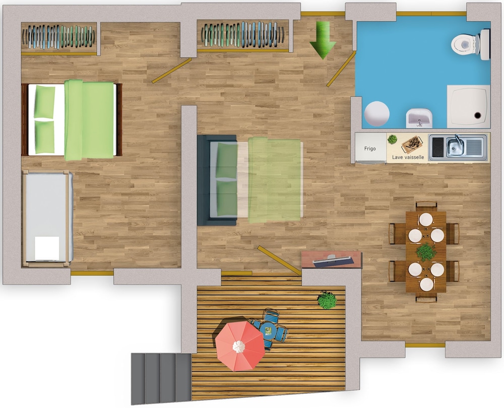 Good situated appartments in forrest area near lovely village. Apt are filly equiped. Balcony. Nice sports field for basketball, soccer and so on. Bread service. Quiet at night. Enough parking. Apt with two single beds and a sleeping sofa. No airco. Good bathroom.