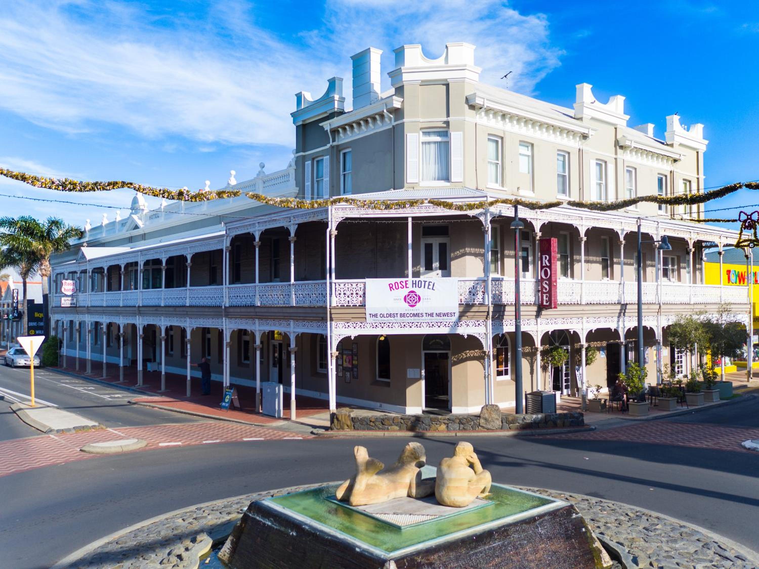 To experience the perfect blend of heritage charm and modern comforts, book your stay at Rose Hotel & Motel in Bunbury. Located in the heart of Bunbury CBD, our hotel offers free WiFi, onsite bar and restaurant, and air-conditioned rooms with all essential amenities. Enjoy a short walk to Back Beach or explore nearby attractions like Big Swamp Bird Park. Indulge in delicious modern Australian pub cuisine at our renovated bar and restaurant, or host events in our ballroom. Don't forget, every booking comes with a AU$25 food and beverage credit. Your unforgettable stay awaits at The Rose Hotel & Motel.