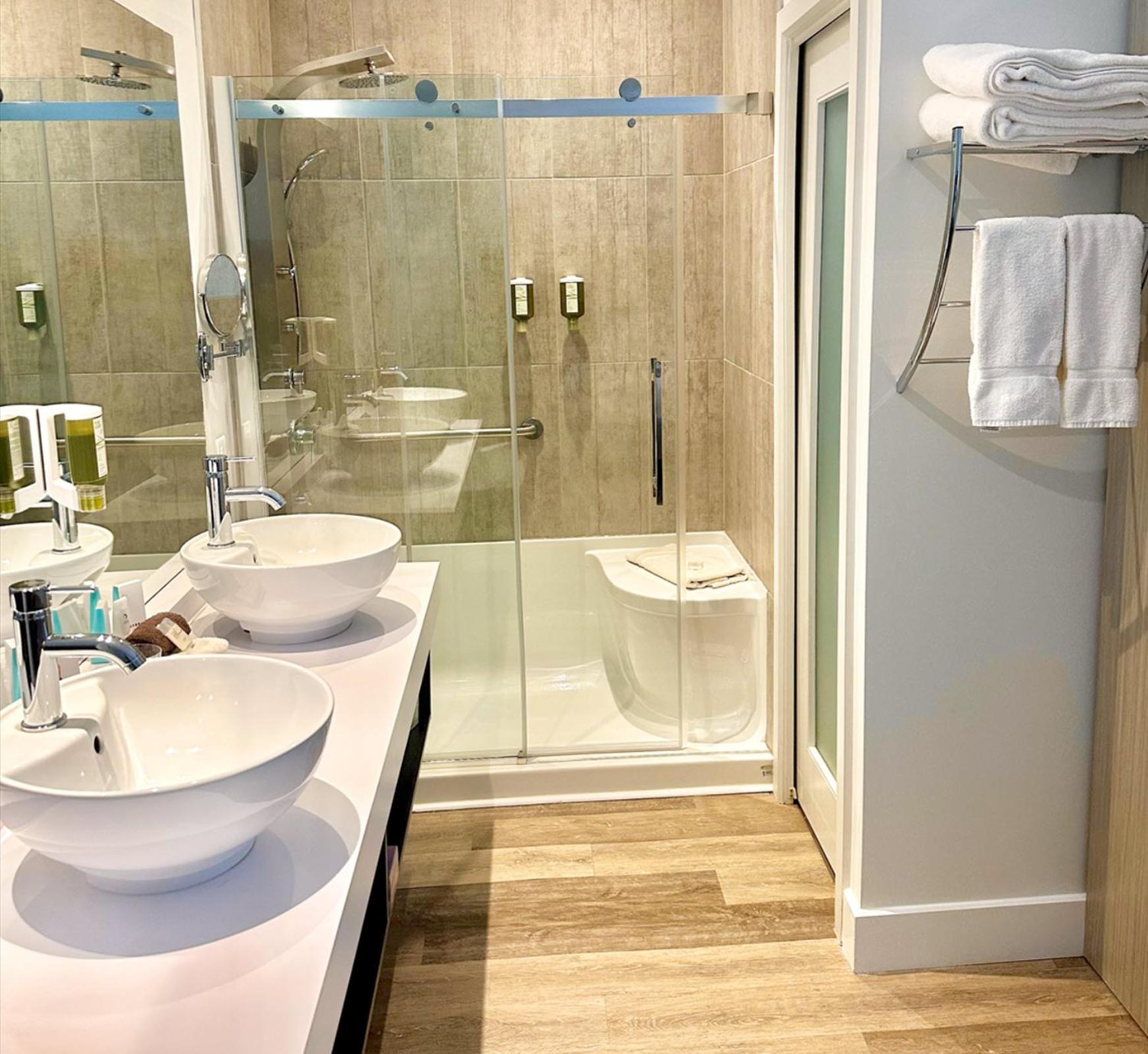 The room is quite nice, although having two chairs and a little table would have been nice. The bathroom is really nice and the shower very enjoyable. They need to do something about the continental breakfasts. Although there is a spread, it is so uninviting. Most mornings, the croissants were so hard. And it's the same thing every morning. You have to clean your own table, put your dishes in bins. Not a great expérience as far as breakfast is concernés.