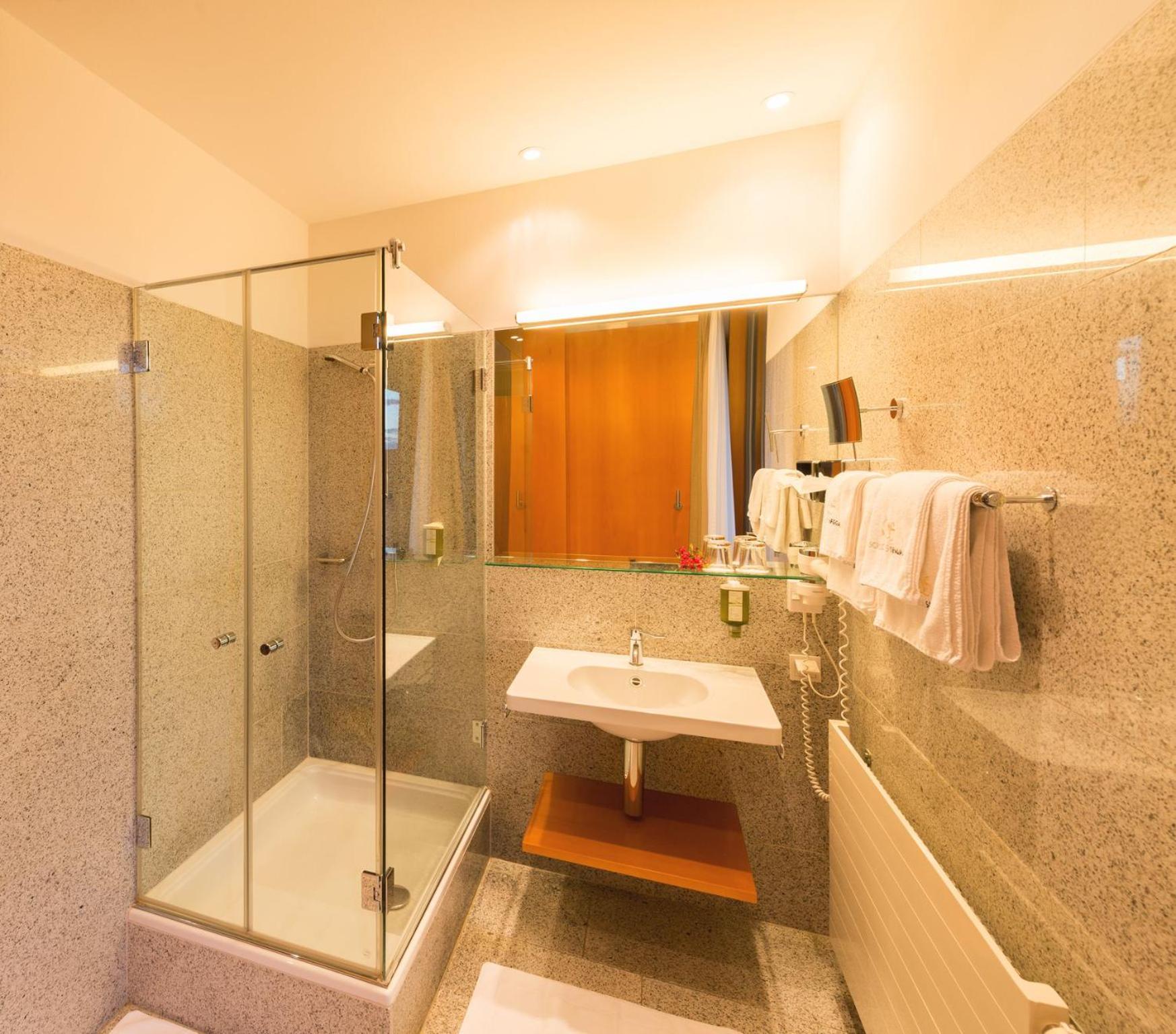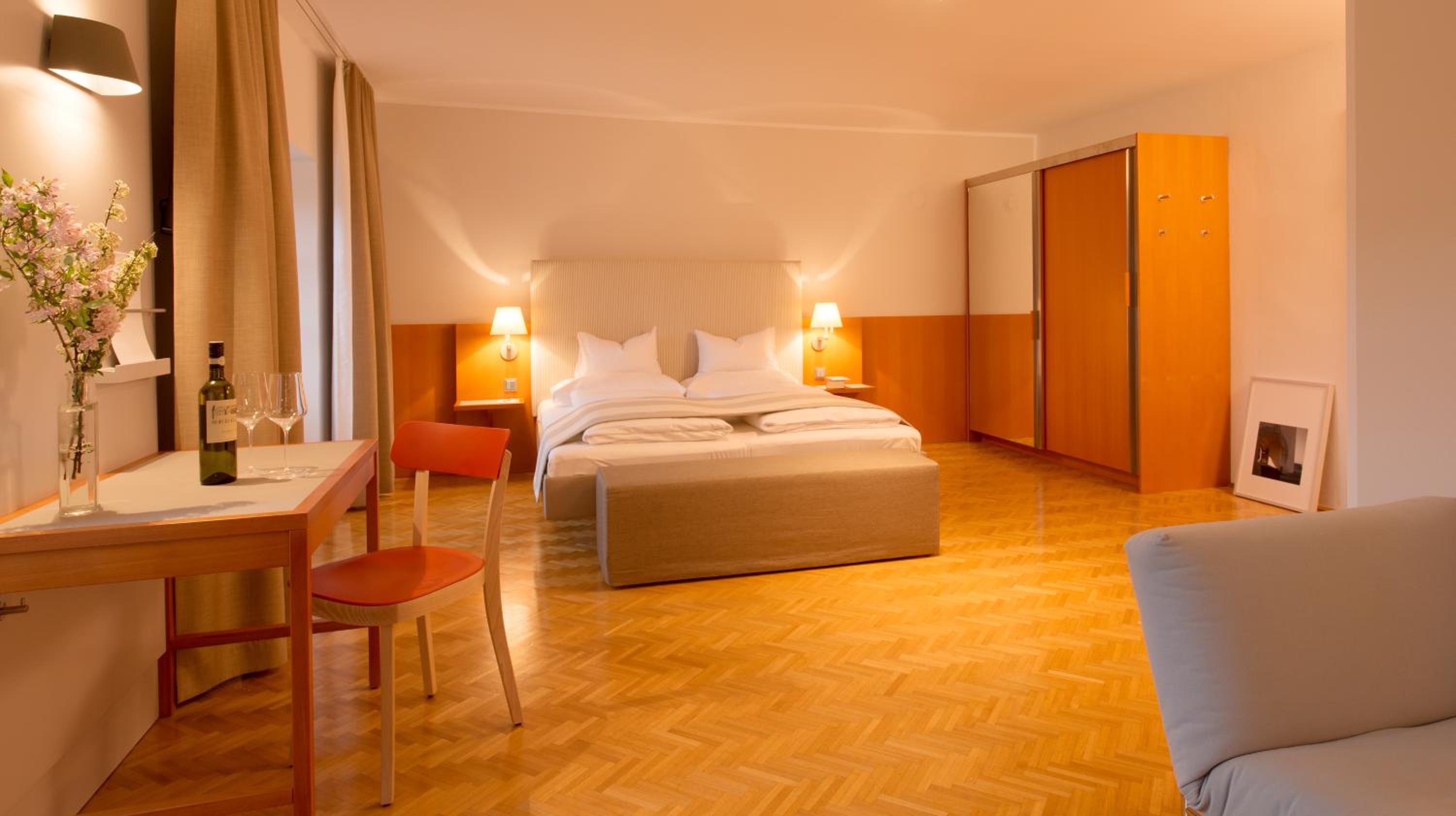 Geräumiges sehr sauberes Zimmer, Bad und WC getrennt; großer Balkon mit schönem Ausblick; tolles Weinangebot aus dem hauseigenen Weinkeller