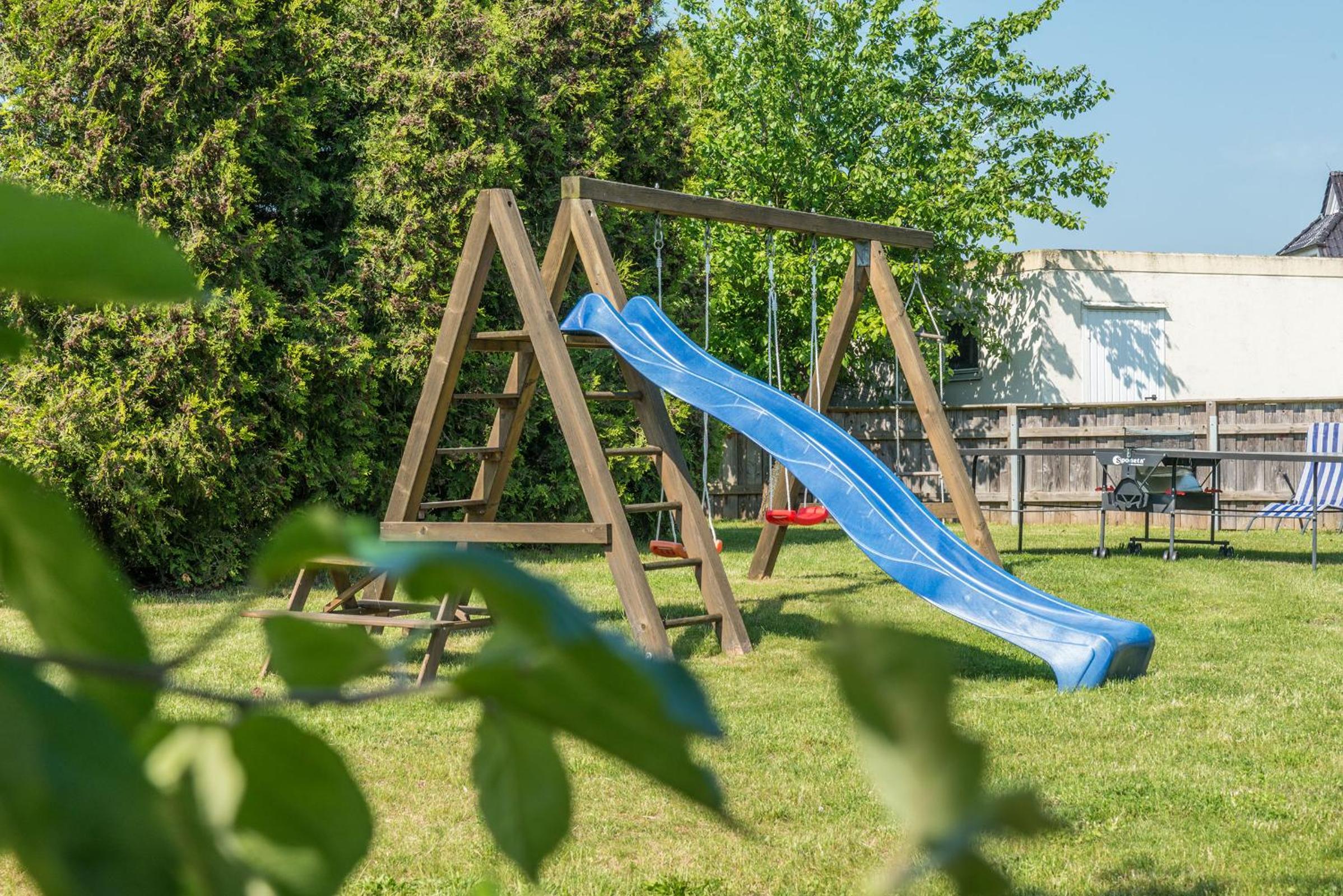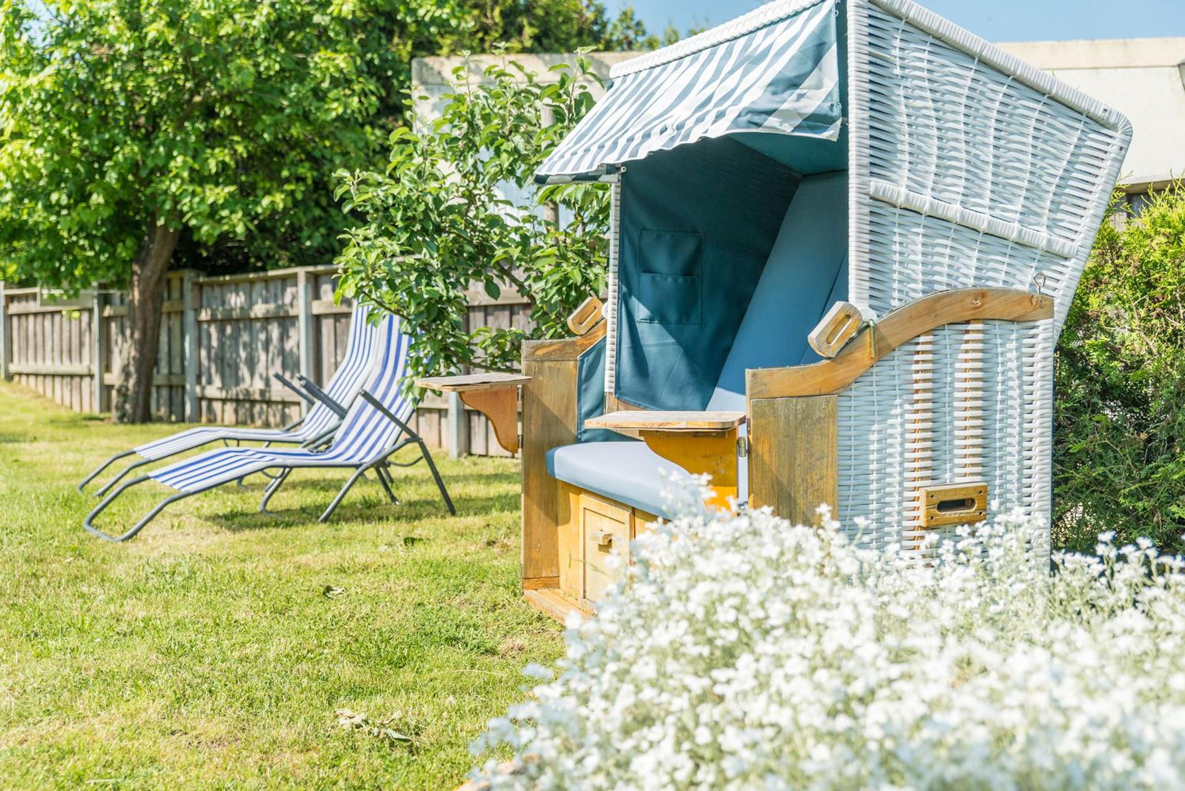 Indulge in relaxation at the sauna area with a Finnish sauna, infrared cabin, and a peaceful relaxation room. Enjoy the garden with a sunbathing area, wicker beach basket chairs, and a children’s playground.