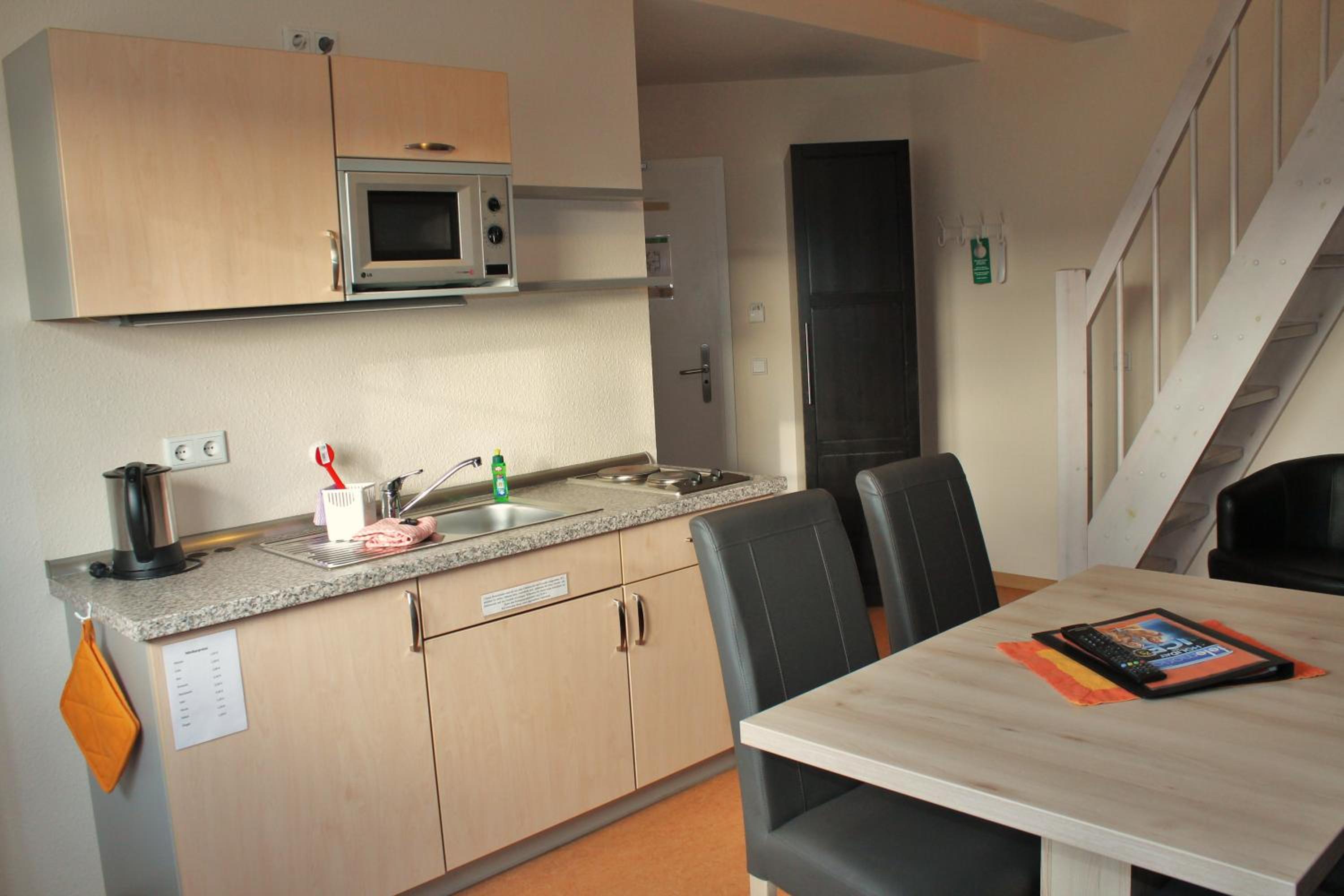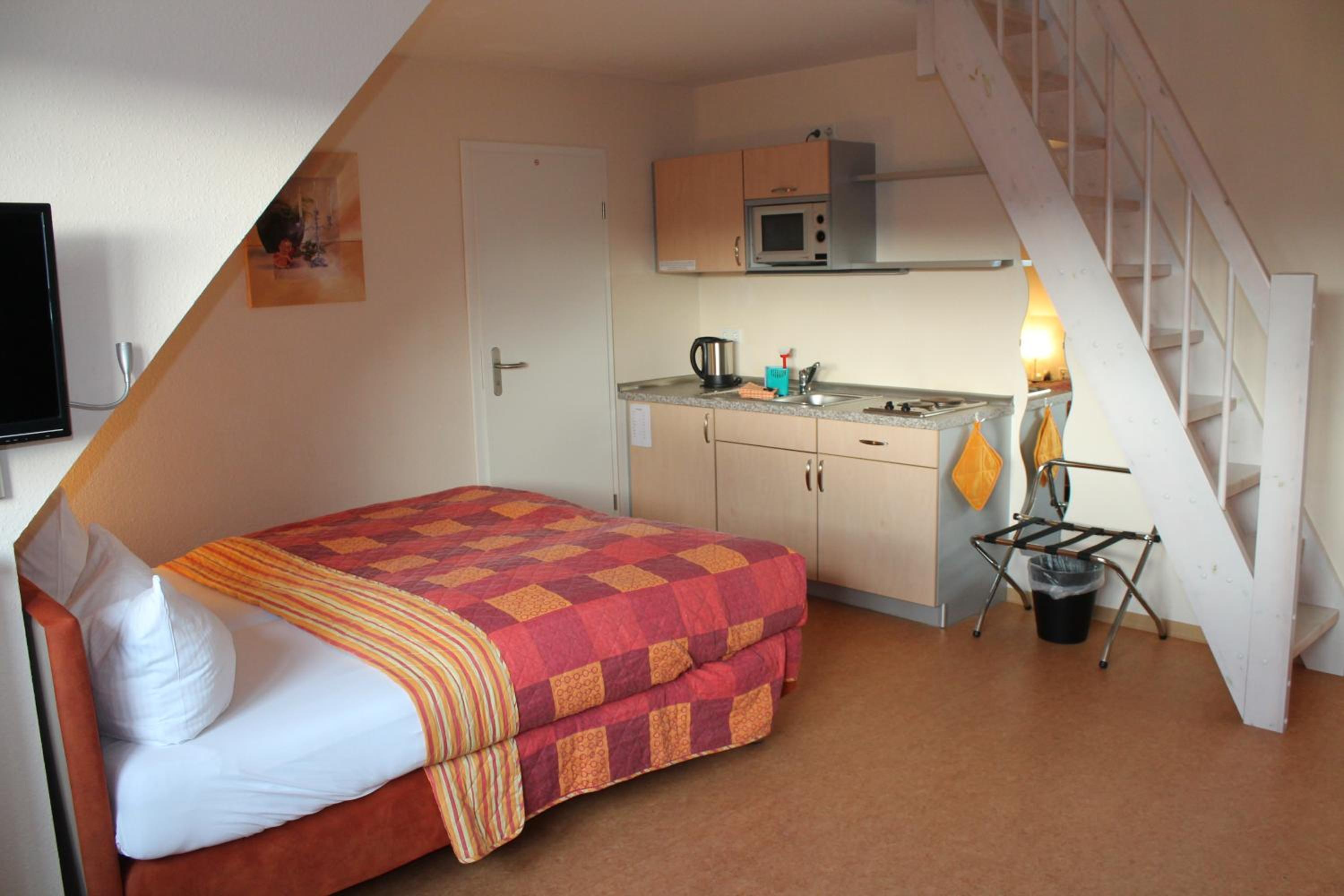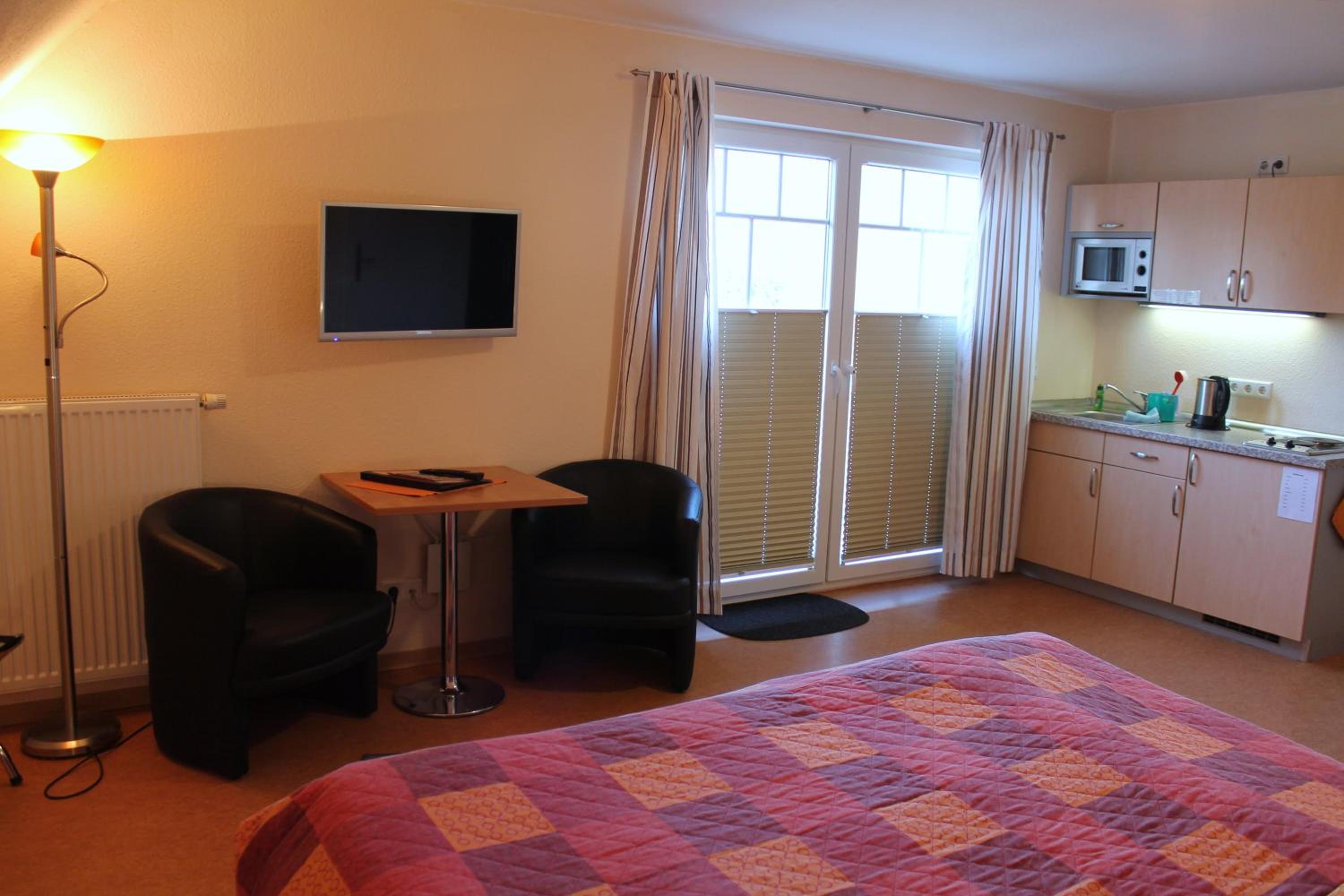 Each room at the hotel is equipped with a flat-screen TV and a convenient kitchen unit featuring a microwave, fridge, kettle, and stove plate for your comfort.