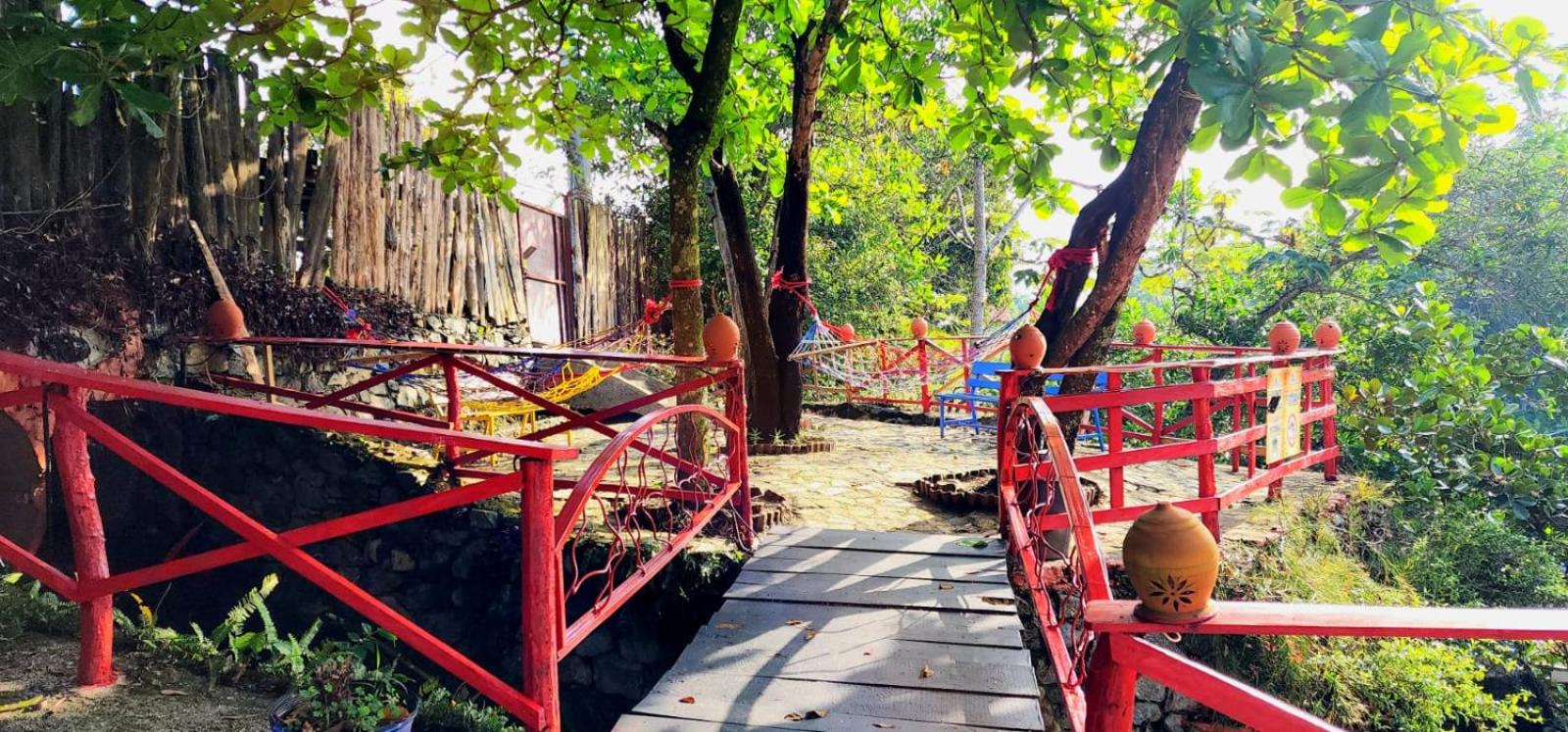 Magnifique site sur le bord de la rivière avec belle végétation et la vue sur les montagnes. Petit pont suspendu traversant la rivière (que je n’ai pas pris car la structure est douteuse) Nous étions presque seuls dans le resort un lundi, donc super tranquille le matin. Petit-déjeuner inclus au restaurant donnant sur la rivière.