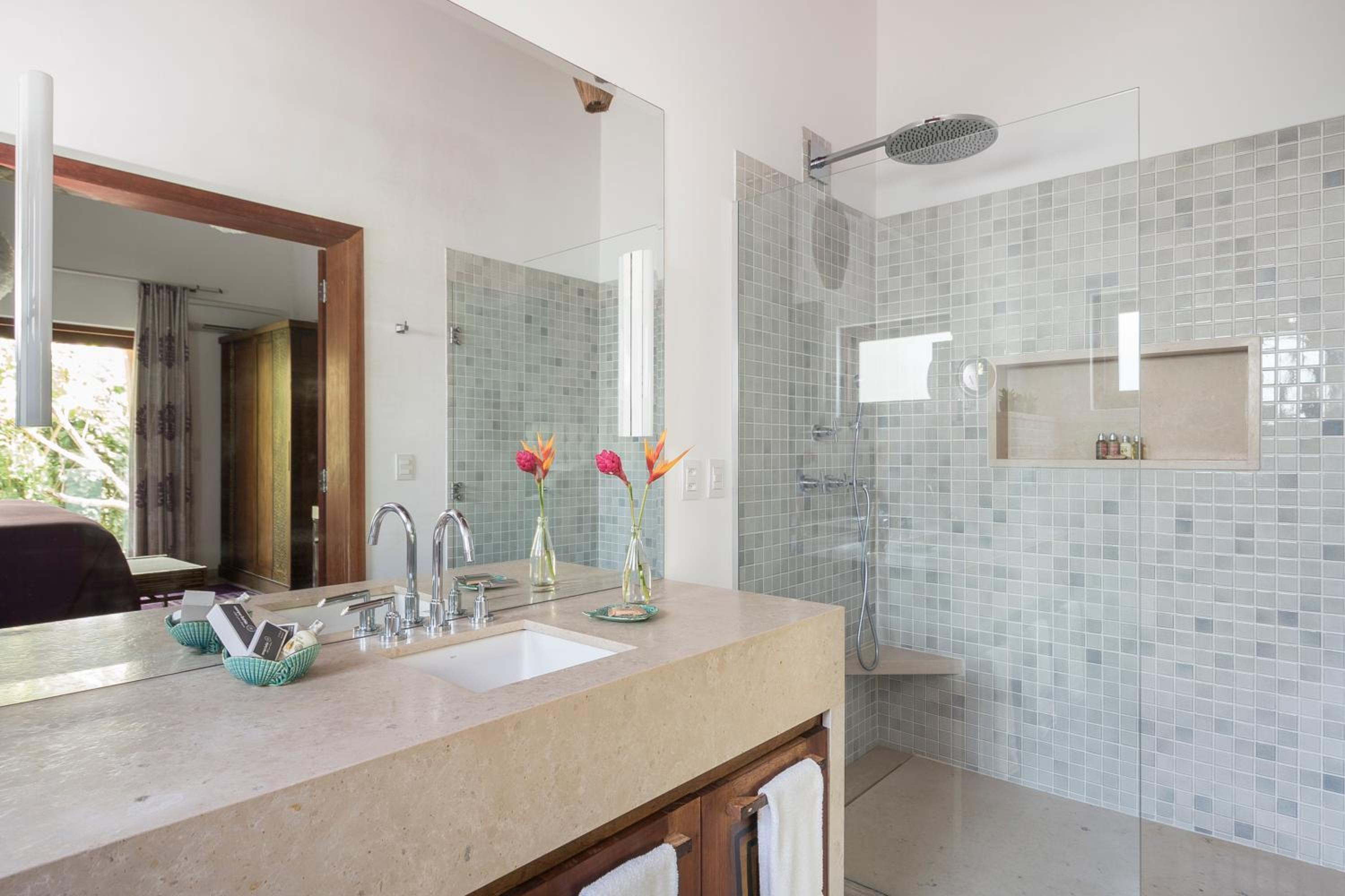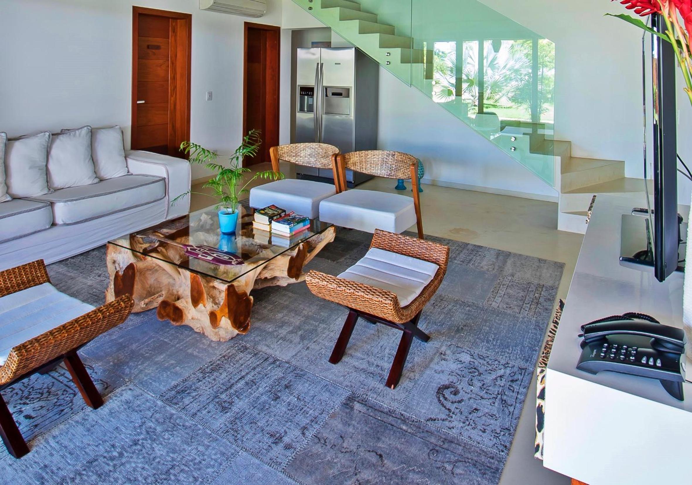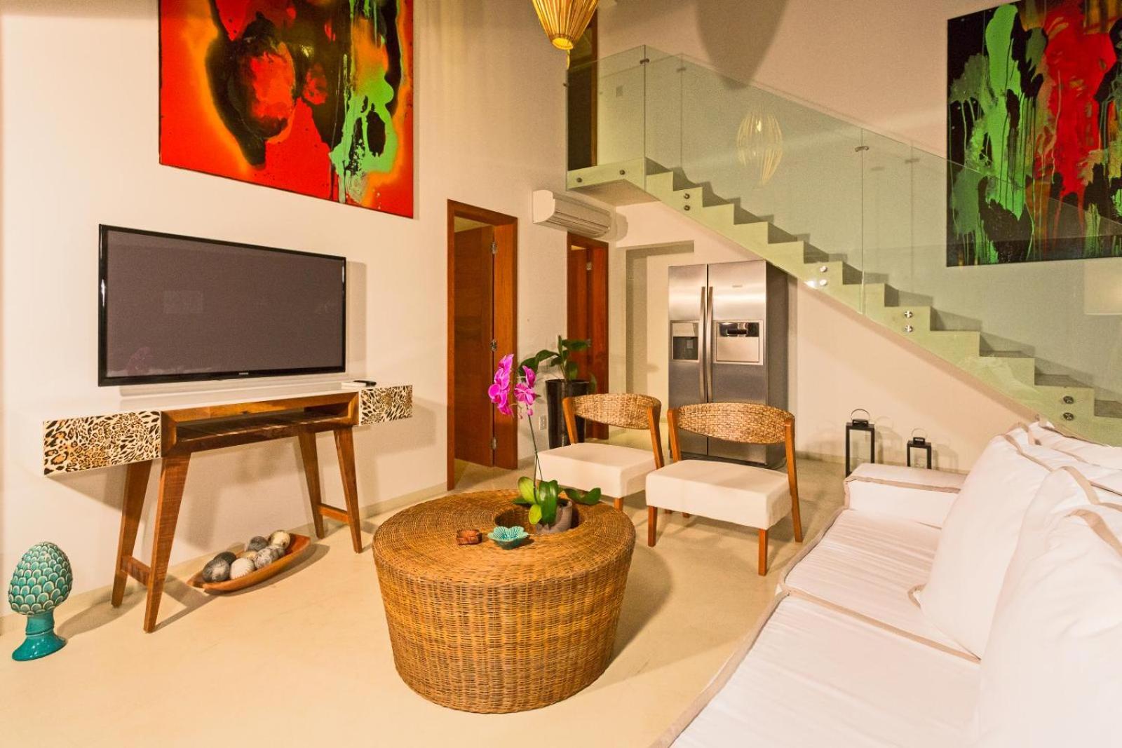 Campo Bahia offers a choice between villas or a double room in a villa, each equipped with modern amenities including a TV, air conditioning, and a spacious living room. The private bathrooms are stocked with essentials and feature a refreshing shower.