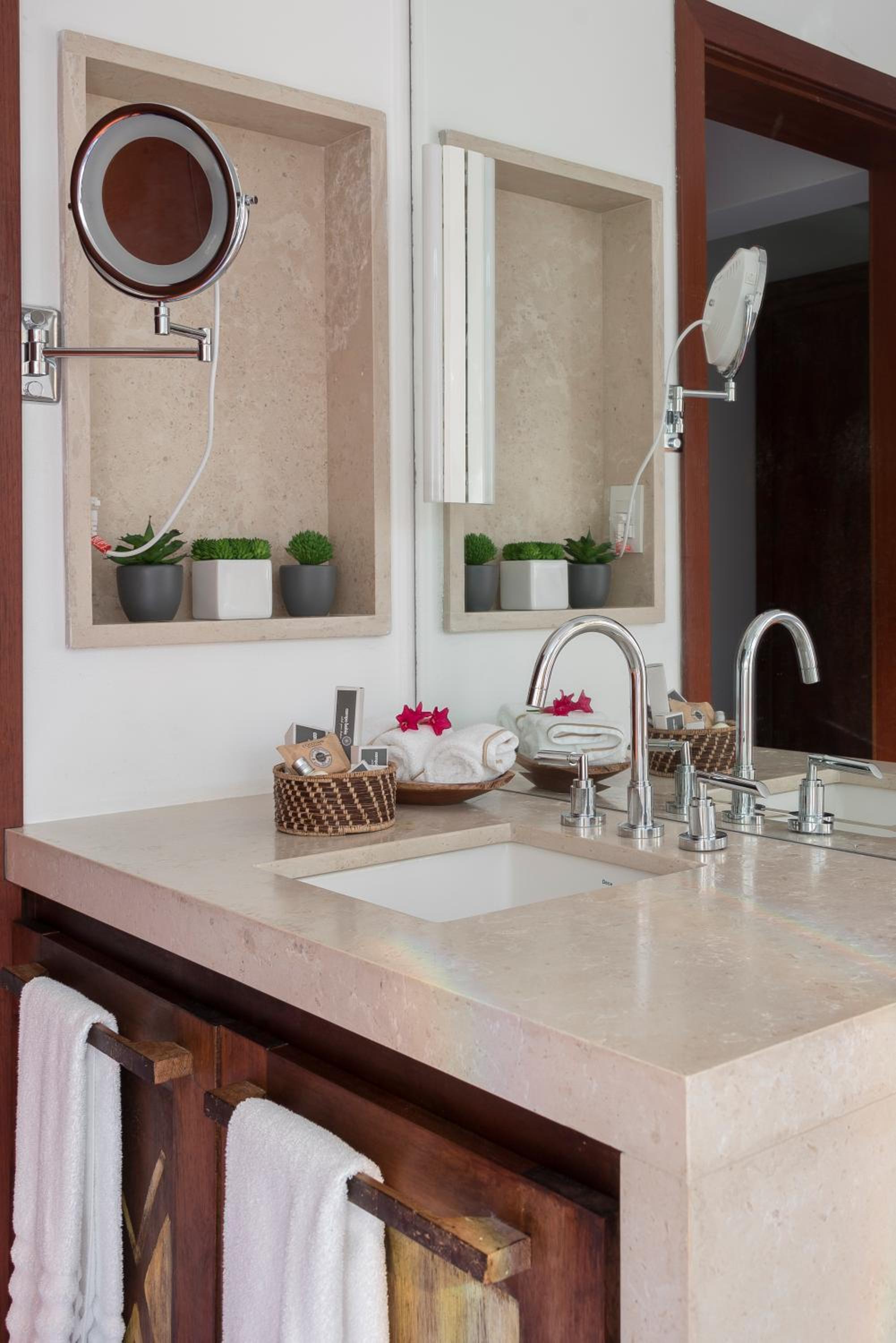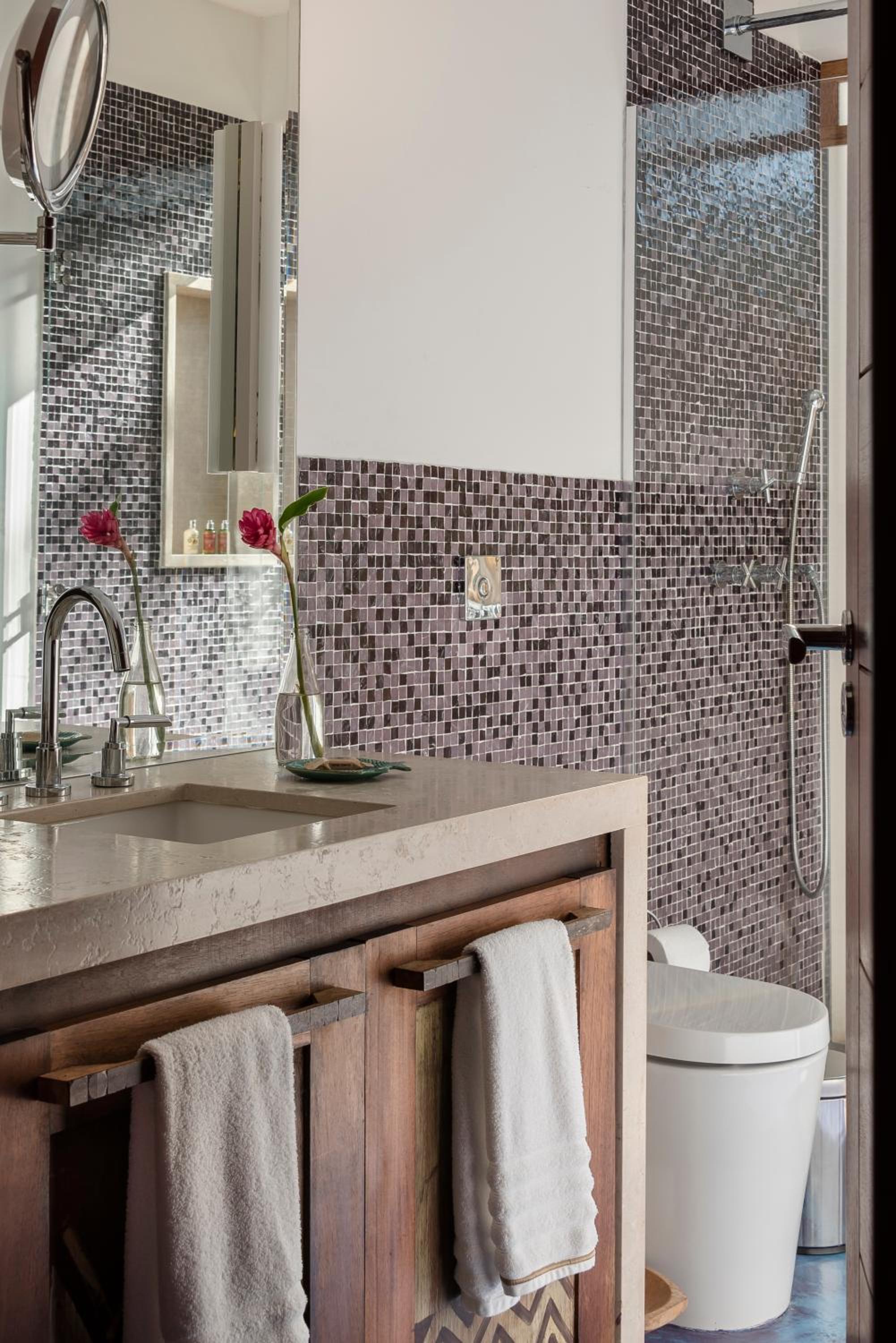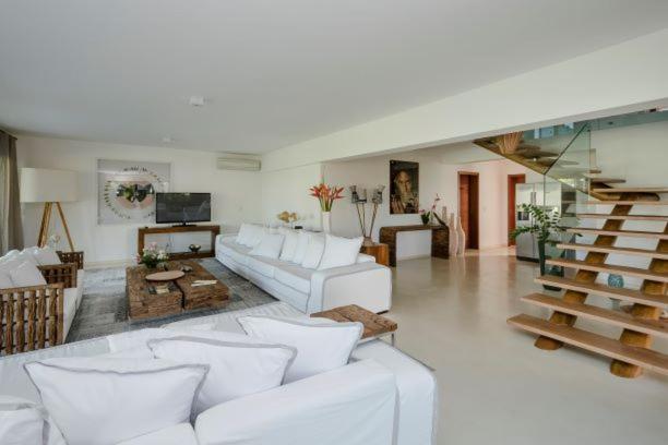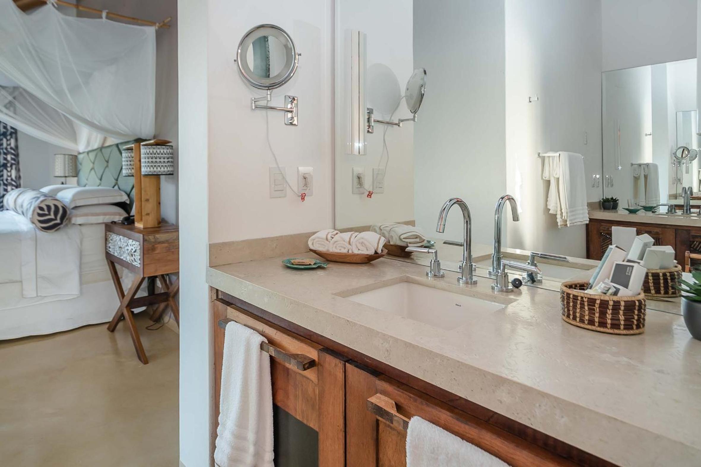 Campo Bahia offers a choice between villas or a double room in a villa, each equipped with modern amenities including a TV, air conditioning, and a spacious living room. The private bathrooms are stocked with essentials and feature a refreshing shower.