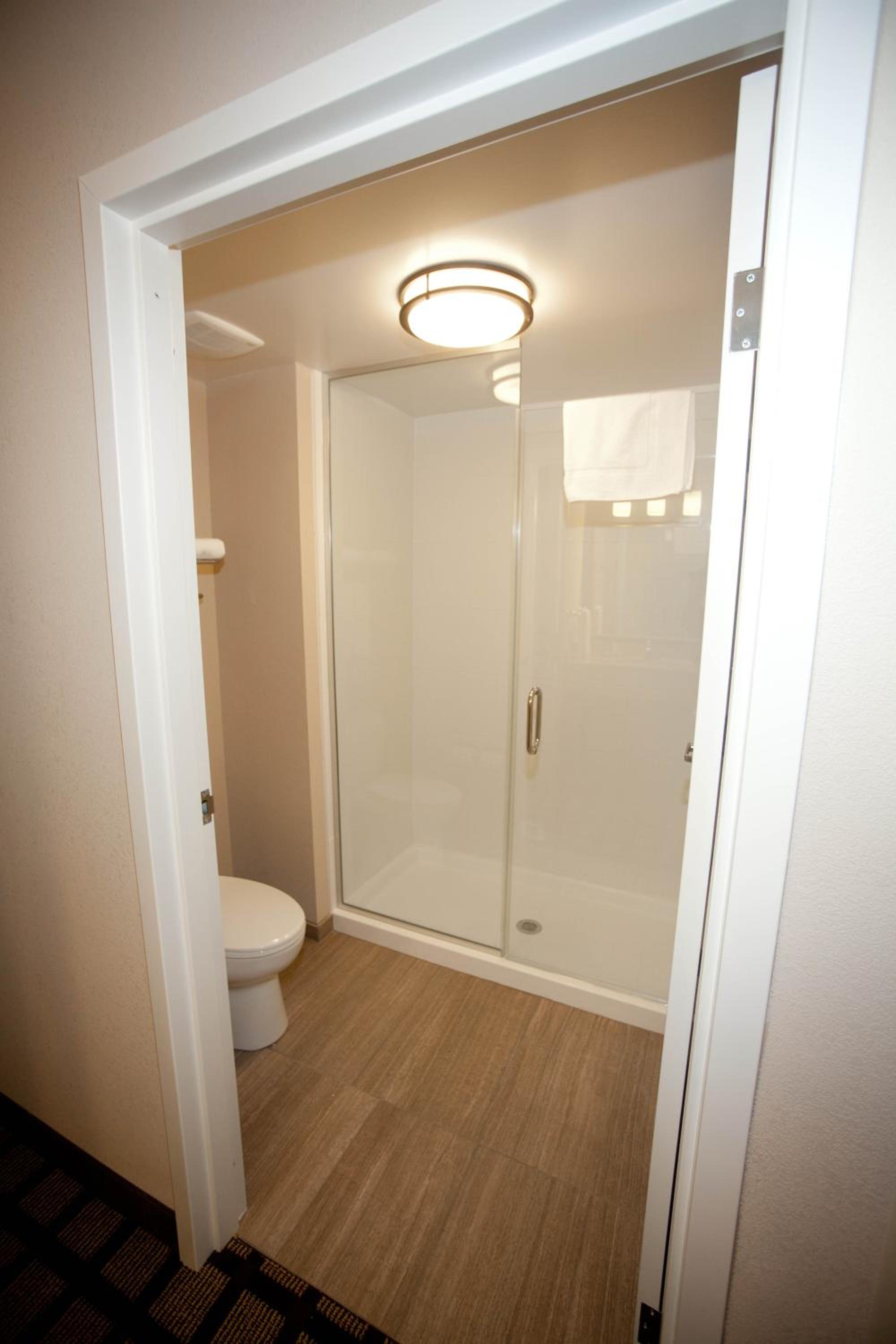 No shower curtain and had to put shower curtain up myself on bars that were bent. Bed way too high for someone whom is 5 foot 2 and too firm. Shower doors not clean. Staff on desk unhelpful and not informative.