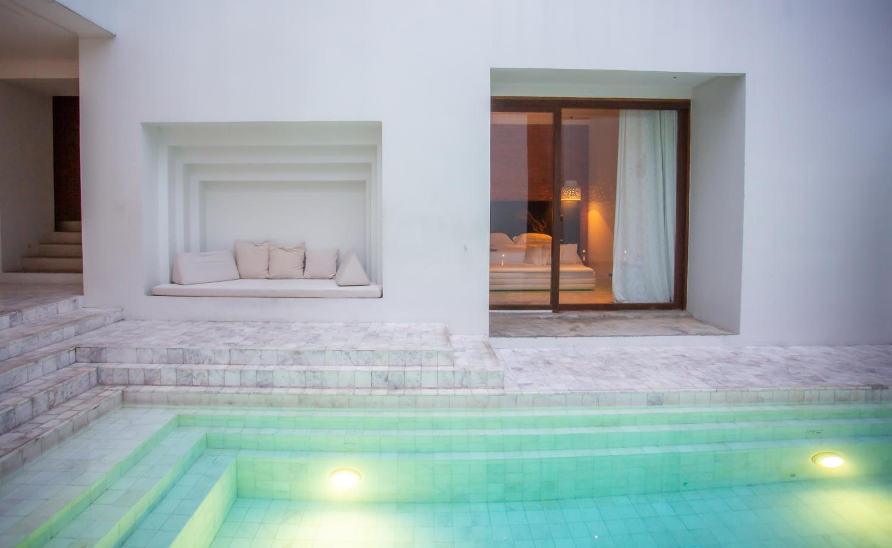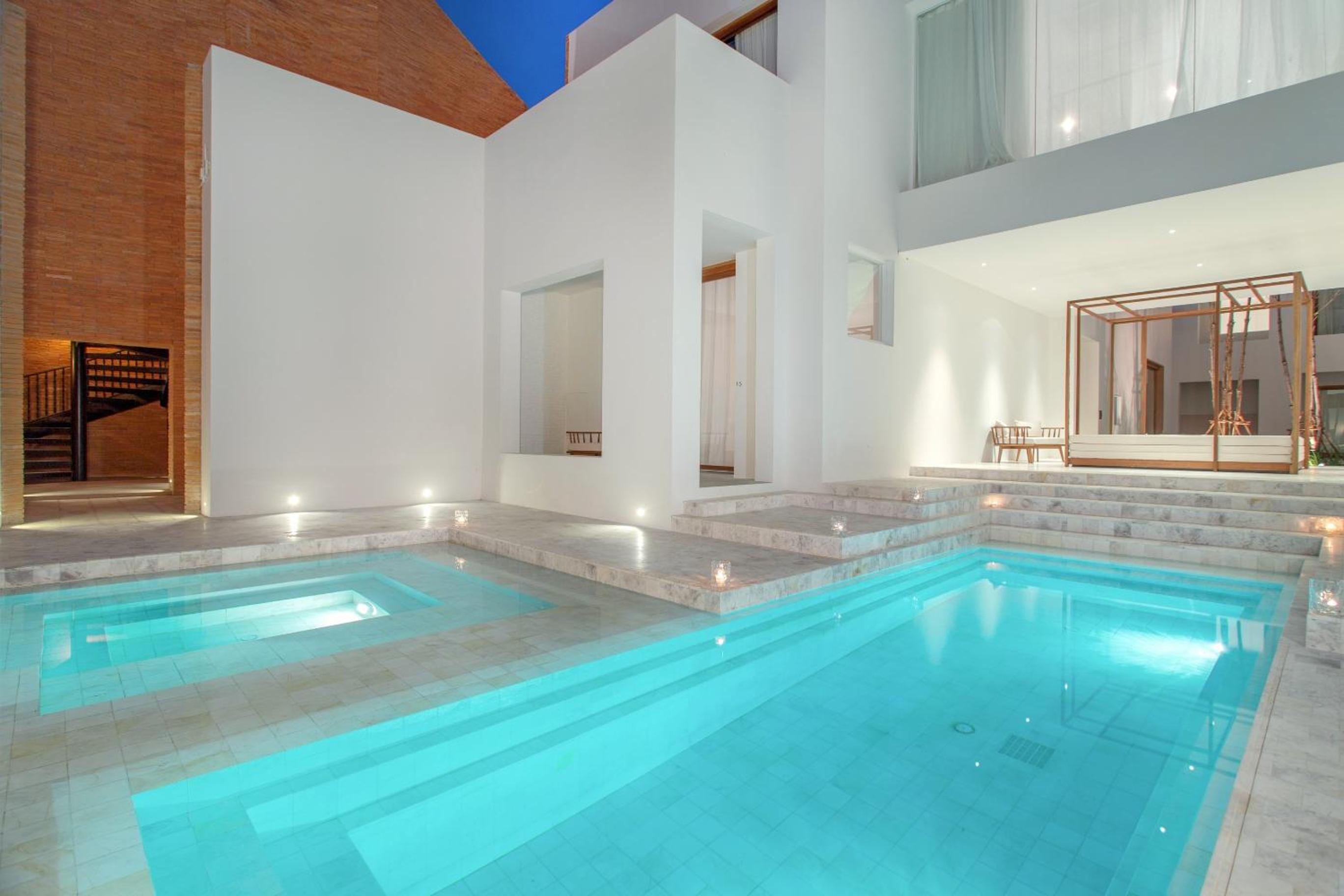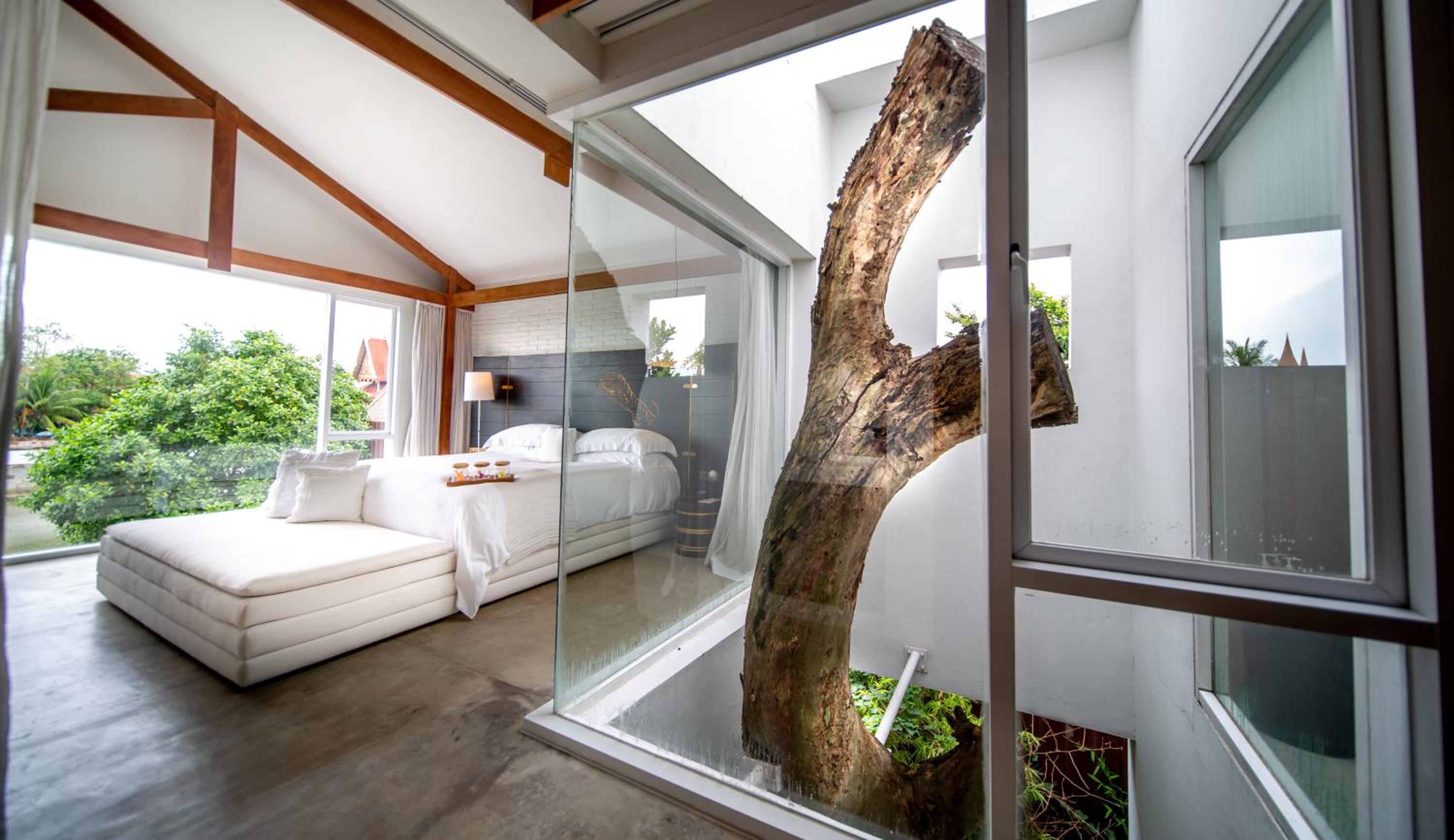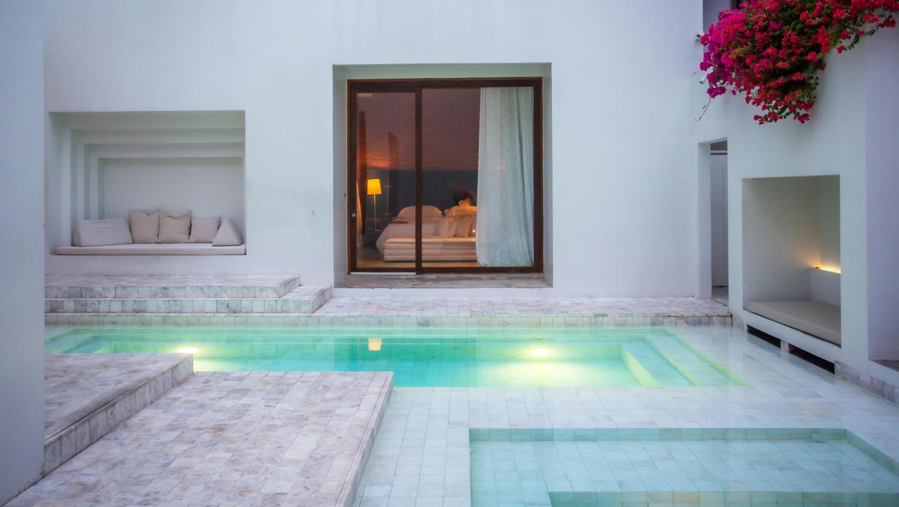 O quarto era excepcional bem decorado, muito espaçoso. Não usei a banheira redonda, mas usei o colchão da área de leitura acessível por uma pequena escada. E abrindo a porta do quarto tinha a piscina mesmo em frente.