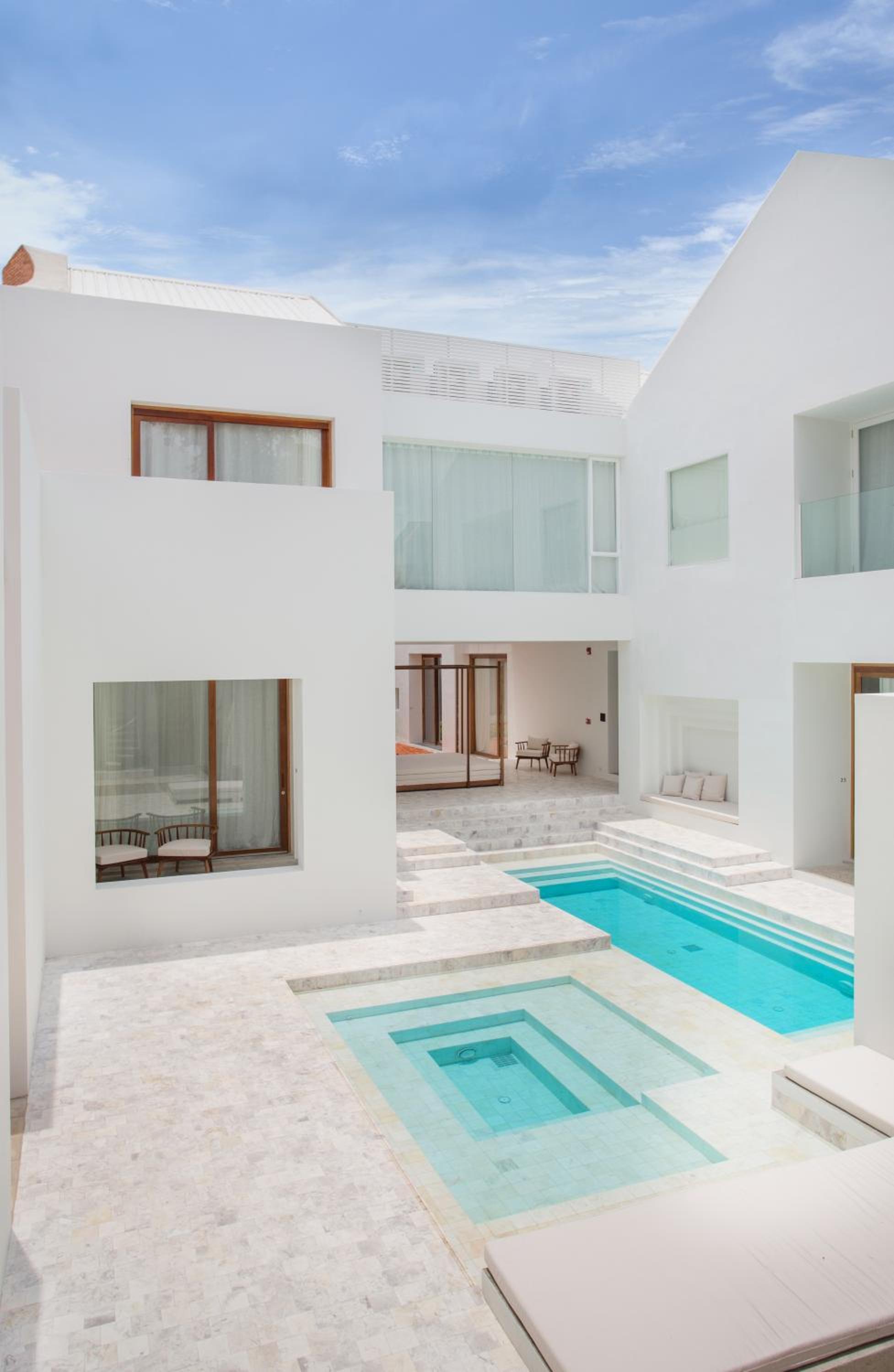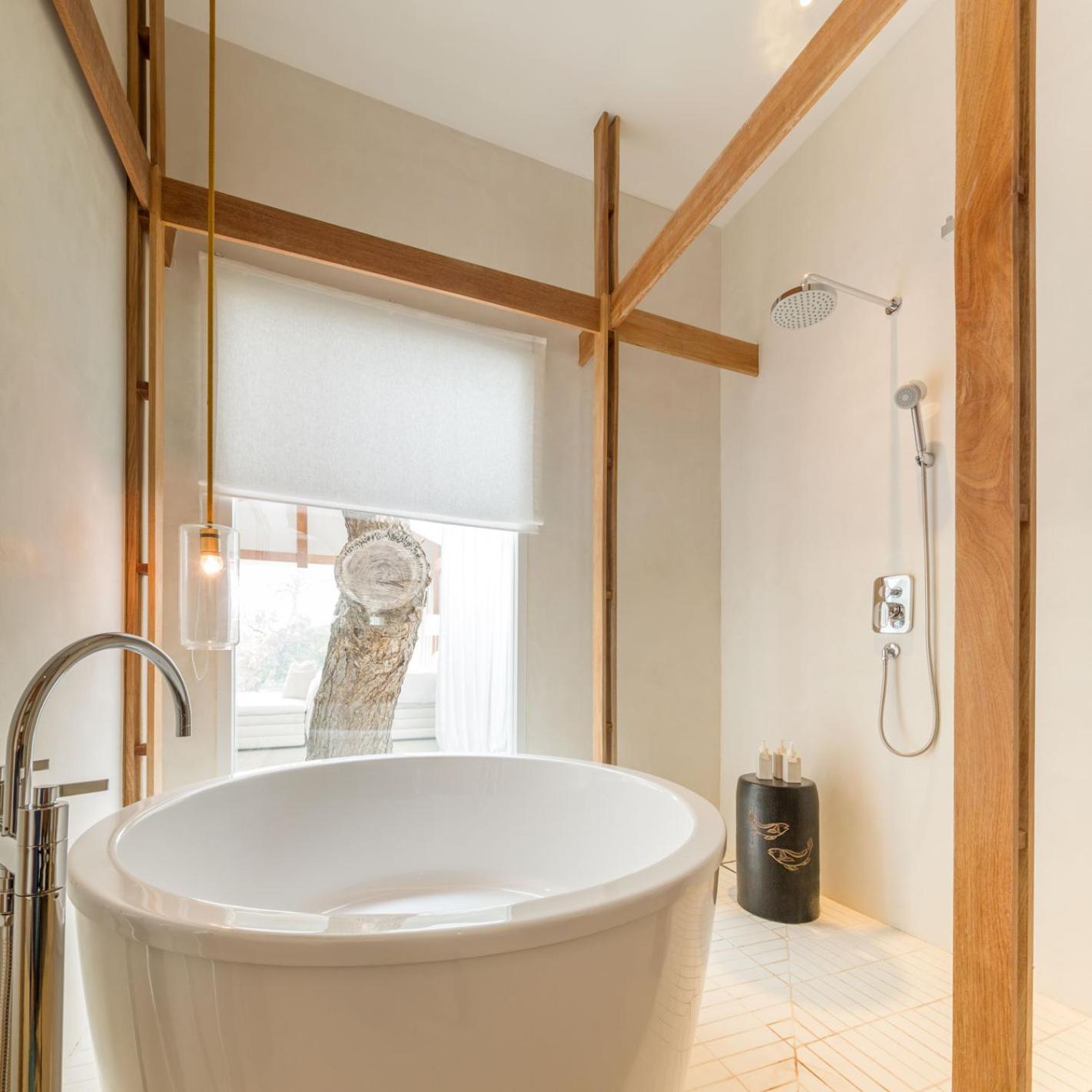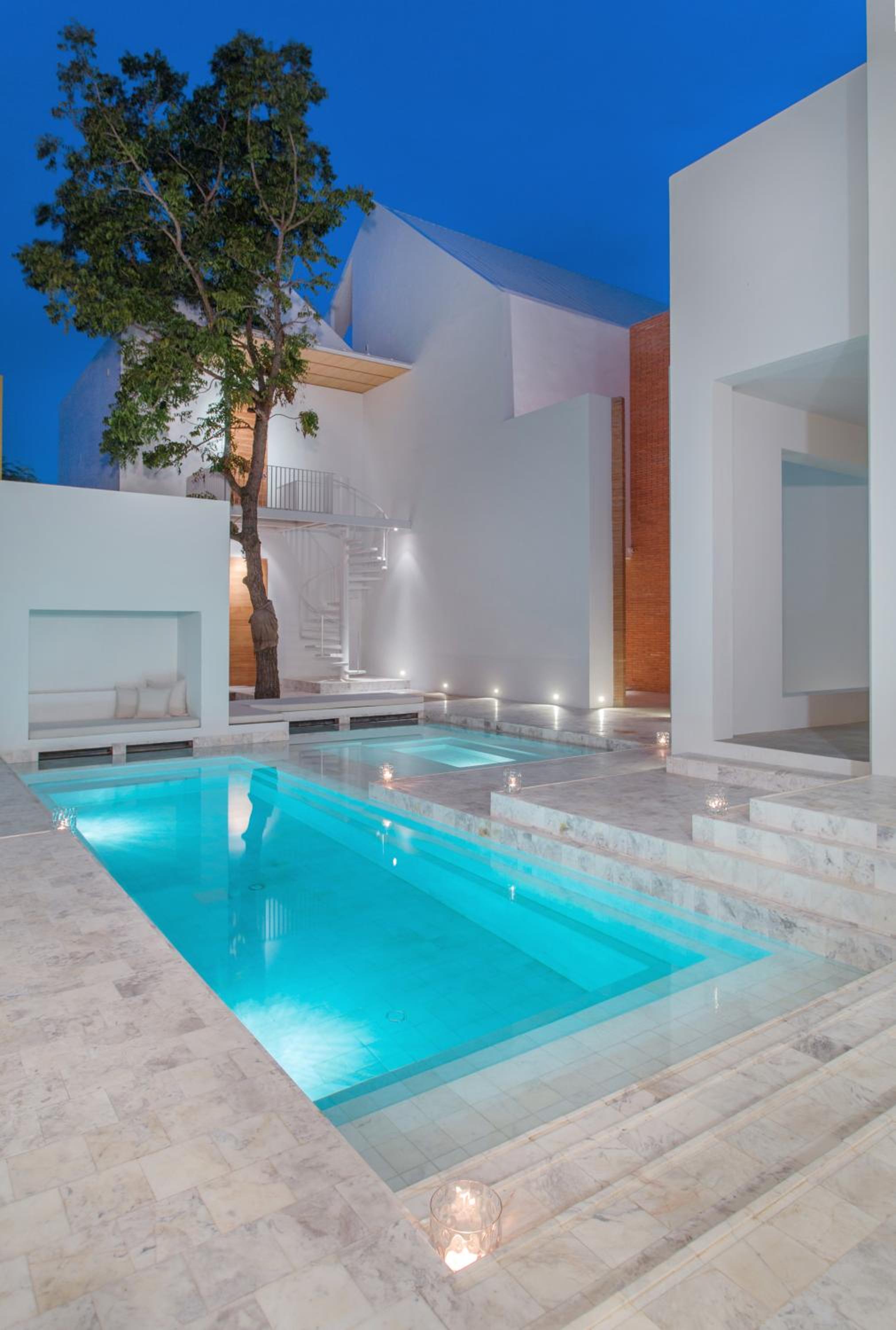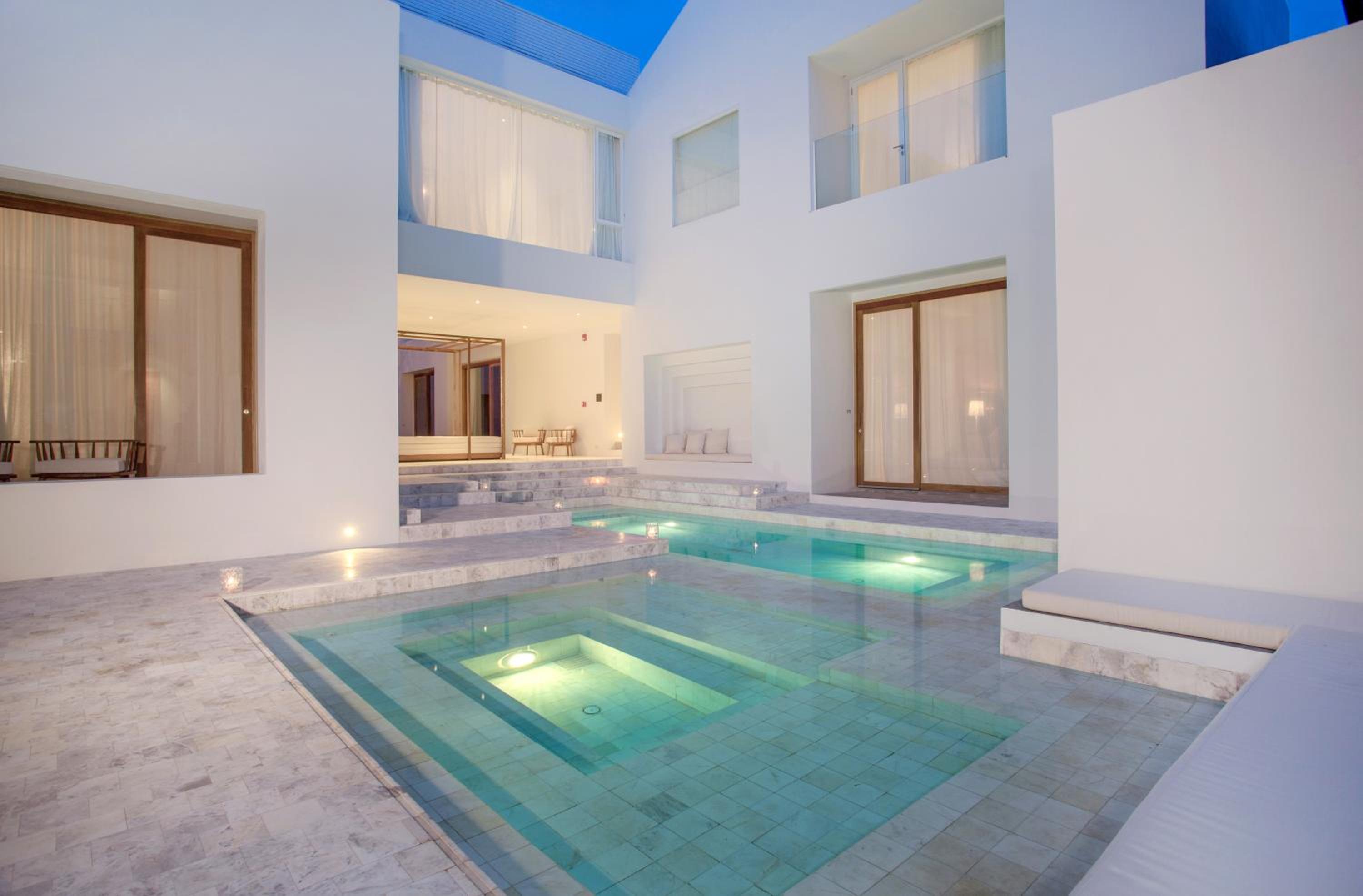 O quarto era excepcional bem decorado, muito espaçoso. Não usei a banheira redonda, mas usei o colchão da área de leitura acessível por uma pequena escada. E abrindo a porta do quarto tinha a piscina mesmo em frente.