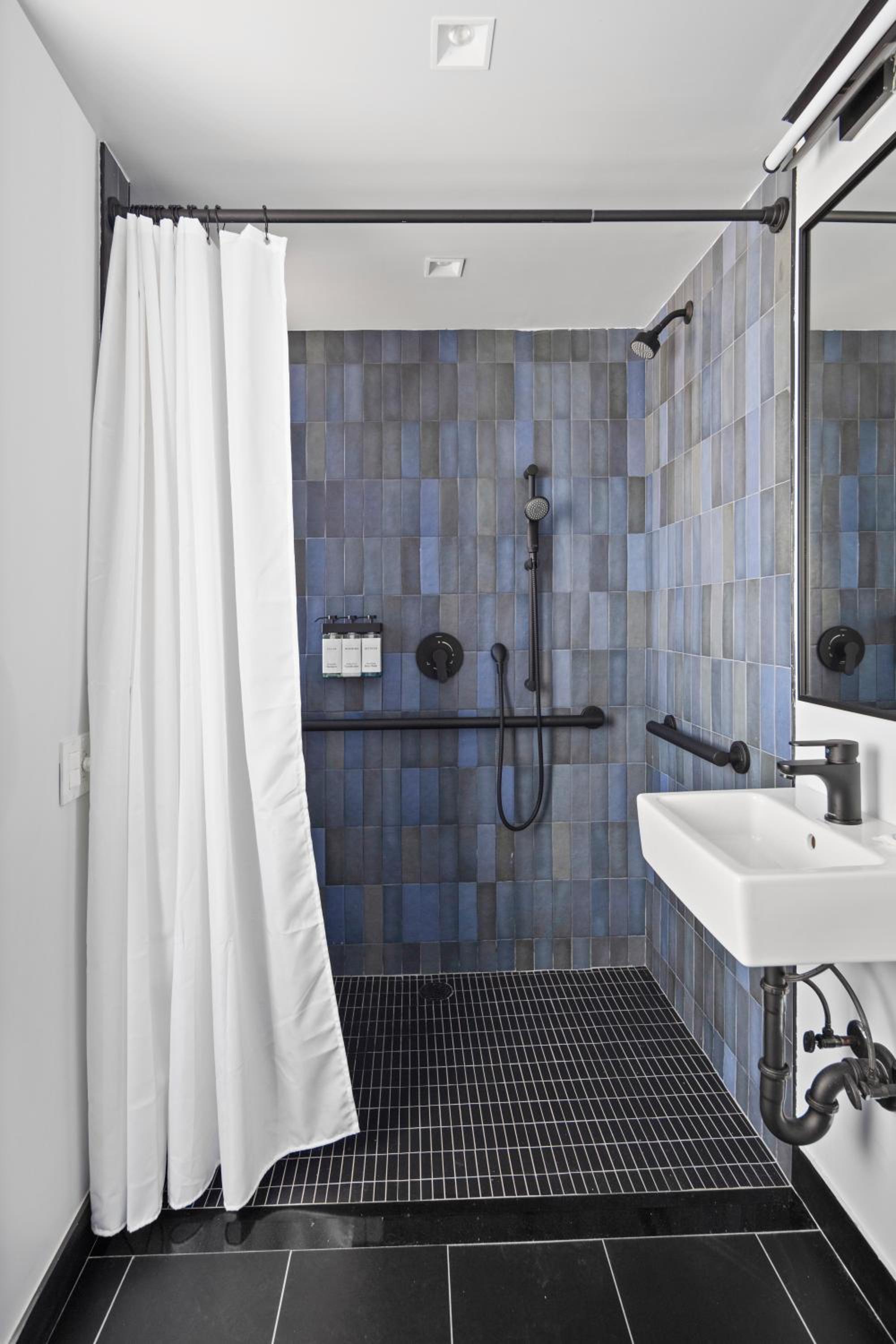 Shower floor is not well separated from the rest of bathroom leading to easy leakage elsewhere. Sink is also awkwardly built needing you to place hands right up against its edge to wash hands.
