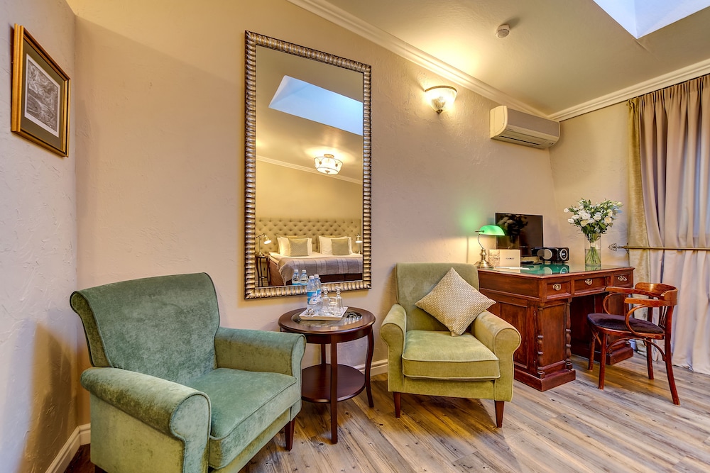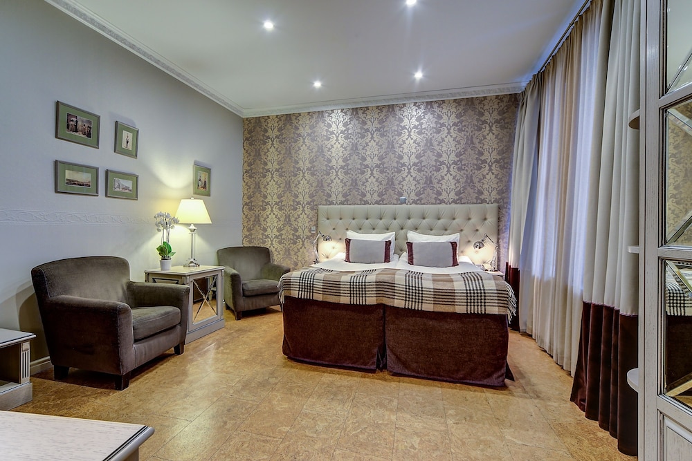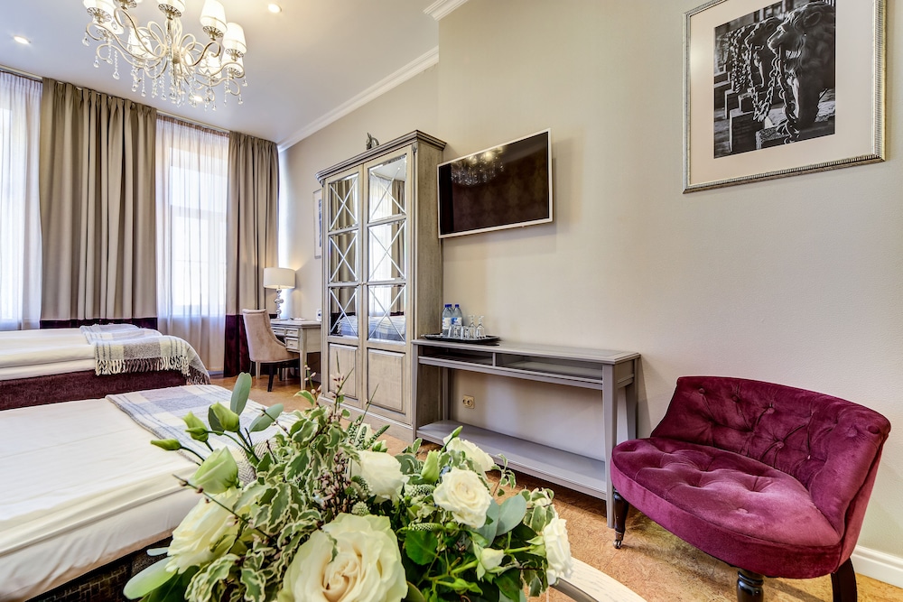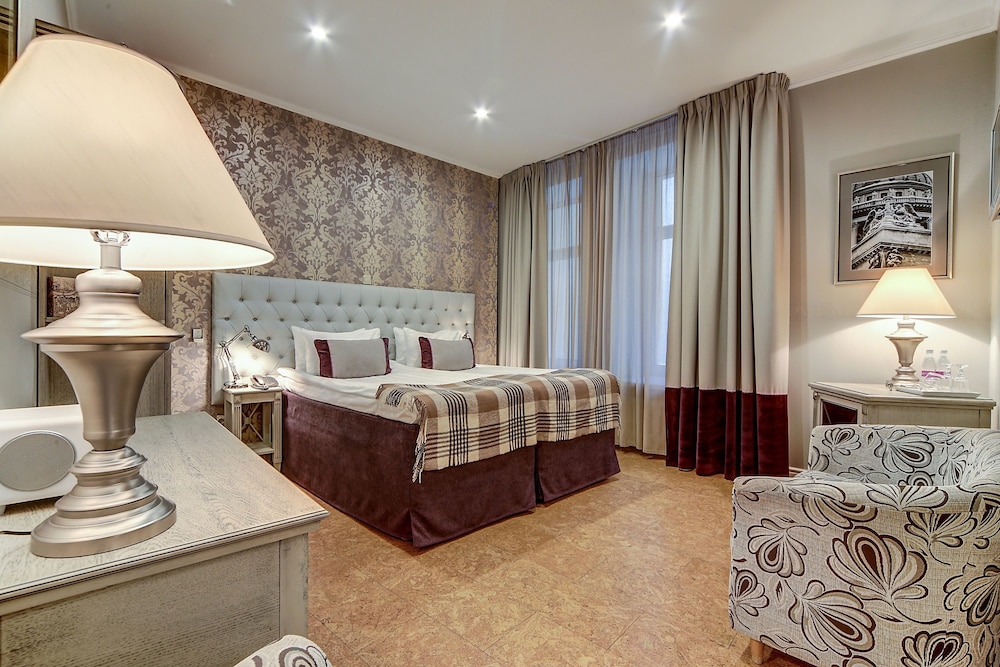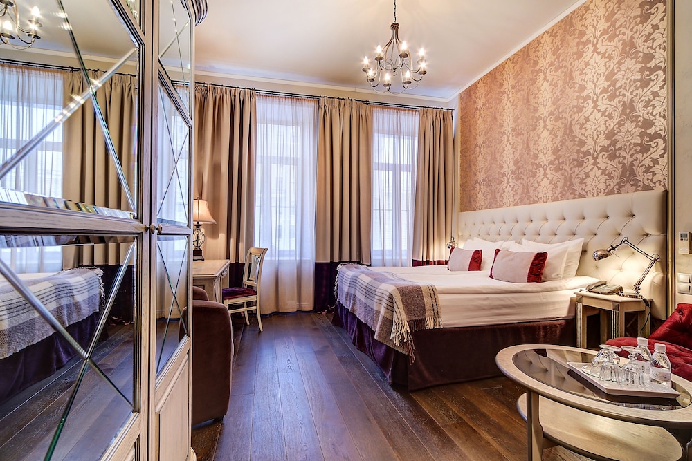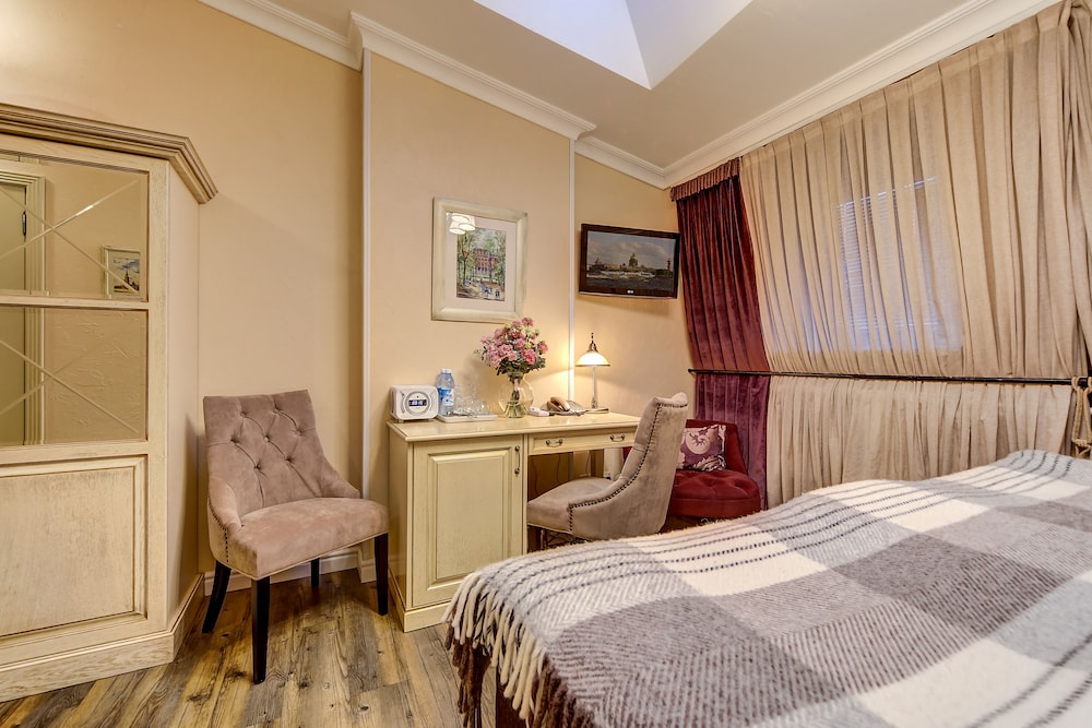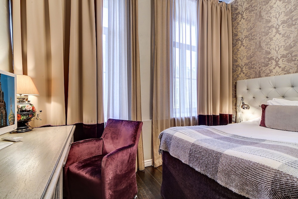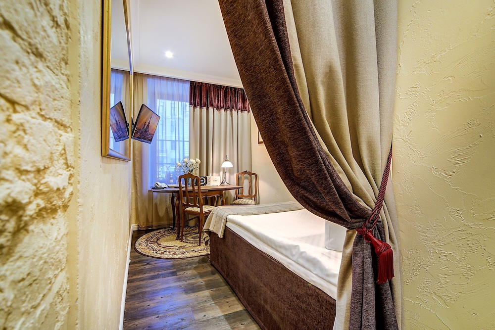 I loved my single room. It was on the courtyard on the ground floor but totally private. The staff was amazing and helped me get a dress shortened for an event, and were also fun to talk to. They were open to my student son and his girlfriend talking for a long time in the little foyer. All together a great place to stay, steps and a short ride in a taxi to many attractions, amazing proximity to Palace Square and the Hermitage, lovely restaurant that is open late (fish is excellent), and nicely decorated, homey rooms. Will be my go to on all visits.