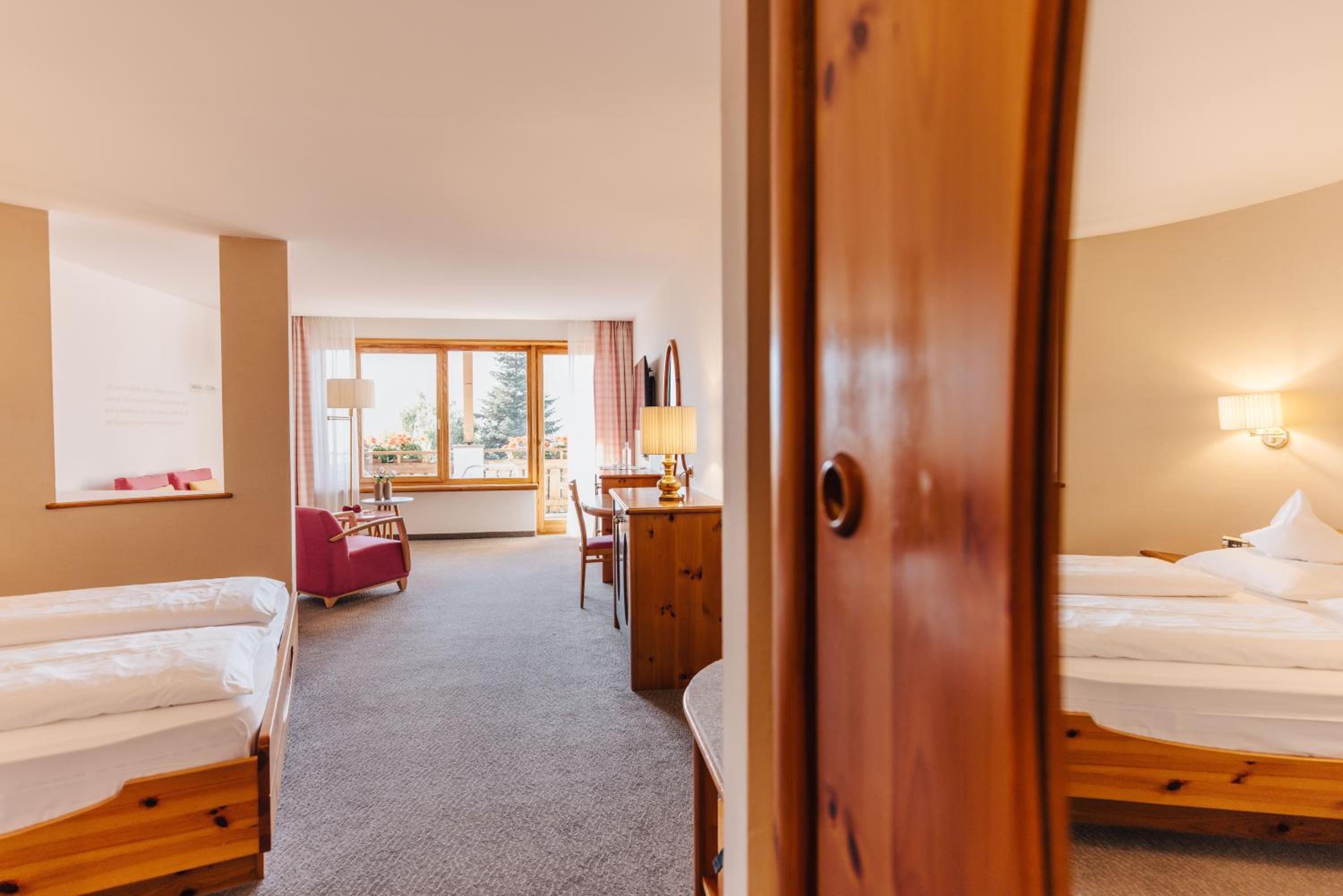 Hotel Hohenwart offers a modern wellness area with saunas, beauty treatment rooms, and a top-floor terrace with a pool, providing stunning views of the surroundings.