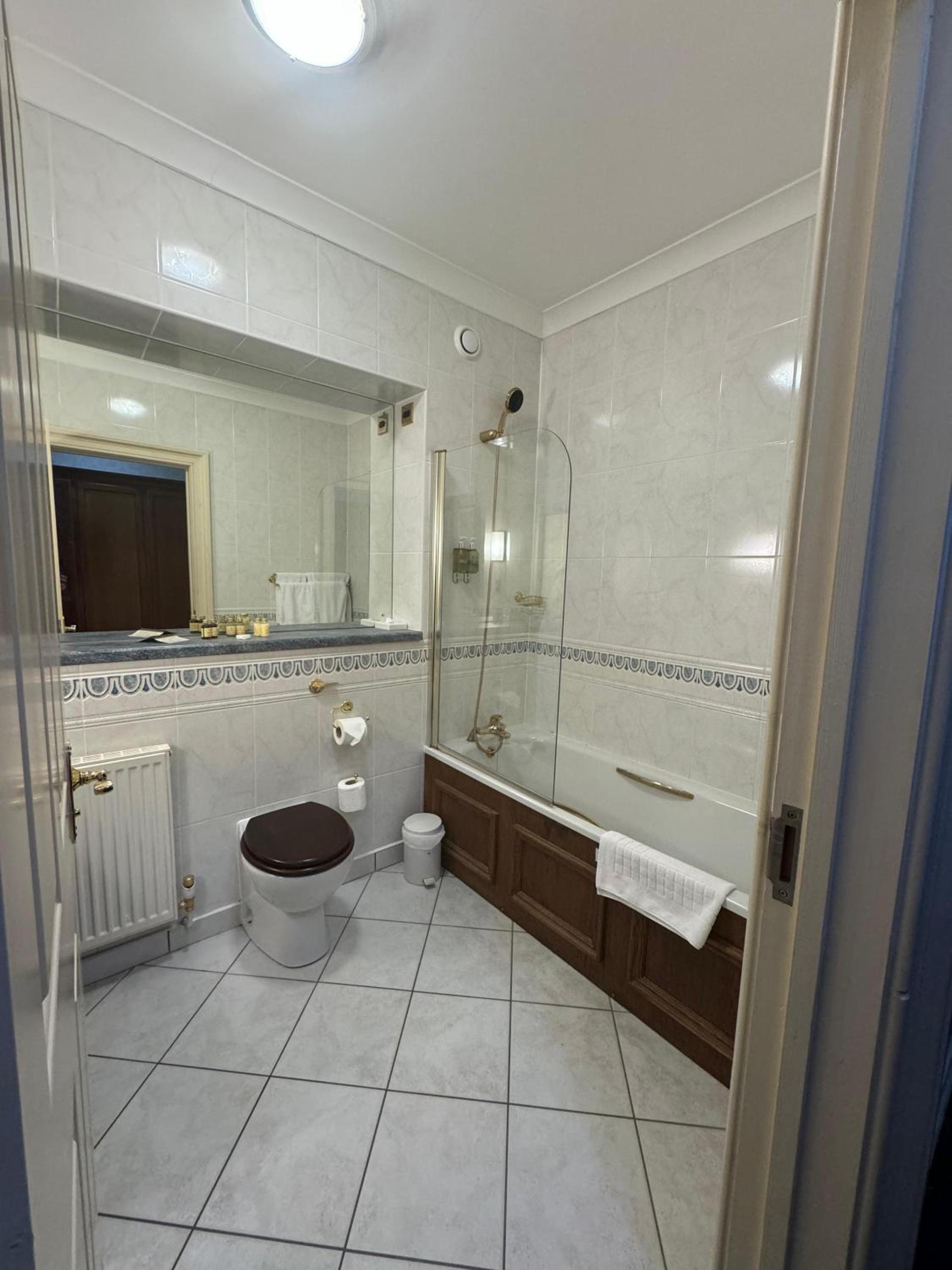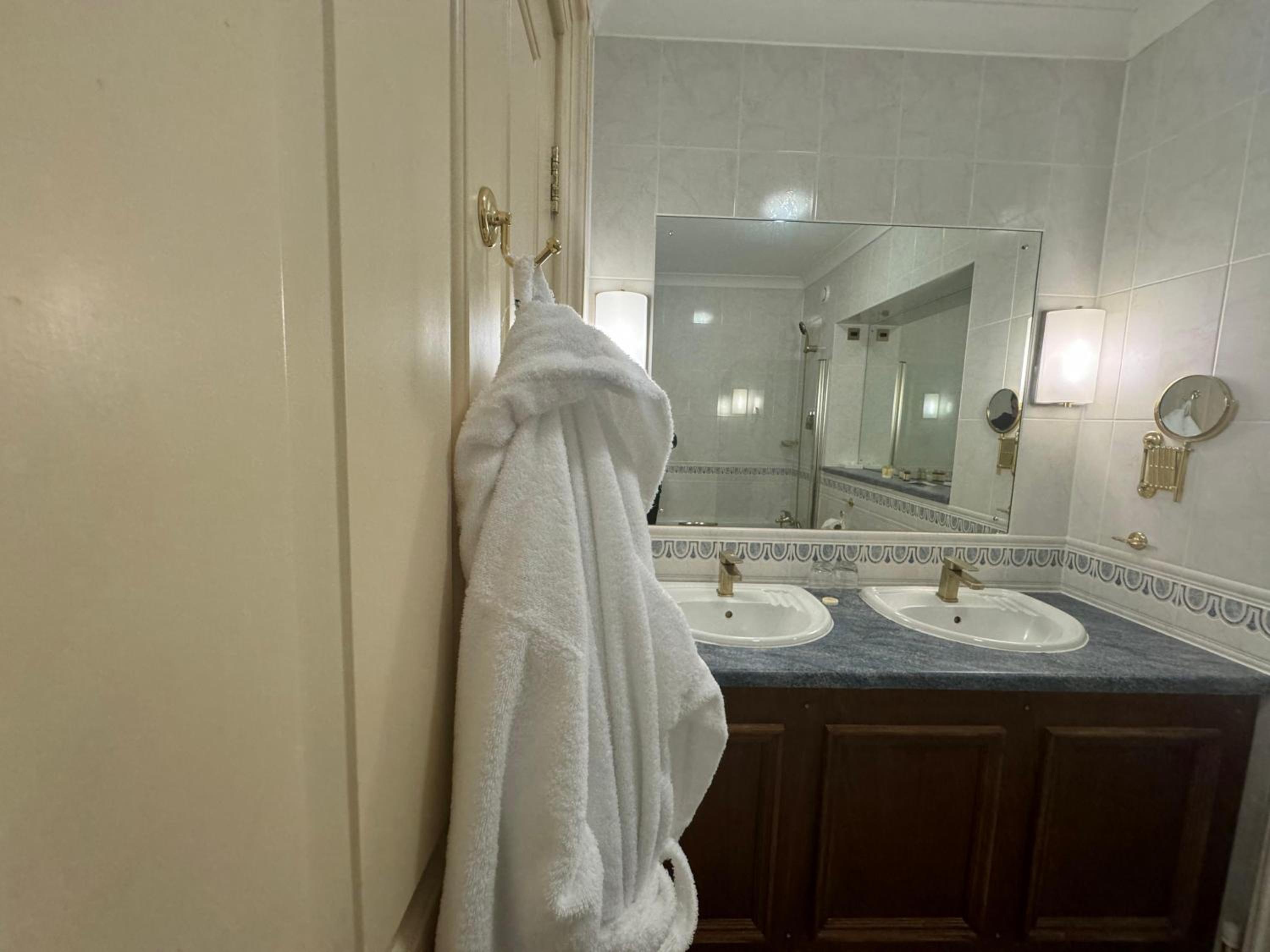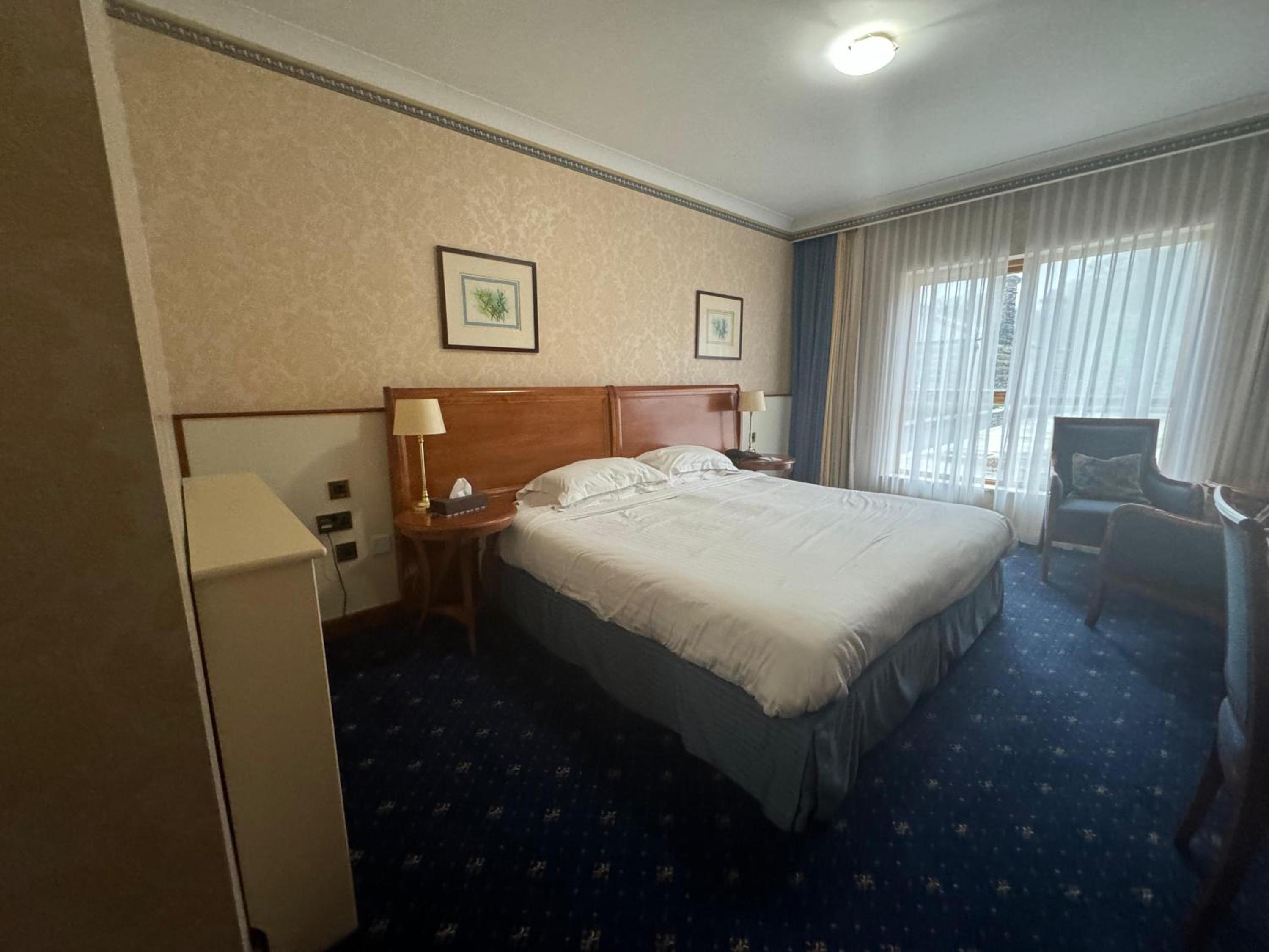 The room is dated. No bathrobes although these were advertised -we were told they were for spa use only. Eventually we got some with broken loops. Room safe did not open and could not be fixed. Bathroom fittings worn and towel rail bent. Old soap containers, almost empty. No tissues, biscuits, fridge, pencils or any other 'niceties'. Broken light shade on bedside light. Mismatched clothes hangers. Phone did not work. Carpets old and patched with tape. Room was not made up on first day and we were later told that this was only done if the 'make up room' tag was hung on the door. No lift for upper floors available. There is a billiard room. Some of the cues are broken and beer glasses there on the first night were still there Monday morning. You can't charge anything to your room. I could go on. Absolutely shoddy and not worth the money. It's the most disappointing hotel I've stayed in in 50 years of travelling.