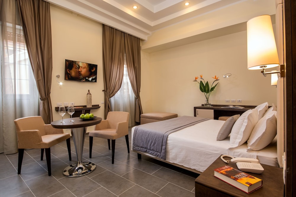 Booked based on other reviews. Very clean and fabulous location . The room is spacious enough as many rooms in Rome are tight. The beds are ultra firm and pillows flat as many in Rome. Here’s the difference, Marco and Pierre at the desk which by the way, is operated 24/7, they gave such incredible personal service far above any other hotel we have been in n Rome. They make the difference!!We are touring all day and only sleeping there. The bathroom was recently renovated with a rain head. Bar in the hotel. Would definitely stay again. Can’t say enough about Marco and Pierre. 5 star customer service!!!