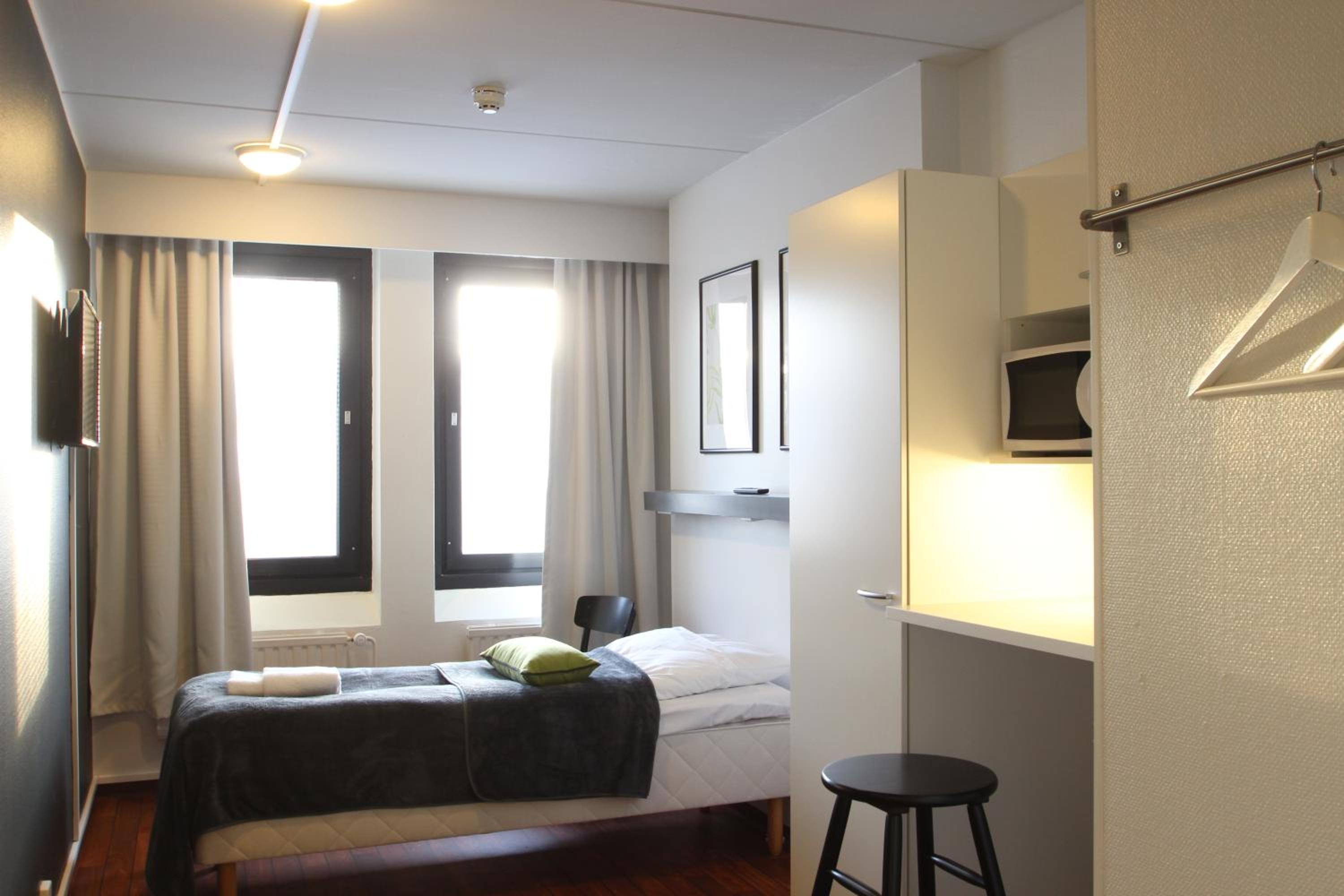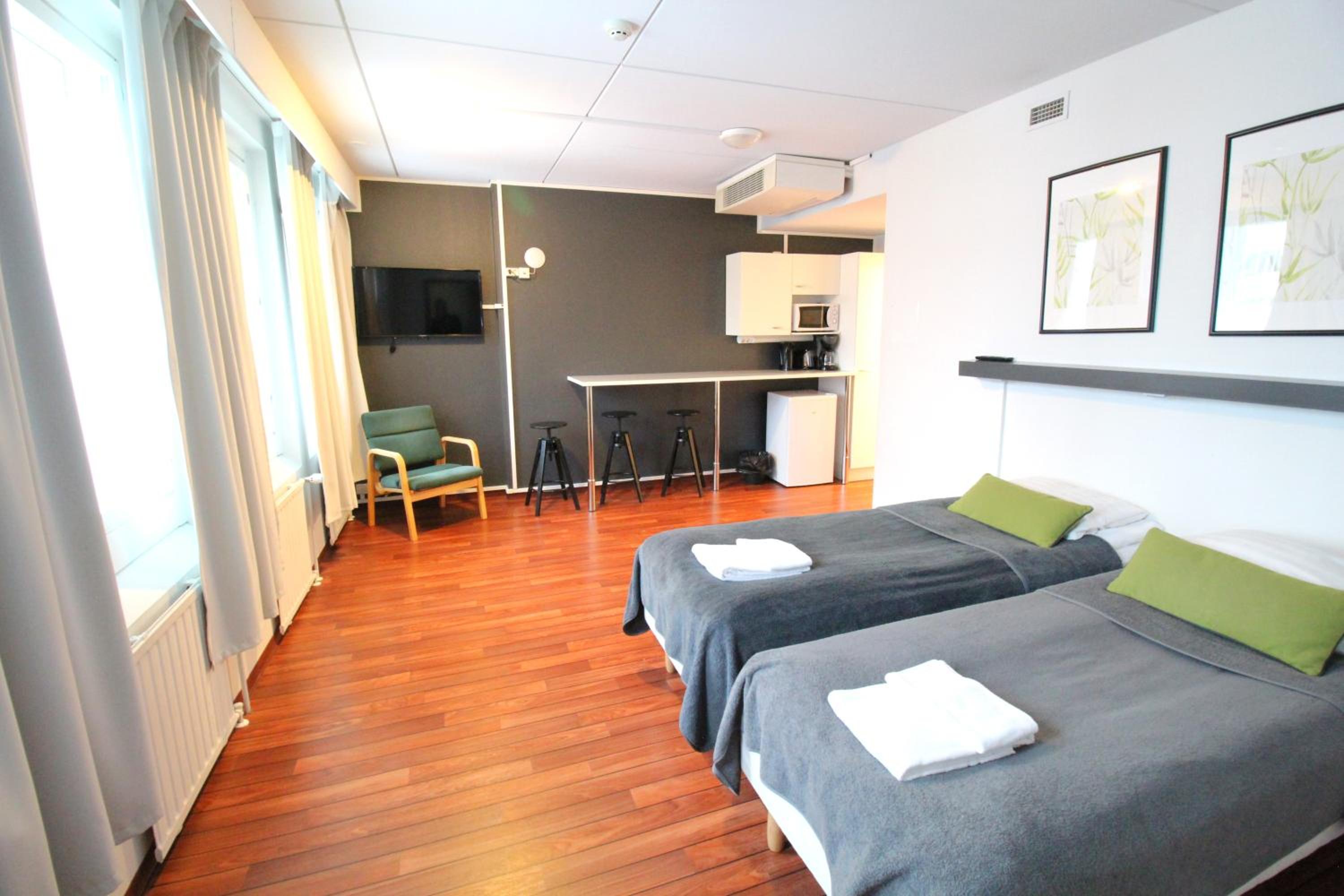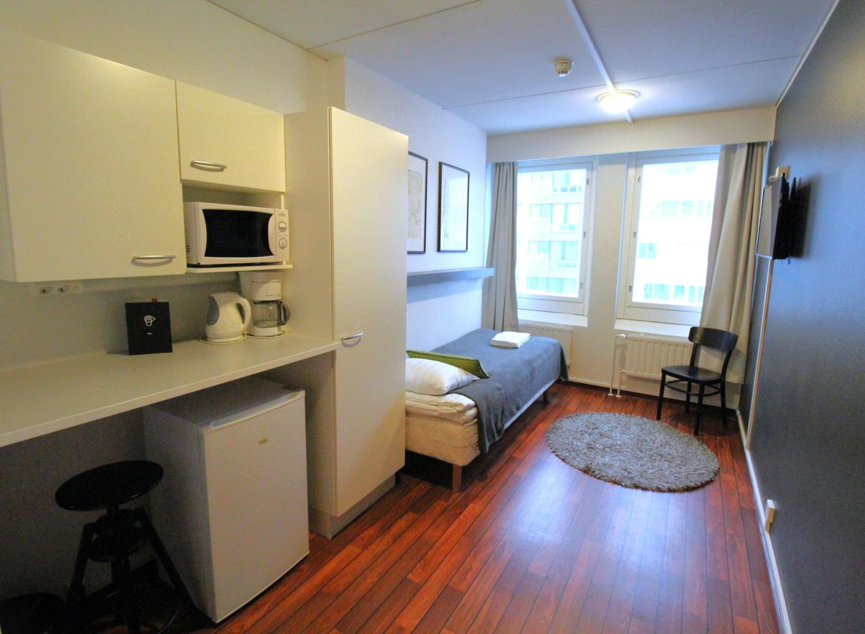 Sijainti tarpeeseemme oli erinomainen. Huoneesta löytyi kaikki tarvittava oleiluumme. Jääkaappi, mikroaaltouuni sekä muutamat astiat olivat plussaa.