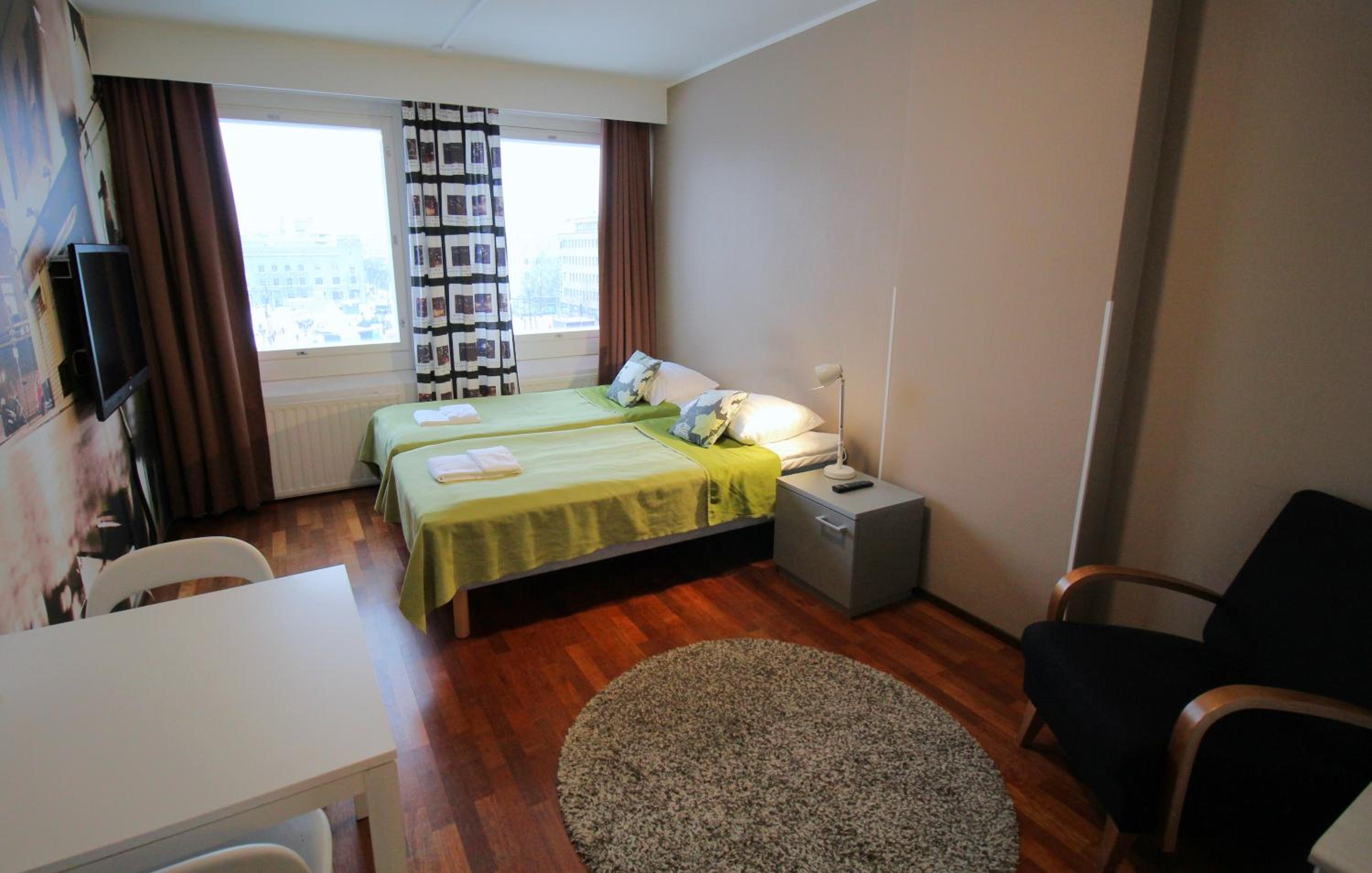 Sijainti erinomainen, jääkaappi, mikro, kahvinkeitin plussaa. Hintaansa nähden ok.