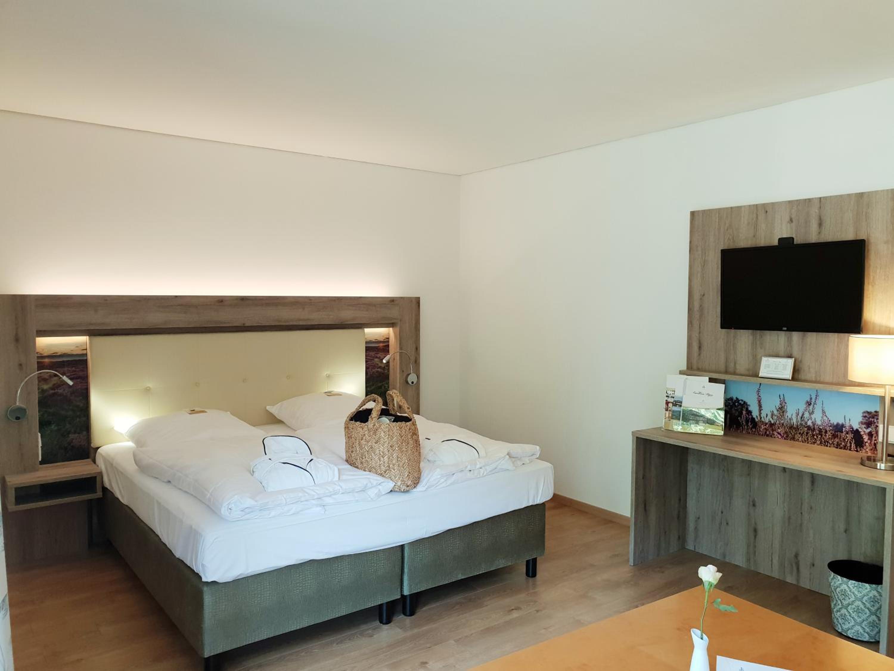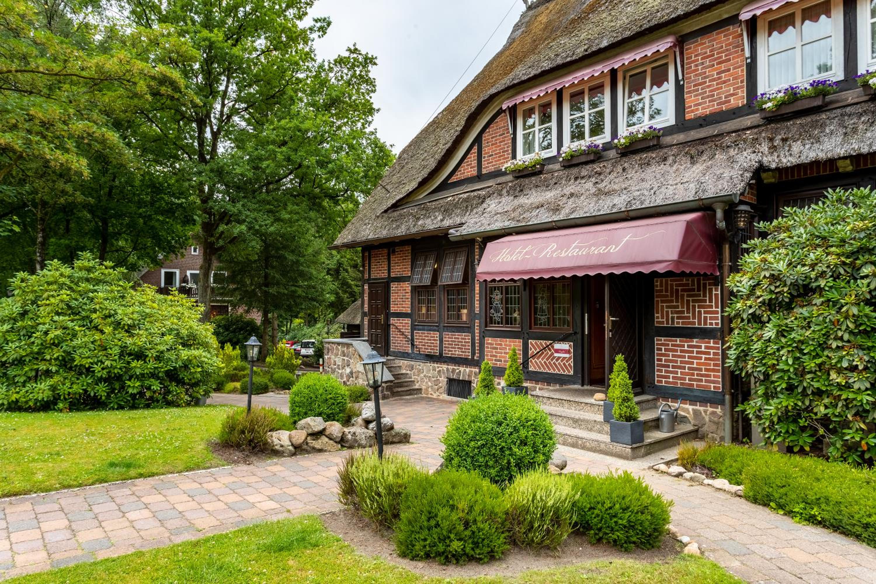 The holiday and seminar hotel "Landhaus Höpen" offers luxurious accommodation in a peaceful area within the Höpen Nature Park. The rooms are elegantly designed, showcasing a perfect blend of elegance and rustic charm. Guests can enjoy the extraordinary ambience under a roof made of reeds, providing a unique and cozy atmosphere.