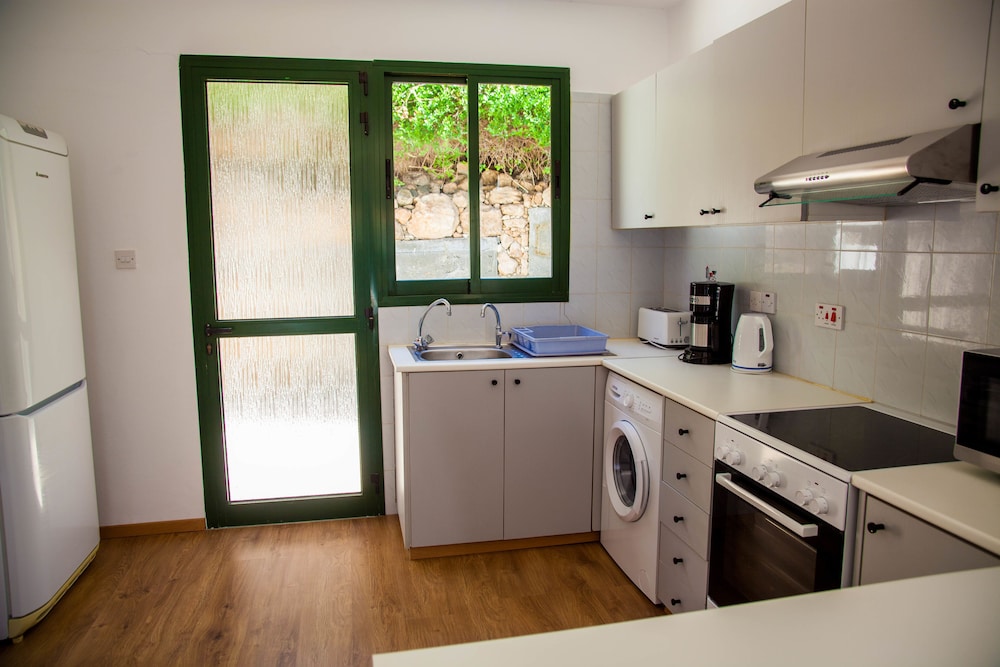 Die sehr ruhige Apartmentanlage liegt ca. 400 m von der Hauptstraße entfernt auf einem Hang über Bananenplantagen und Gärten. Die ca. 25 Apartments (meist zweistöckig) sind hell, funktional eingerichtet, haben Klimaanlagen, freies W-Lan. Im Oberbereich befinden sich 2 Schlafzimmer + Bad/WC. Unser Aufenthalt betrug 12 Tage. Die Restausstattung der Küche bestand nur aus einem Abtrockentuch + 4 Flaschen Wasser. Alles andere musste gekauft werden. Geschirr, Besteck sind unvollständig und unterschiedlich. Die Sauberkeit des Kühlschranks ließ zu wünschen übrig (wurde entschuldigt durch das Alter und der reduzierten Sehkraft der Putzfrau. Nur auf Anfrage wurden nach 7 Tagen die (verschlissenen) Badetücher gewechselt. Der Verwalter ist sehr freundlich und hilfsbereit. Es ist sehr empfehlenswert, einen MIetwagen zu haben, da es zum Zentrum von Pafos ca. 10 km sind, die Bushaltestelle ca. 700 m entfernt liegt, LIDL ca. 7 km entfernt ist, die Attraktionen dieses Teils Zyperns weit entfernt liegen und schlecht mit öffentl. Verkehrsmittel zu erreichen sind. Das nächste Restaurant ist ca. 600 m entfernt. Die Strände (ca. 2 km) sind grobsandig/kieselig, etwas ungepflegt, aber sehr klares Wasser.