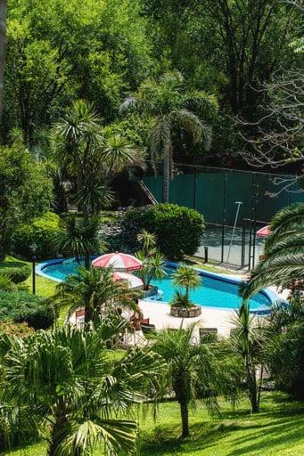 las piscinas hermosas: una con agua natural afuera, otra climatizada afuera, y otra climatizada cubierta
