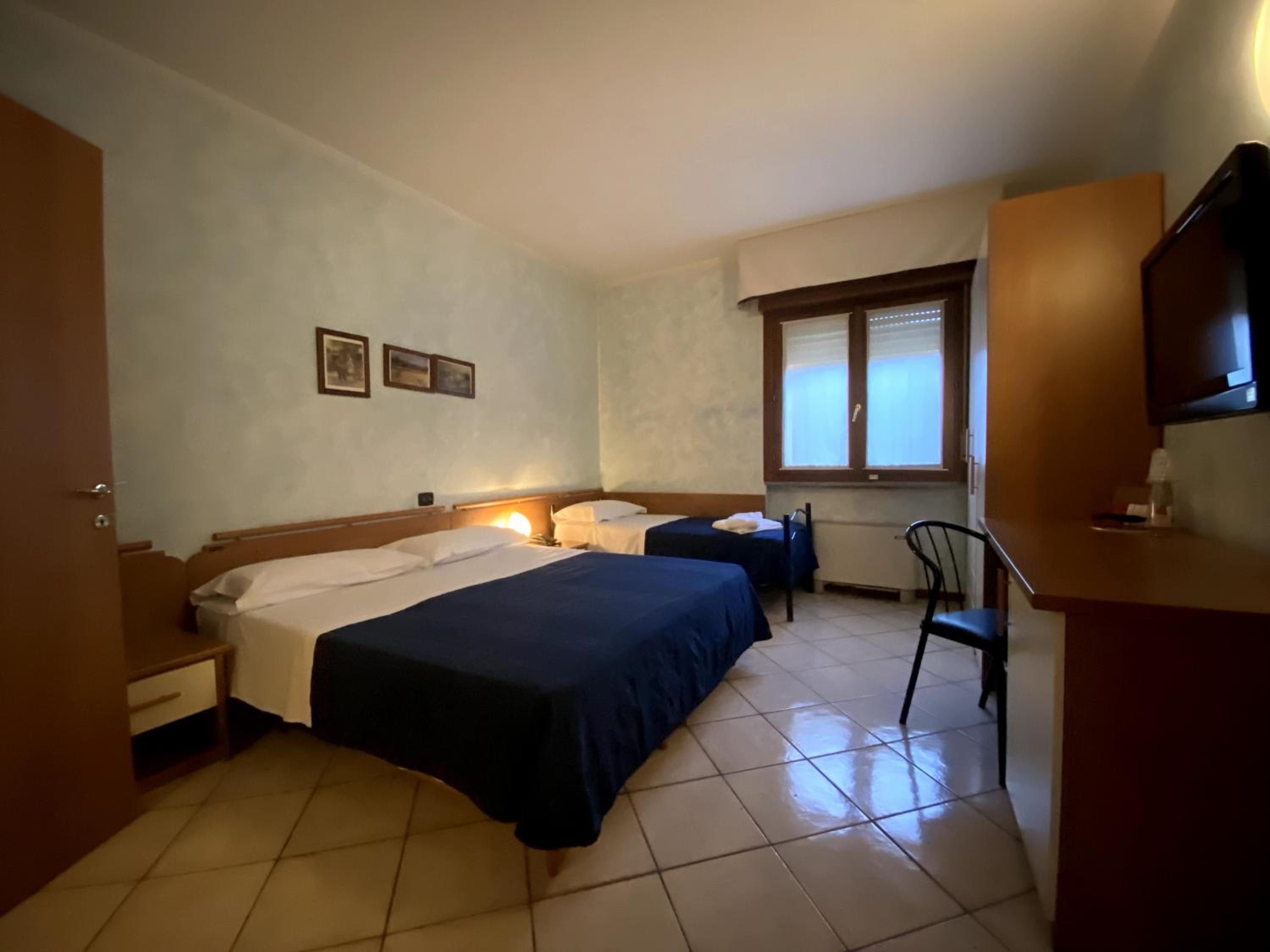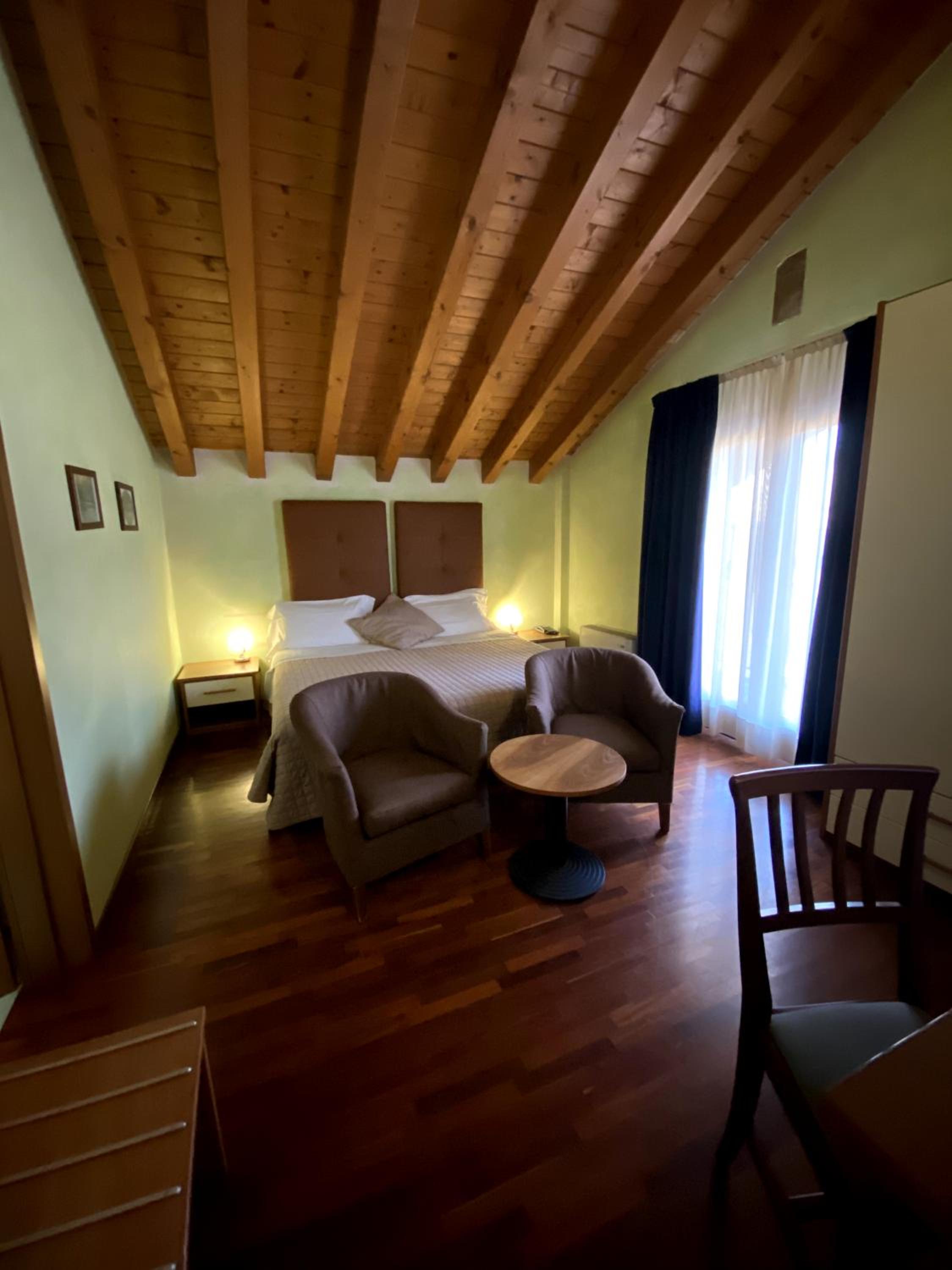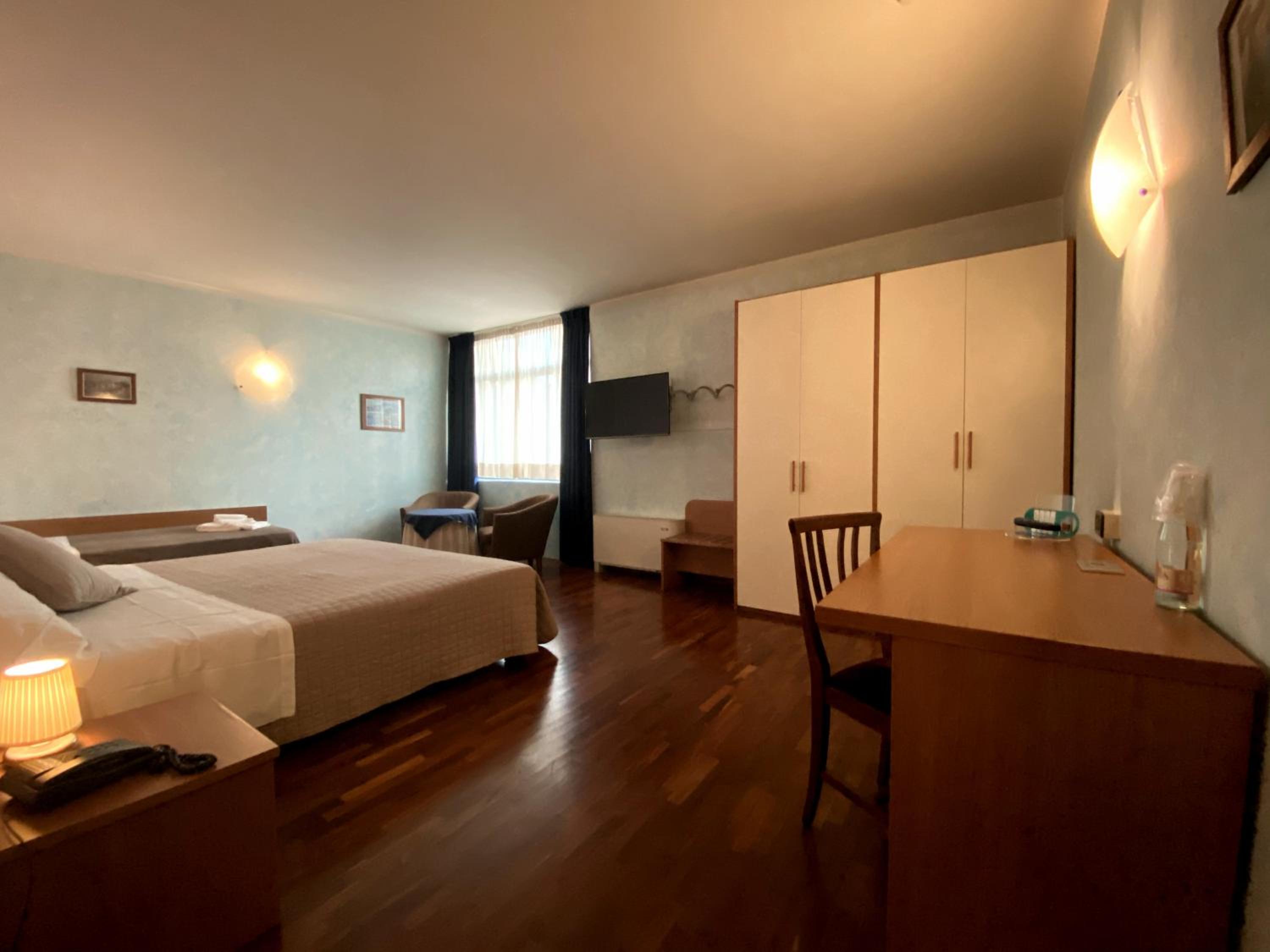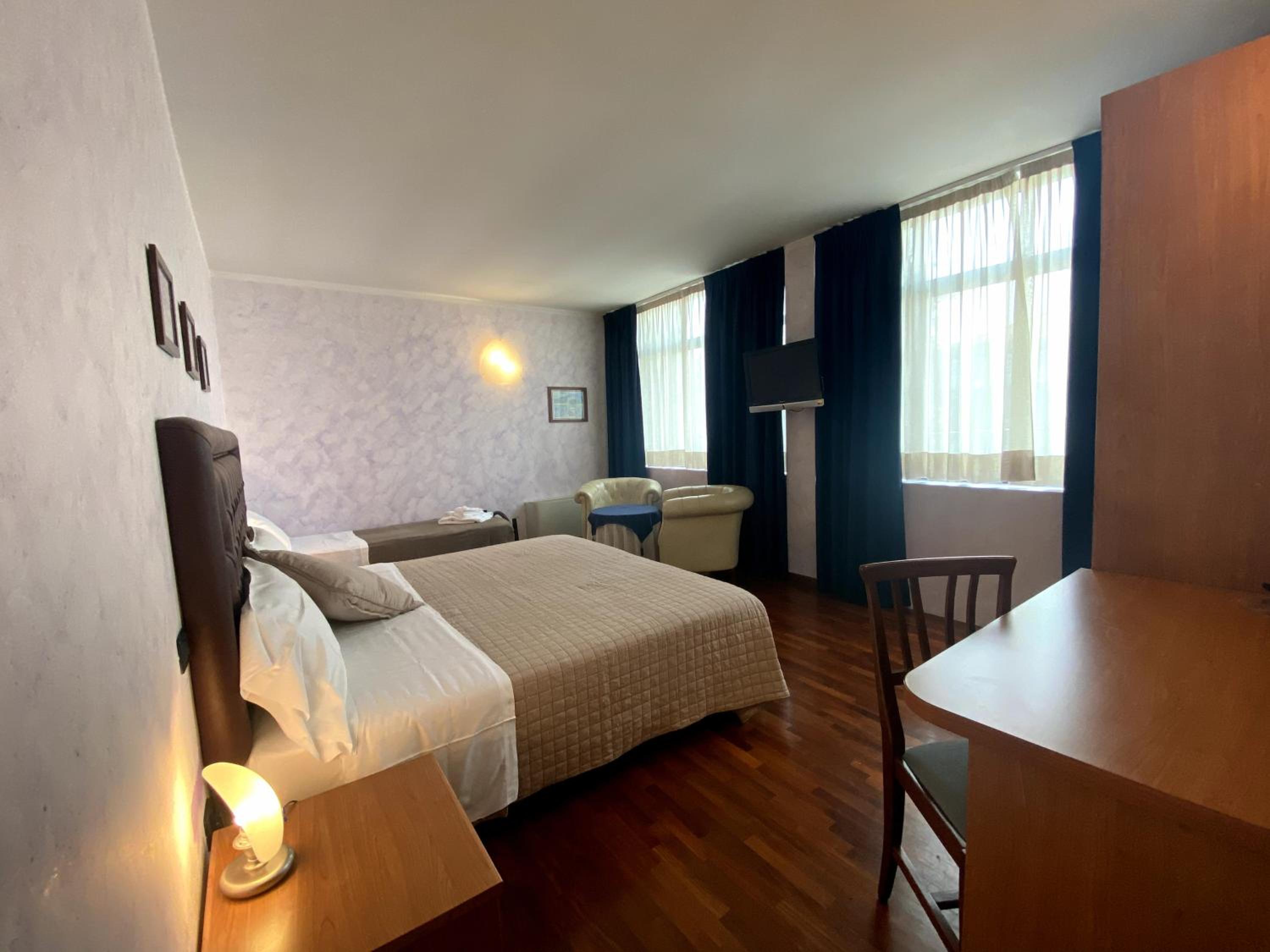 The hotel boasts air-conditioned rooms adorned with classic décor and equipped with modern amenities like a flat-screen TV and a private bathroom with a hairdryer for a comfortable stay.