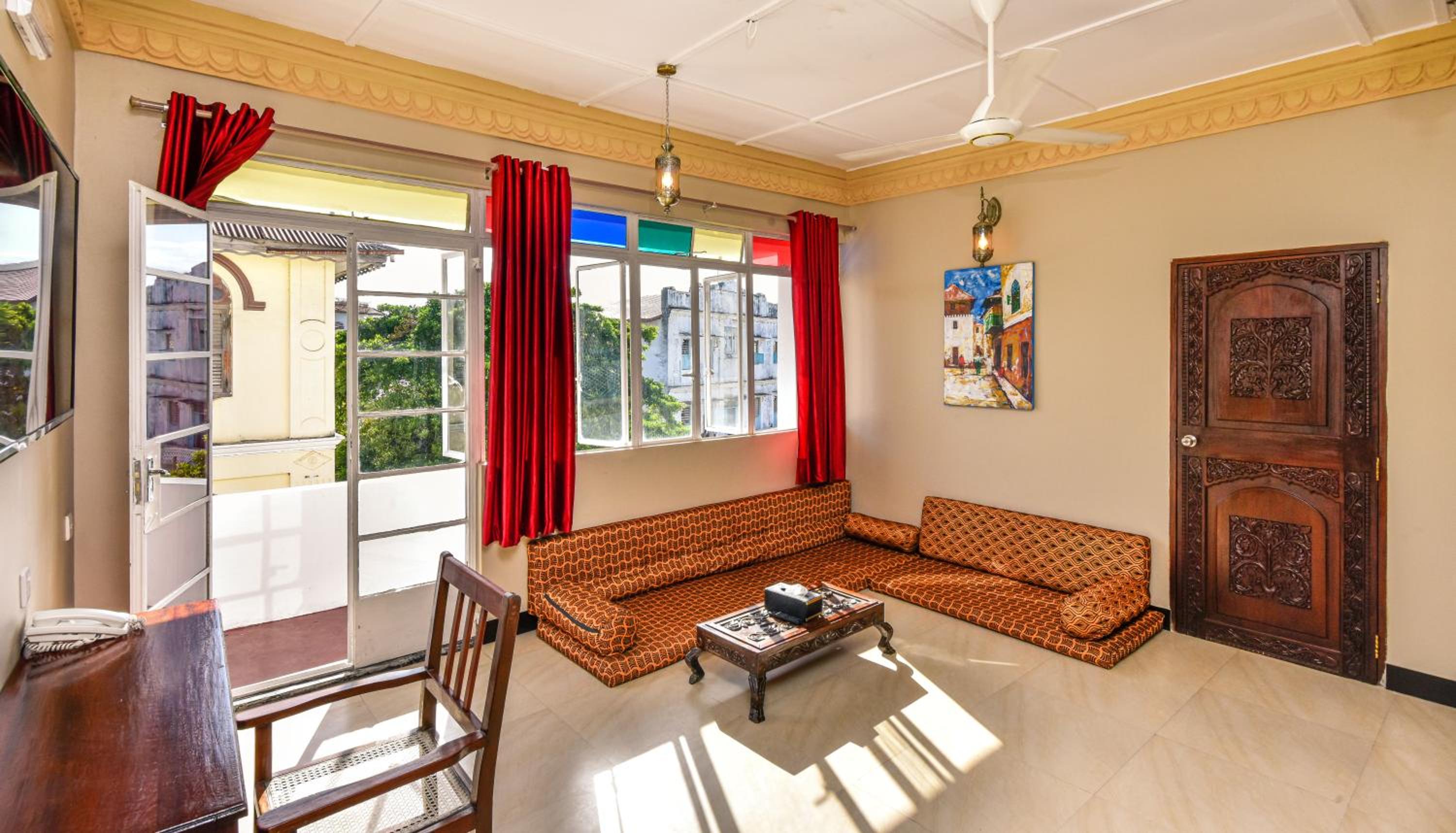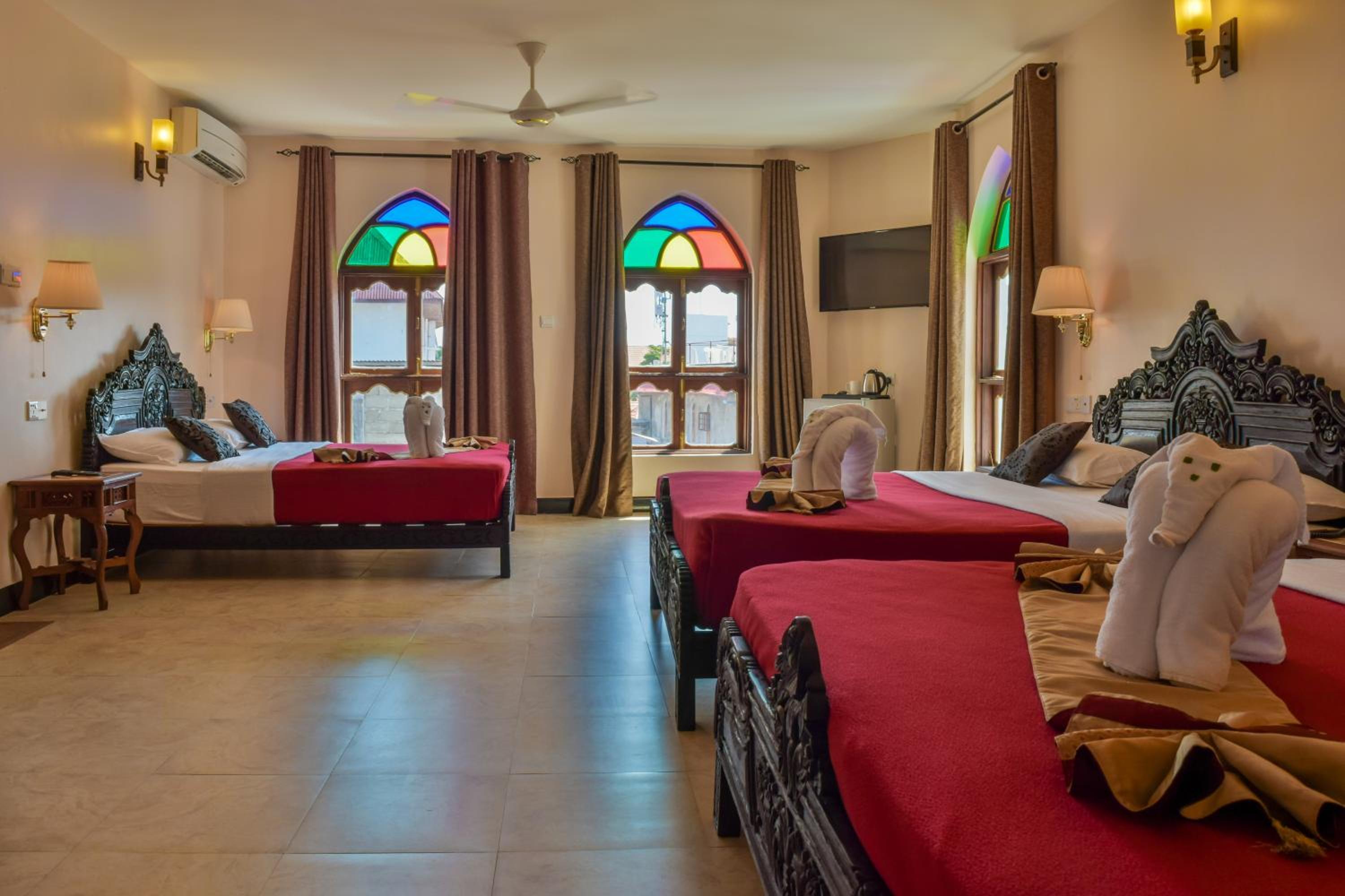 The Tembo House Hotel in Zanzibar City seamlessly blends historic charm with modern comfort. Each room is elegantly decorated with wood carved furniture and features a Swahili four-poster bed. Enjoy the convenience of amenities such as TV, air conditioning, and a traditional hammam bath in the bathroom. Most rooms also offer stunning balcony views of the sea or the pool.