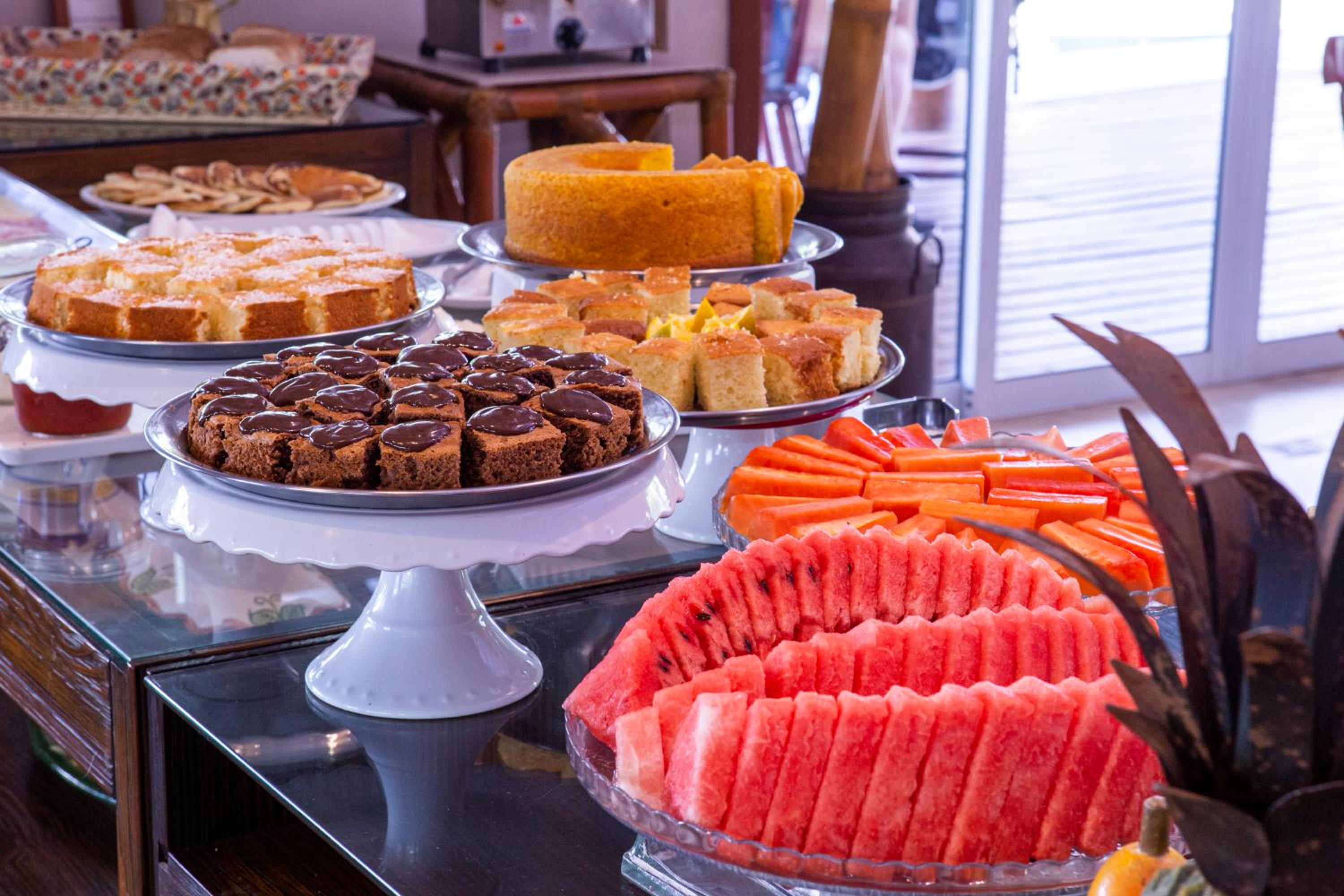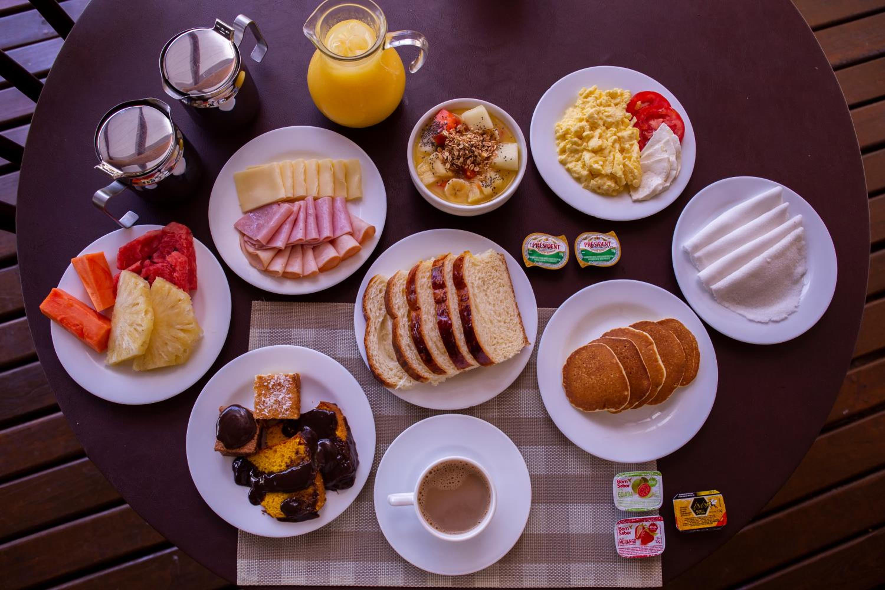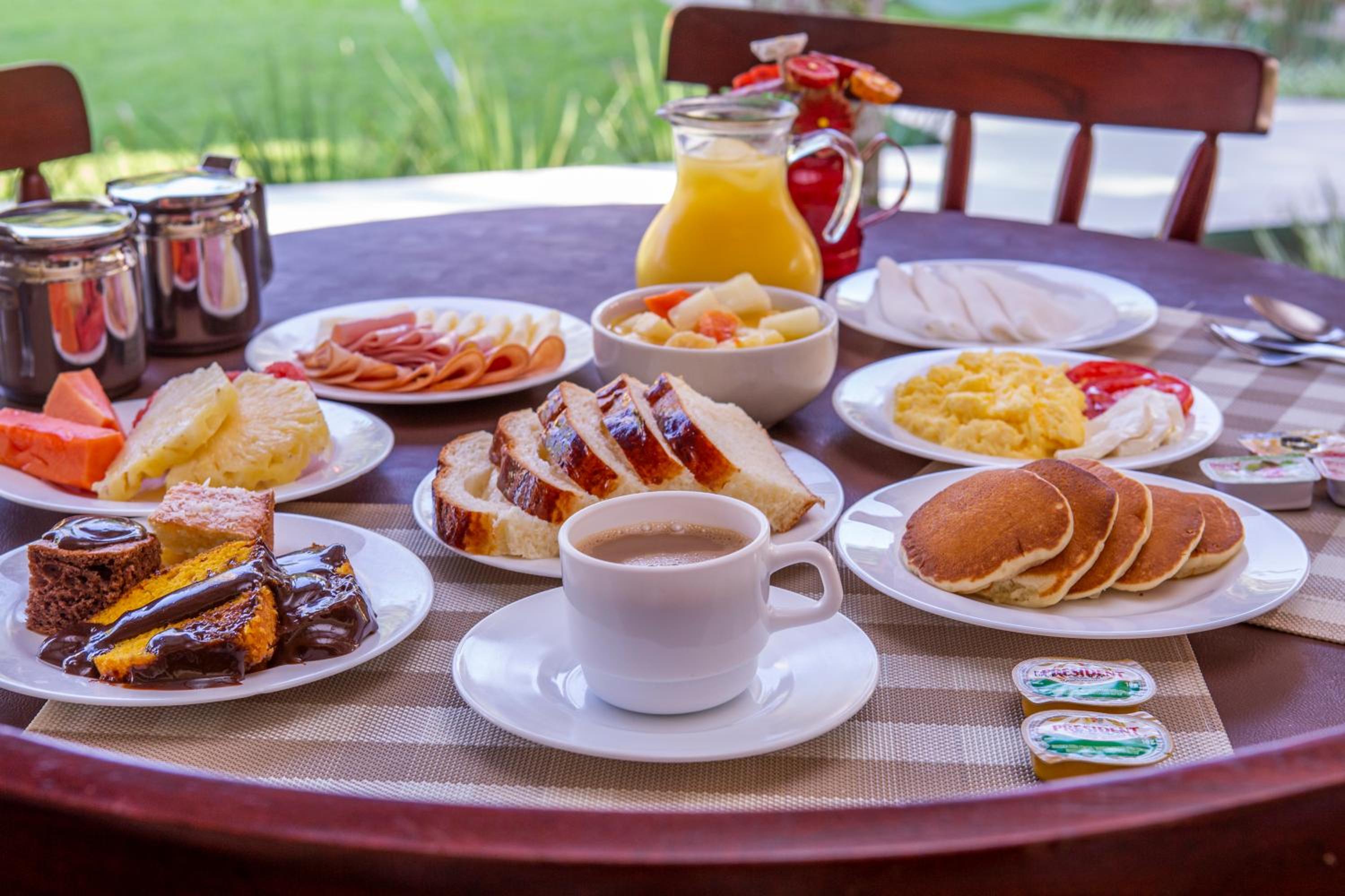 O café da manhã e bom, mas poderia melhorar. Ter mais variedade de frutas e sucos, principalmente.