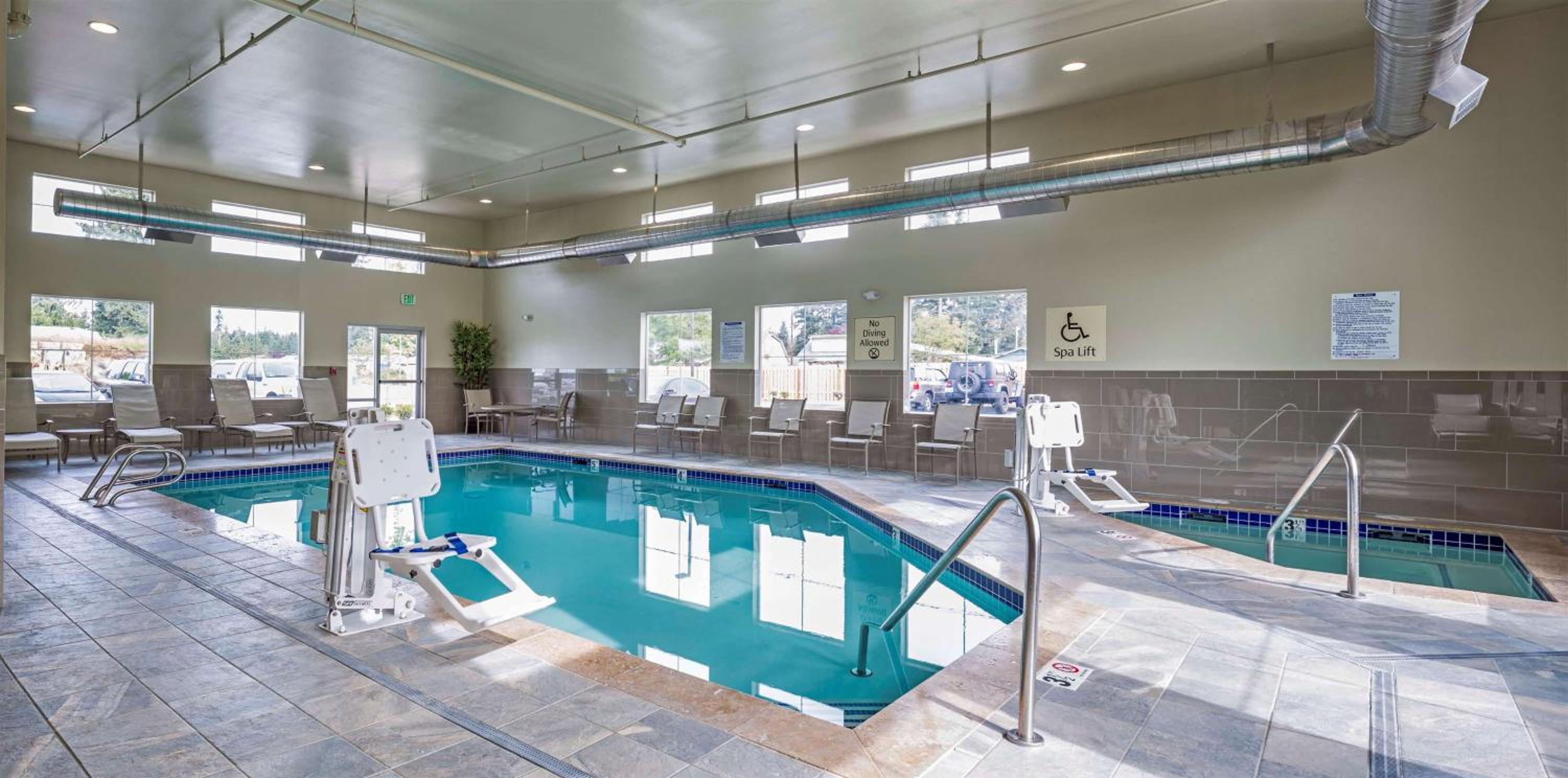 Relaxation Galore: Indulge in the indoor pool and hot tub or unwind in the shared lounge. The hotel also features a 24-hour front desk for your convenience.