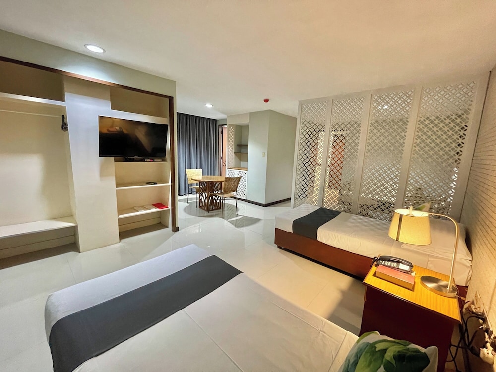 The hotel reception is nice but once we were on our floor the atmosphere changed. There were places which has the lights off and it has a creepy feel on it. We asked for a room for 4 people and another double room. However we were disappointed to find out that both rooms are double standard rooms and they are just going to add 2 more beds. We don't mind that kind of set up if the other room is spacious enough to accommodate 4 beds. But that's not the case. The room was so small that it cannot accommodate the 4th bed. 2 of our friends ended up sharing on a single bed. There was only 1 slipper for each room and the hot shower in one room is not functioning. WiFi is weak in most areas of the room as well. We felt like they needed some renovation as some things looks ancient.