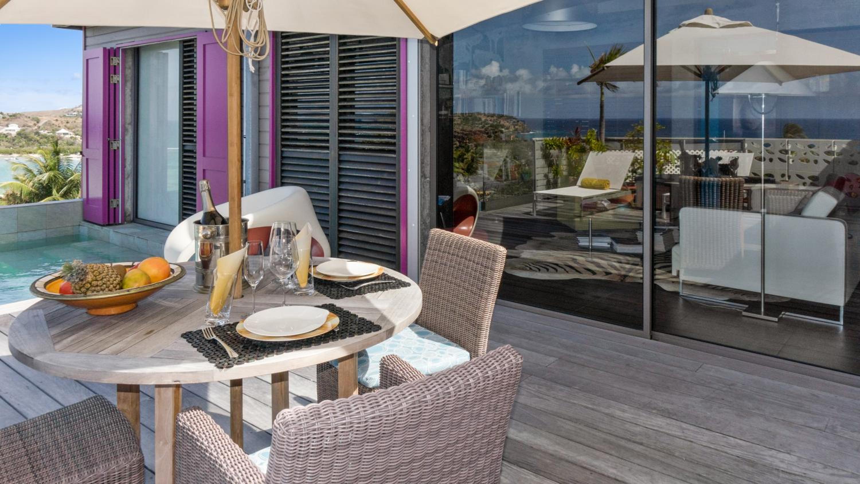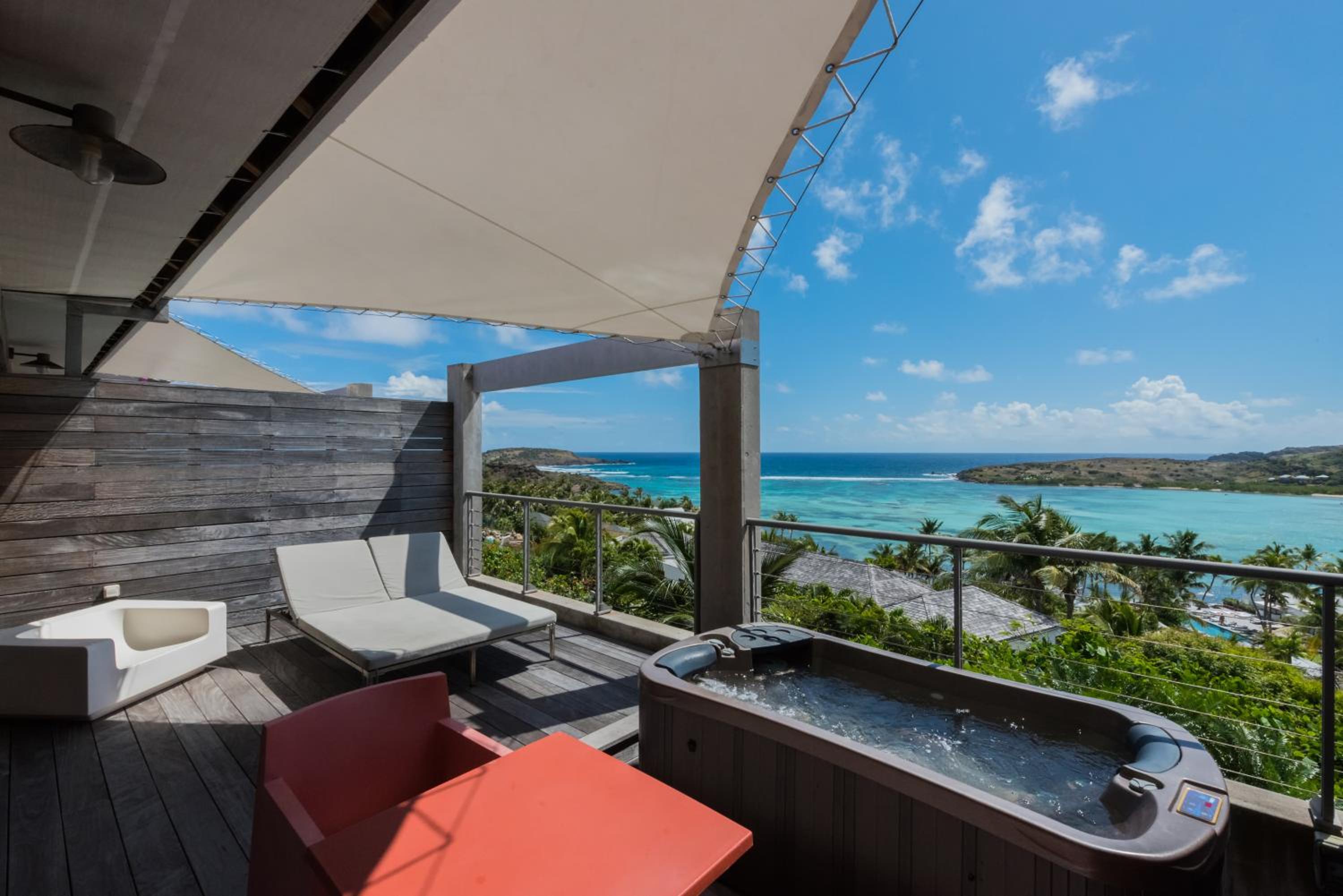 We loved our stay at Hotel Villa Lodge 4 epices! The property is small and quiet with a beautiful view of Grand-Cul-de-Sac. It's walking distance to the Rosewood and several other hotels making it convenient to enjoy their restaurants and beaches. Our room was large and comfortable with a convenient little kitchen and a large patio with hot tub and chaise lounge. Edwina the property manager took excellent care of us and we could not appreciate her more! Hope to return again soon.