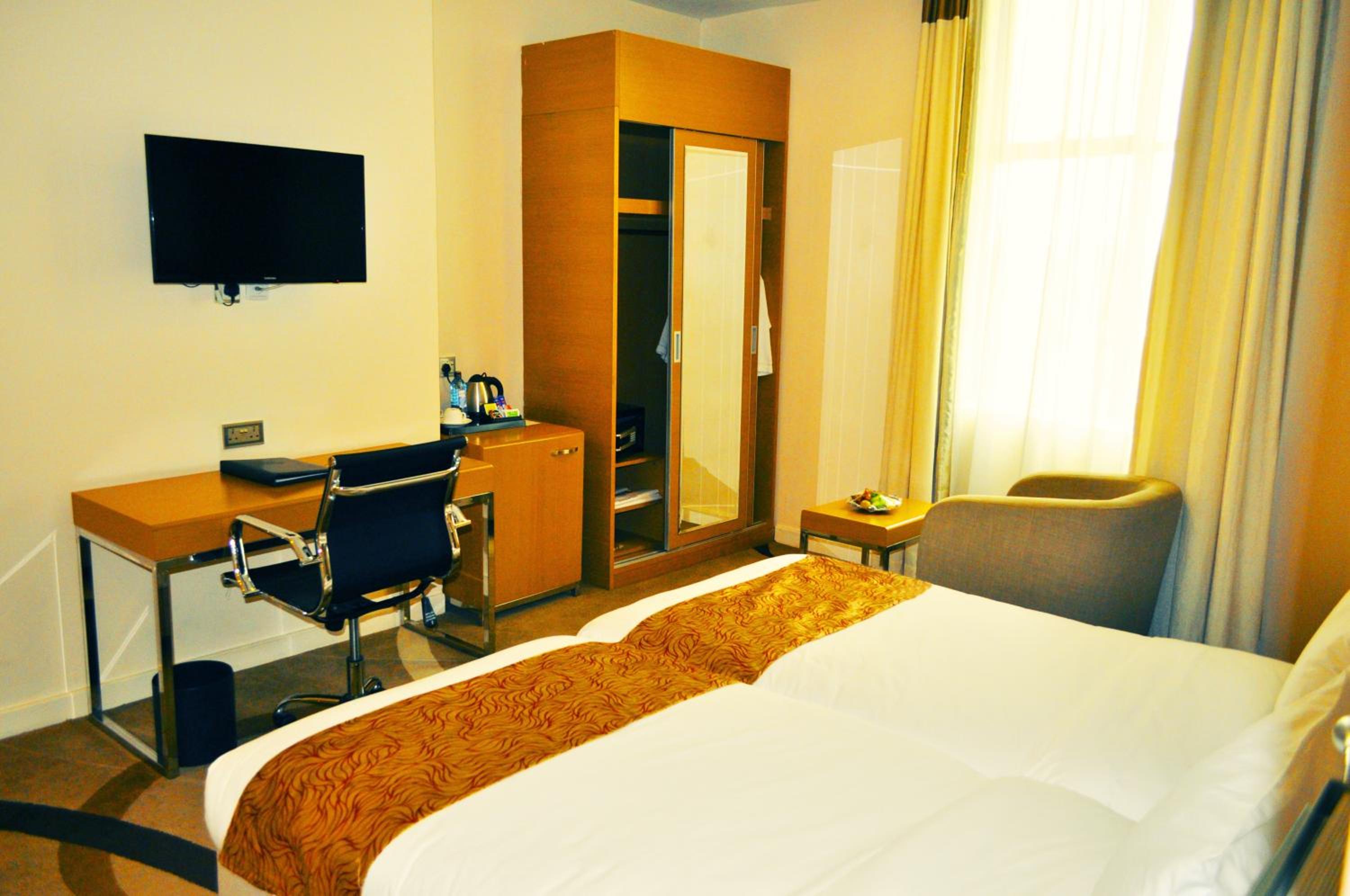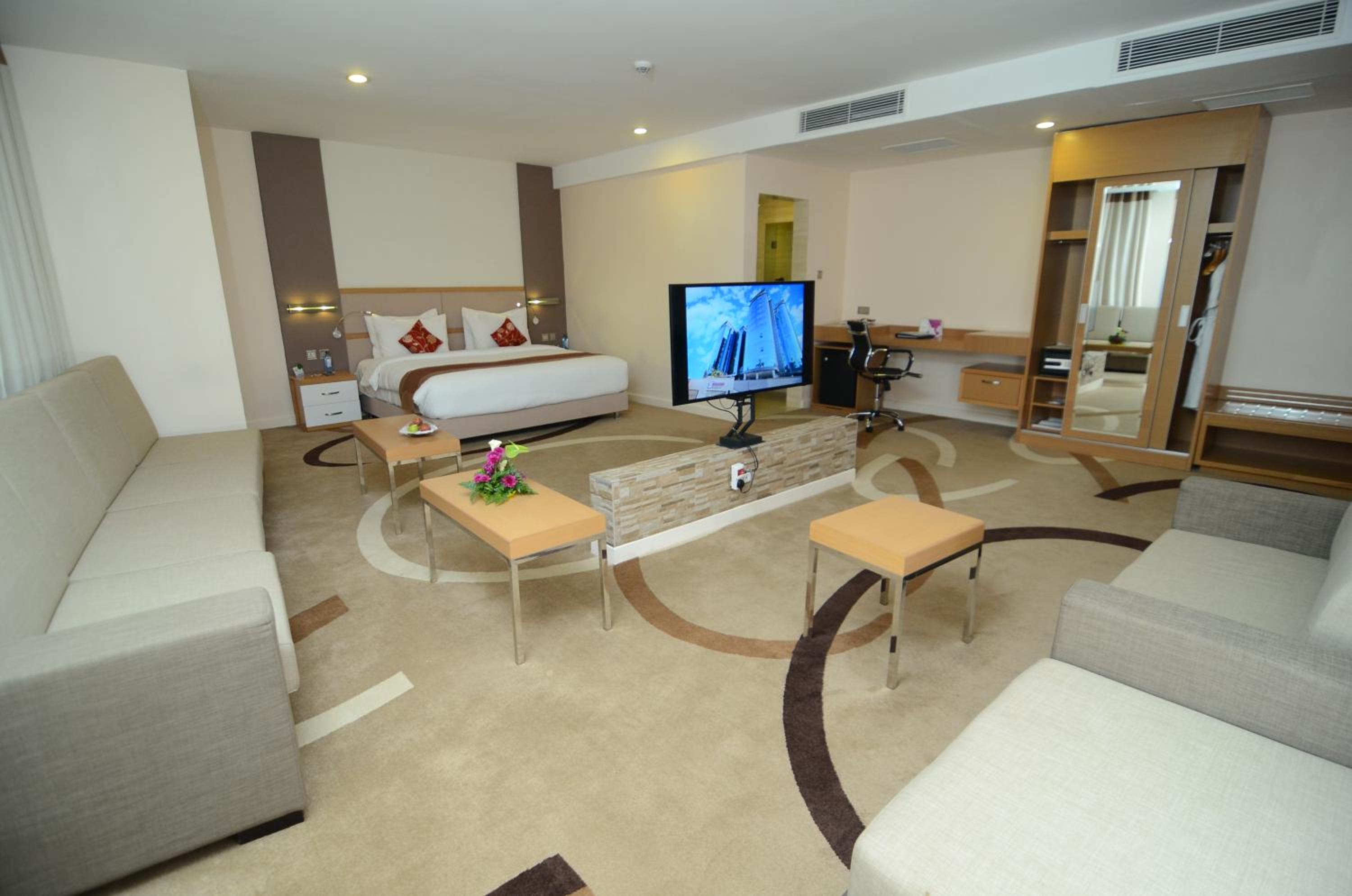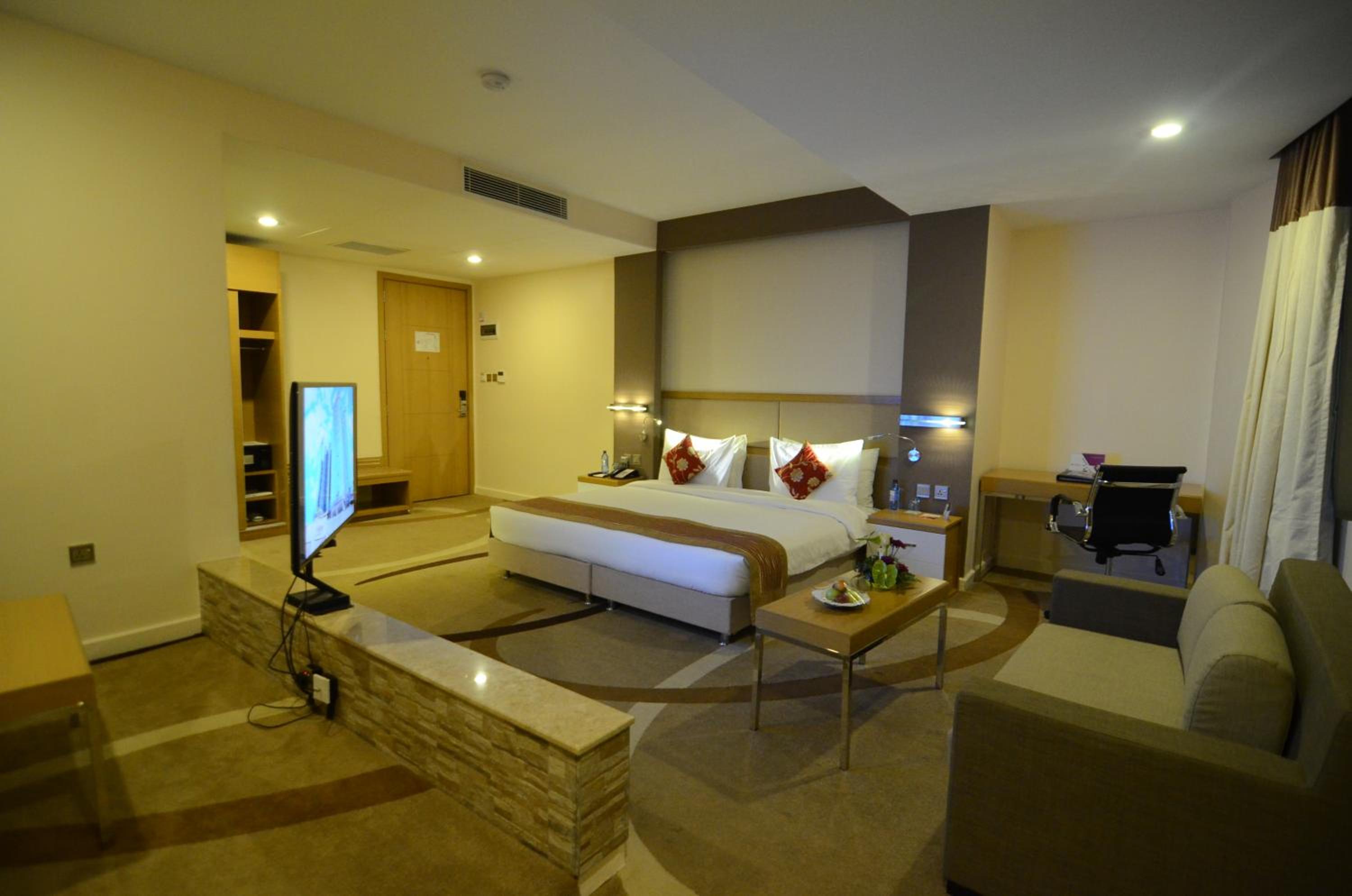 PrideInn Azure Hotel Nairobi Westlands offers elegantly decorated rooms with modern amenities, including a fireplace, flat-screen TV, and minibar. Relax in style and comfort during your stay.
