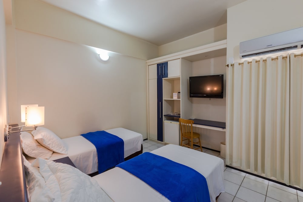 Nos colocaram num quarto no prédio anexo. Parecia estar em reforma. O quarto era muito simples, a janela estava suja de pó branco, não tinha toalhas, a água quente não estava funcionando, tinha um sabonete velho apoiado no basculante e não tinha nem onde pendurar toalhas. Demoramos um tempo até perceber tudo isso. Começamos pelas toalhas e fomos 2x na recepção. Até 21 horas a resposta é que a stoalhas iam chegar mas não tinha previsão (???). O atendimento é péssimo. Aliás, a experiência de atendimento em geral em São Luís foi muito ruim. No caso do hotel, os atendentes se esquivavam da responsabilidade e ficavam dando respostas evasivas. Só quando fomos a 4a vez na recepção e falamos que não íamos sair até resolver que nos trocaram de quarto. Daí fomos para a torre principal que o quarto era razoável. Parecia um quarto de motel mudado para hotel. O primeiro quarto era nota 2 e esse era uma nota 7.
