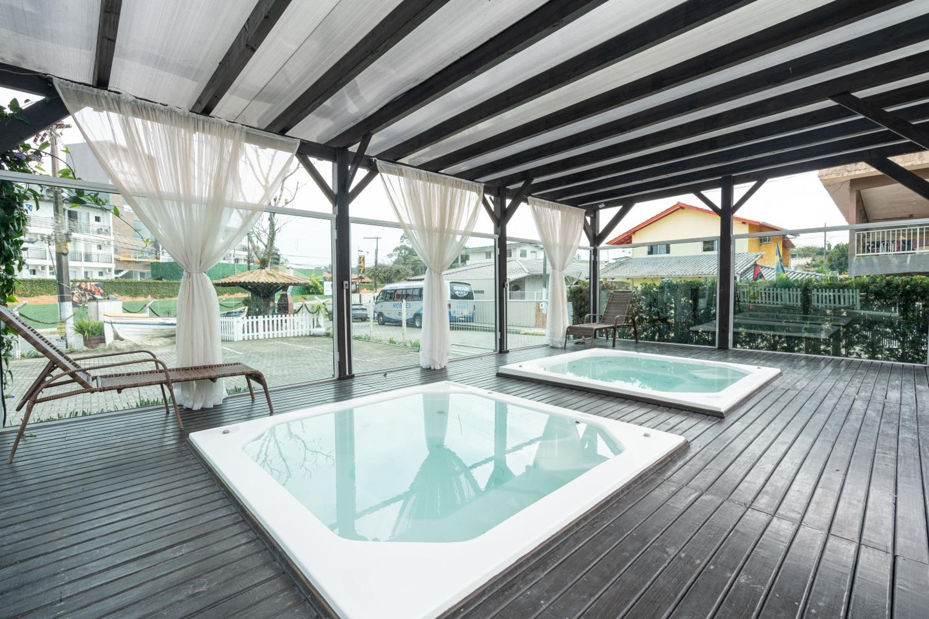 Quarto bom, porém o banheiro é sem janela acaba tendo cheiro no quarto, piscina boa, banheiras de massagem com água com cheiro e cor da água ruim