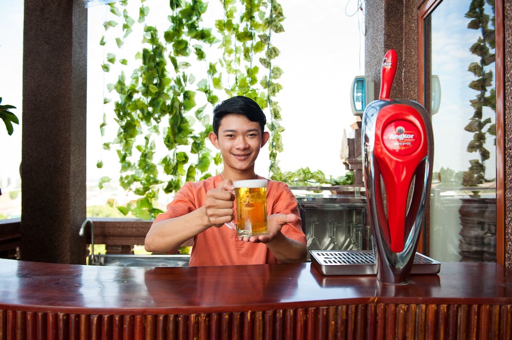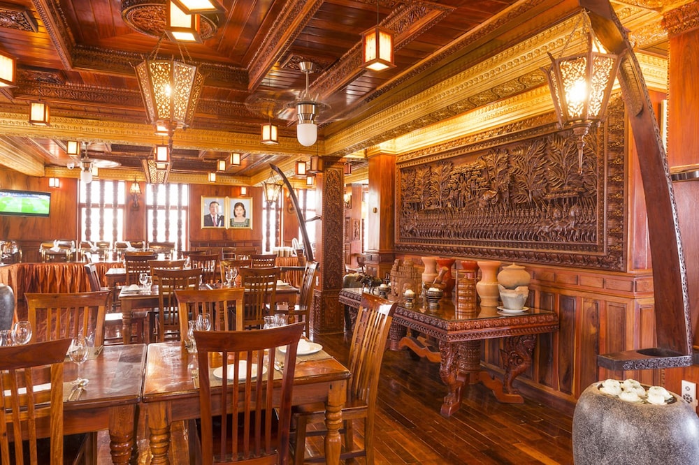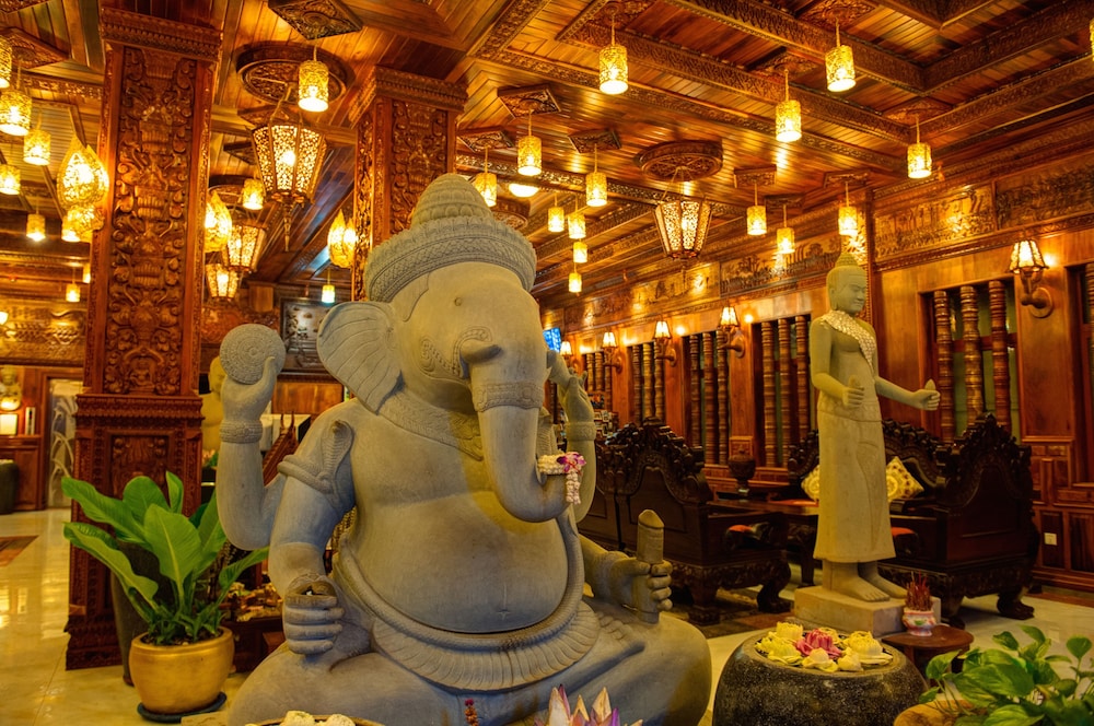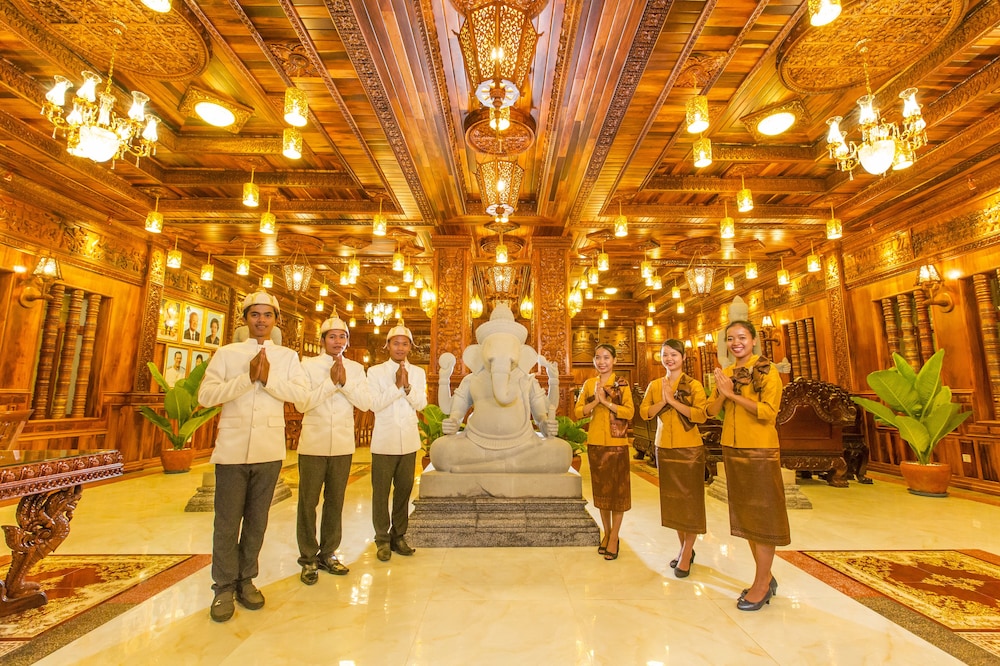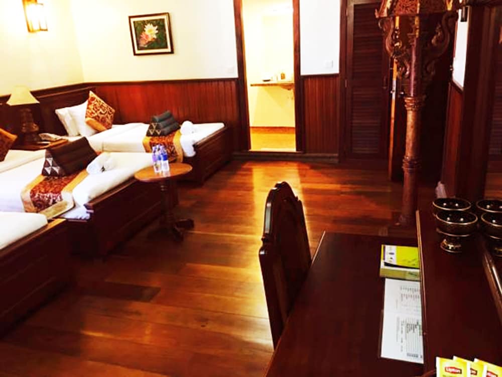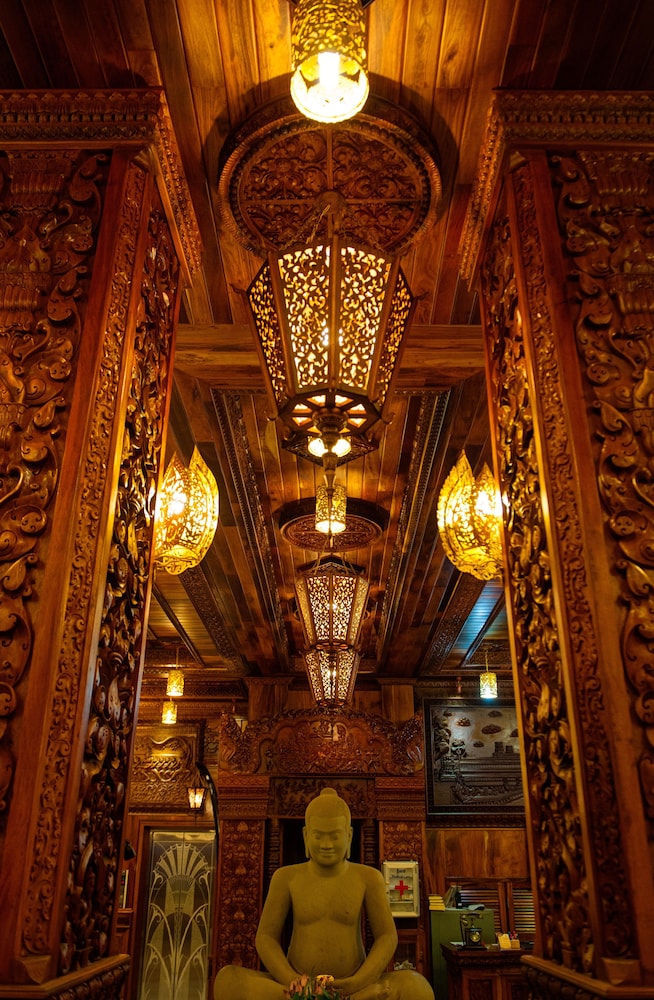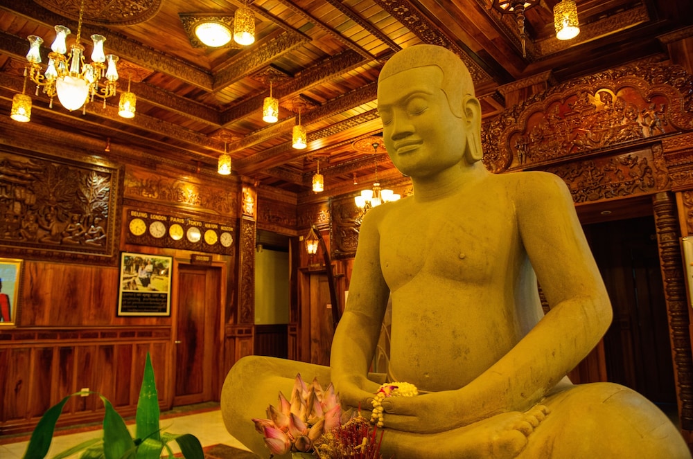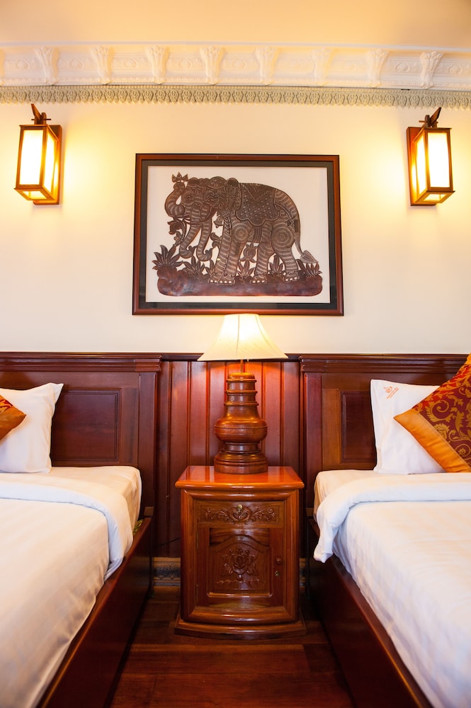 Okay hotel is an older hotel that features Khmer woodwork and carvings throughout. Our 1st room was spacious with a great view of the Palace. Unfortunately, we were woken up at 1:00 AM by a loud screeching noise from the wall mounted air conditioner and a large pool of water on the floor underneath it. Staff promptly changed our room to a comparable room.