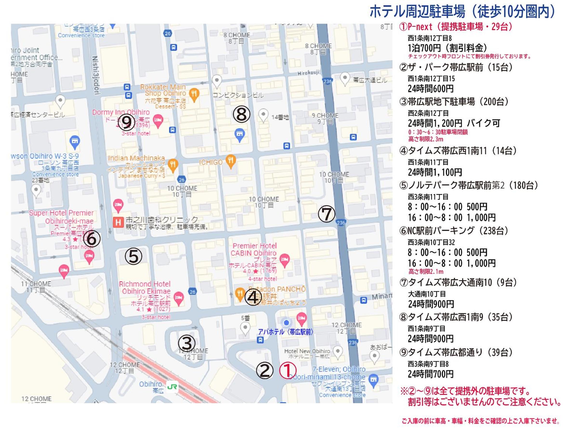 Private parking is possible at a location nearby (reservation is not possible) and costs JPY 700 per day.