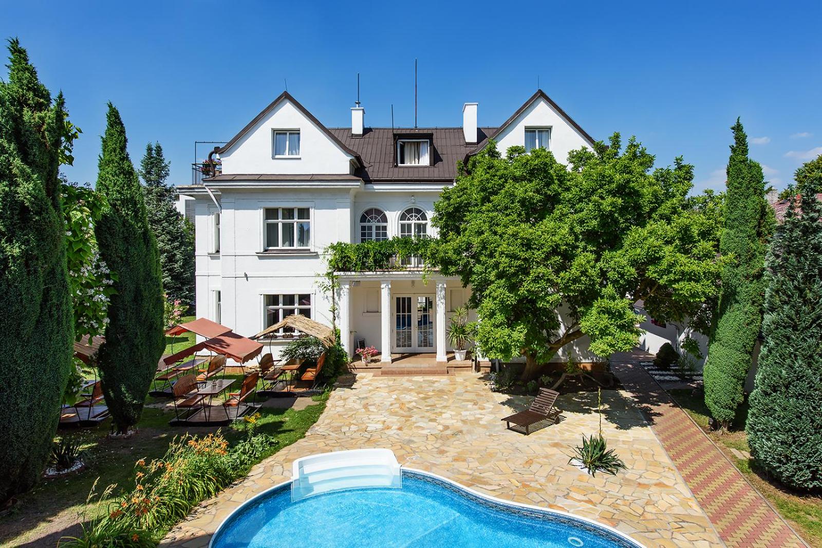 Guests can unwind in the spa area, indulging in the sauna, hot tub, and outdoor pool. The expansive garden offers a tranquil space to rejuvenate after a day of exploring Prague.