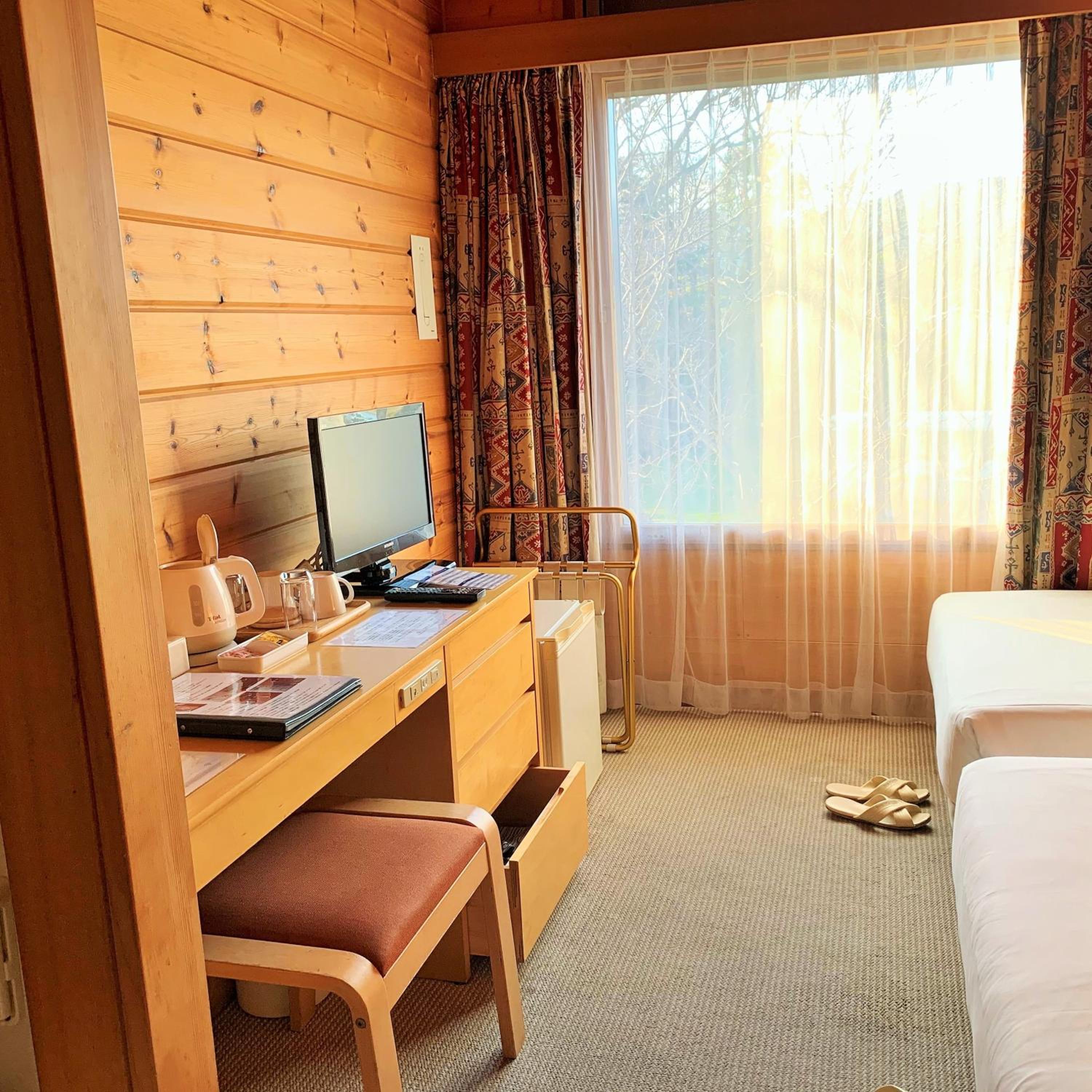 Experience luxury at Grand Park Hotel Okubiwako Makino with its private beach and beautifully designed guestrooms. The natural colours and wooden walls create a warm and inviting atmosphere for a relaxing stay.