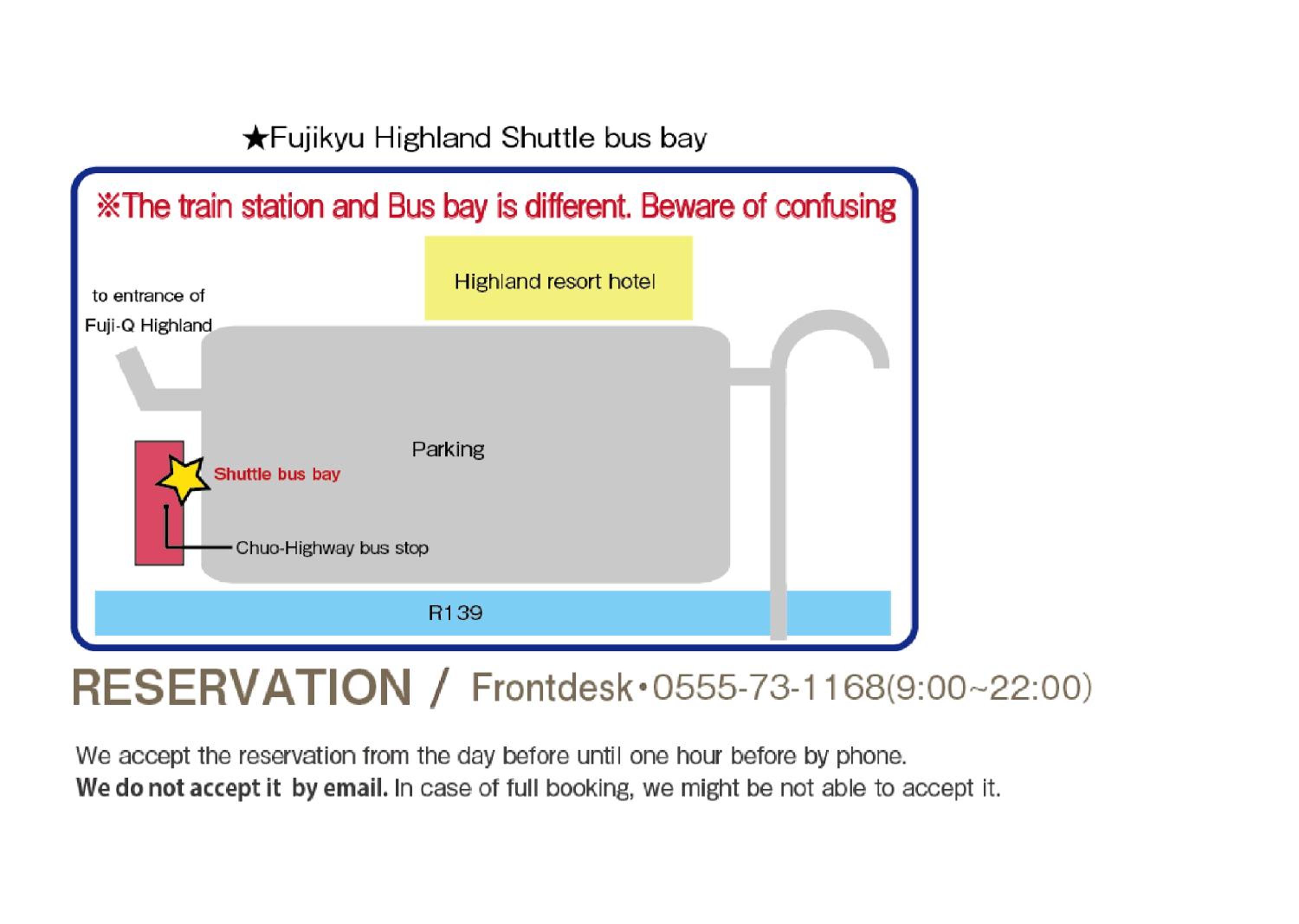 The shuttle departs Fuji-Q Highland Highway bus stop every hour between 08:55-12:55 and 14:10-19:10.