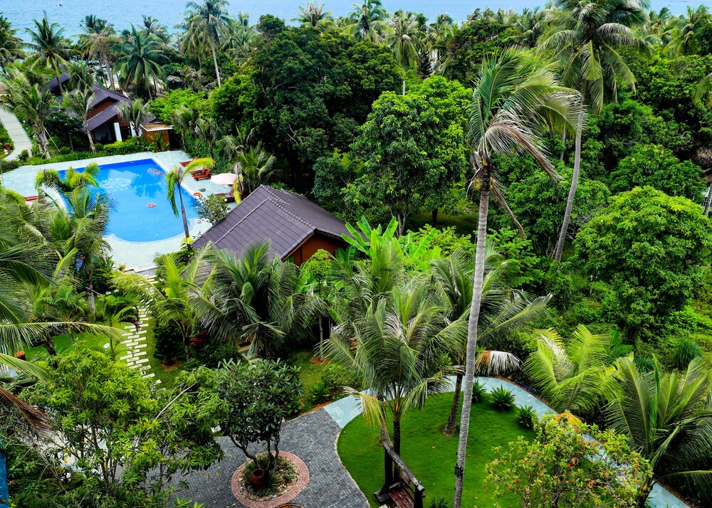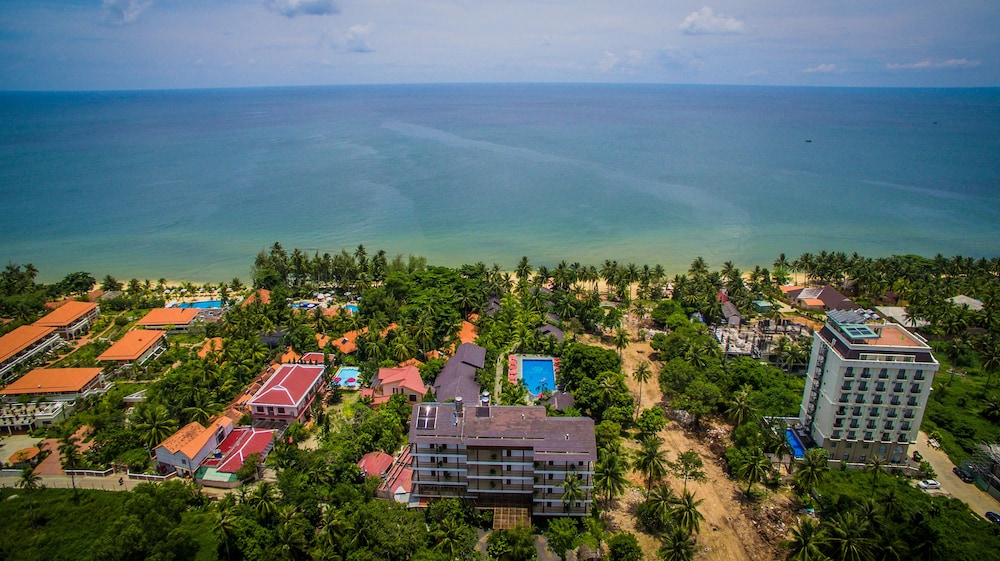 This place was pure gold for me. I didn’t want to book some crazy expensive resort where you have no interaction with locals, so instead I booked a sad moldy room off the main drag that was terrible. I canceled that and came here—what a relief. It’s clean, comfortable, air conditioned, and on the beach and there’s a good pool, too, but it’s also in town so you can walk to dinner and everything you need. The staff are super nice. There’s a decent cheap breakfast and you can rent paddle boards. All this for $46-$60/night. It feels like sort of low-end luxury. High-end budget? Anyway, why only 4 stars? The beachfront isn’t the best and they don’t groom and clean it like at fancier resorts. The ocean here is full of trash, and it’s a bummer. I spent much of my paddle board time scooping plastic bags and bits and pieces out of the ocean—if you come to Phu Quoc, you should, too.