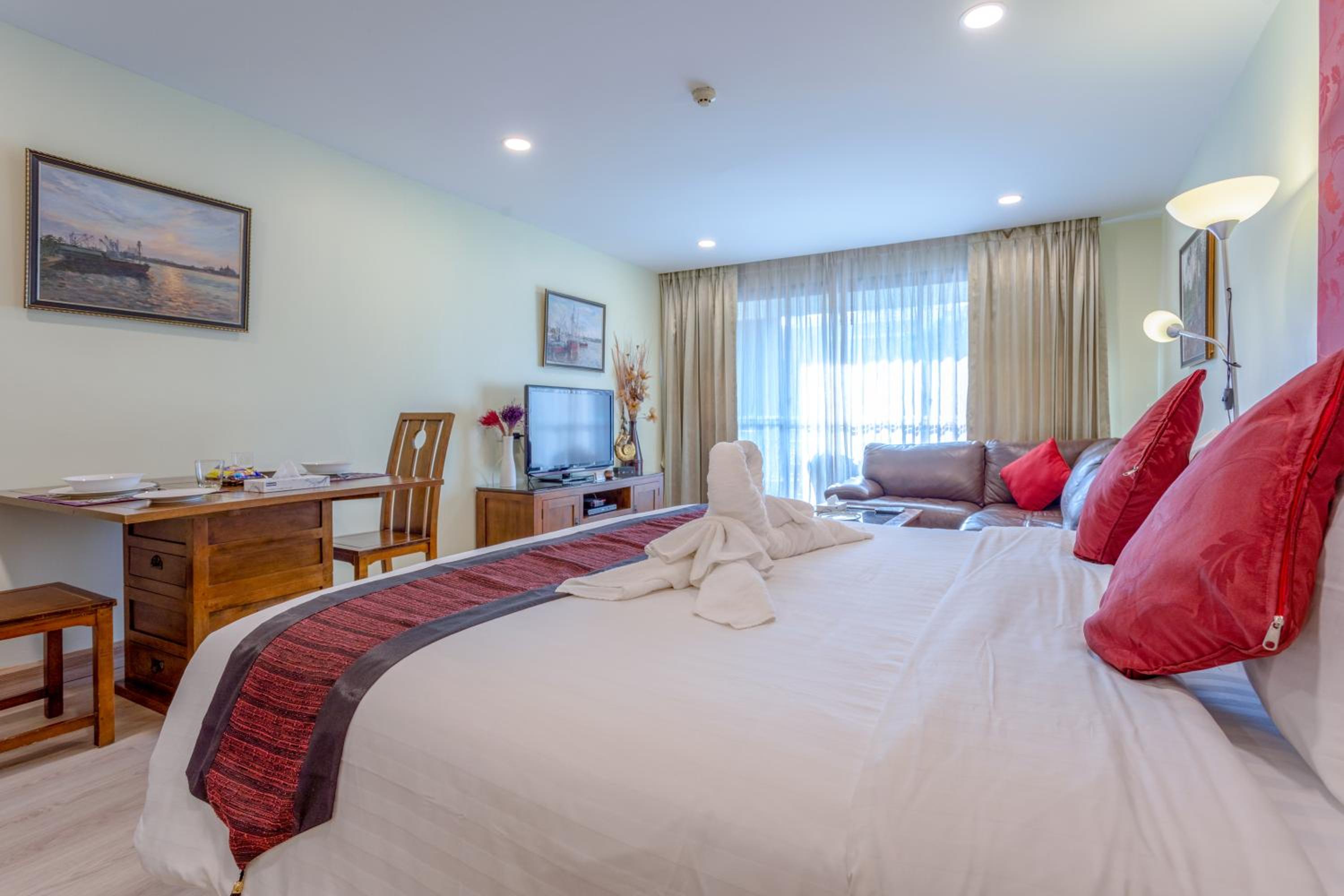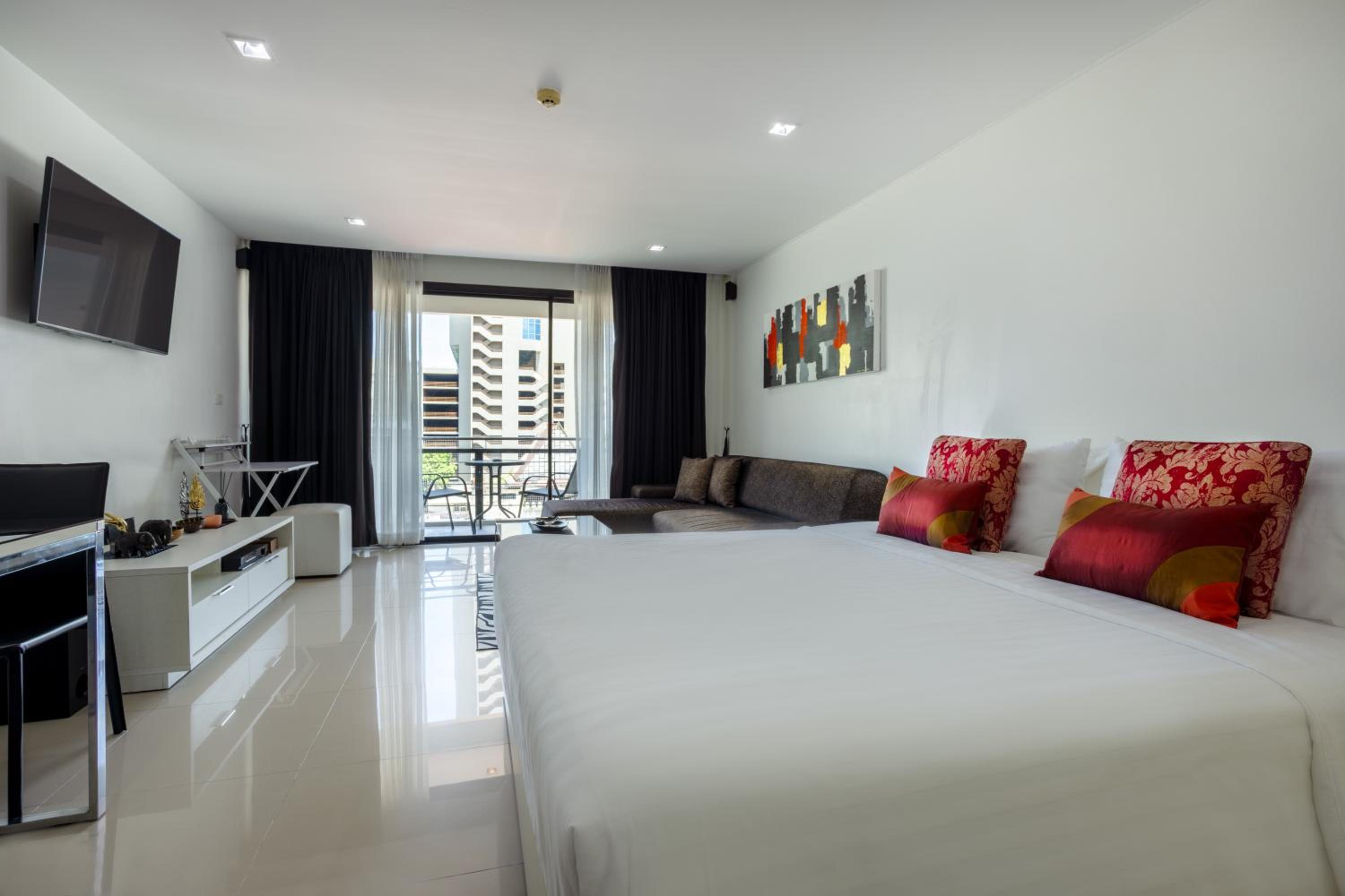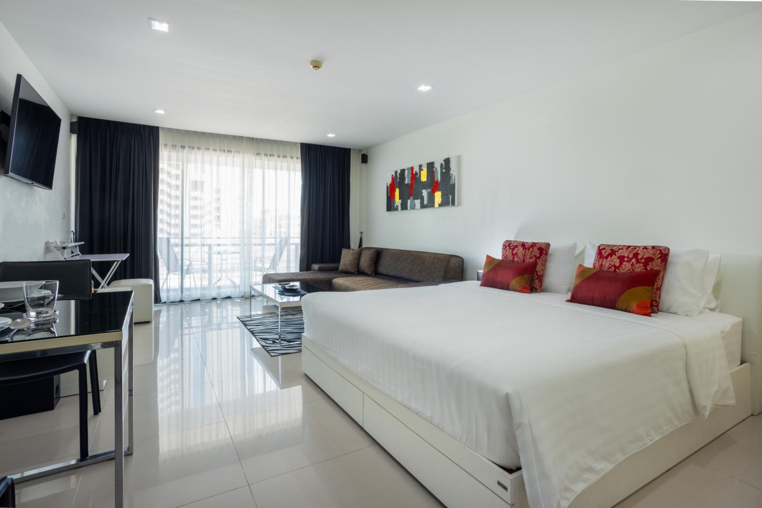 Our air-conditioned apartments are equipped with a 42-inch flat-screen TV, a fully functional kitchen, and a private balcony, providing you with all the comforts of home during your stay.