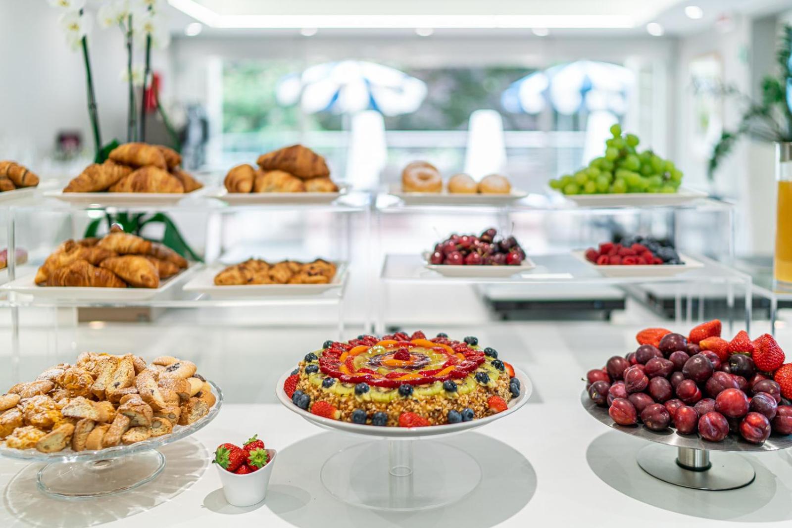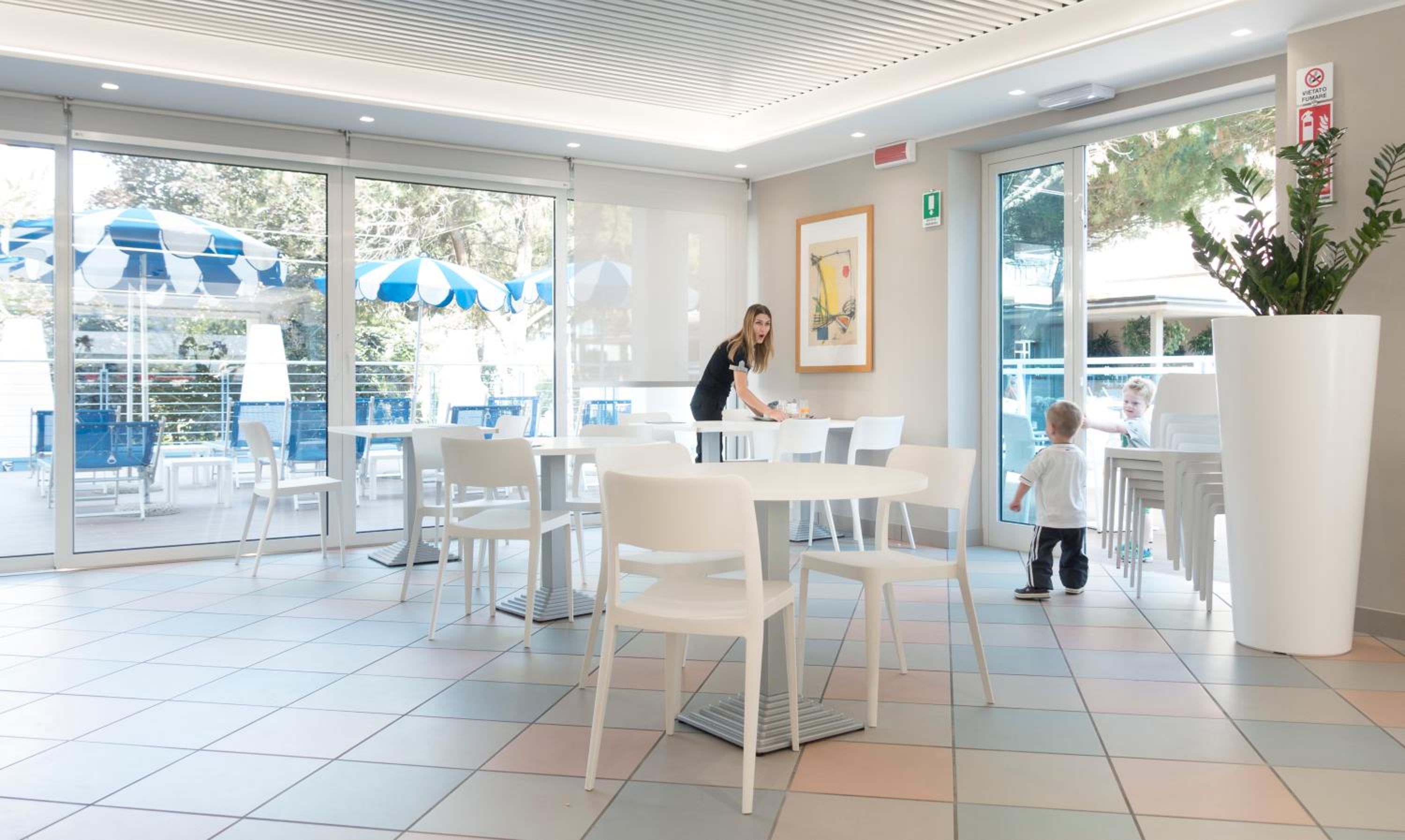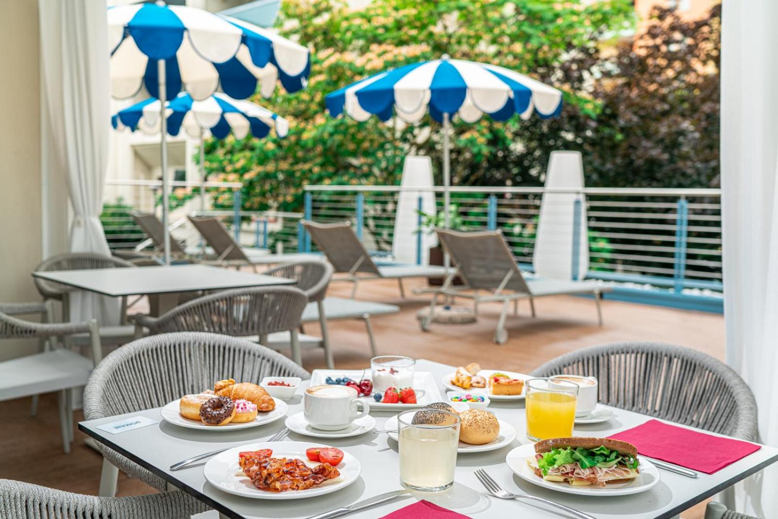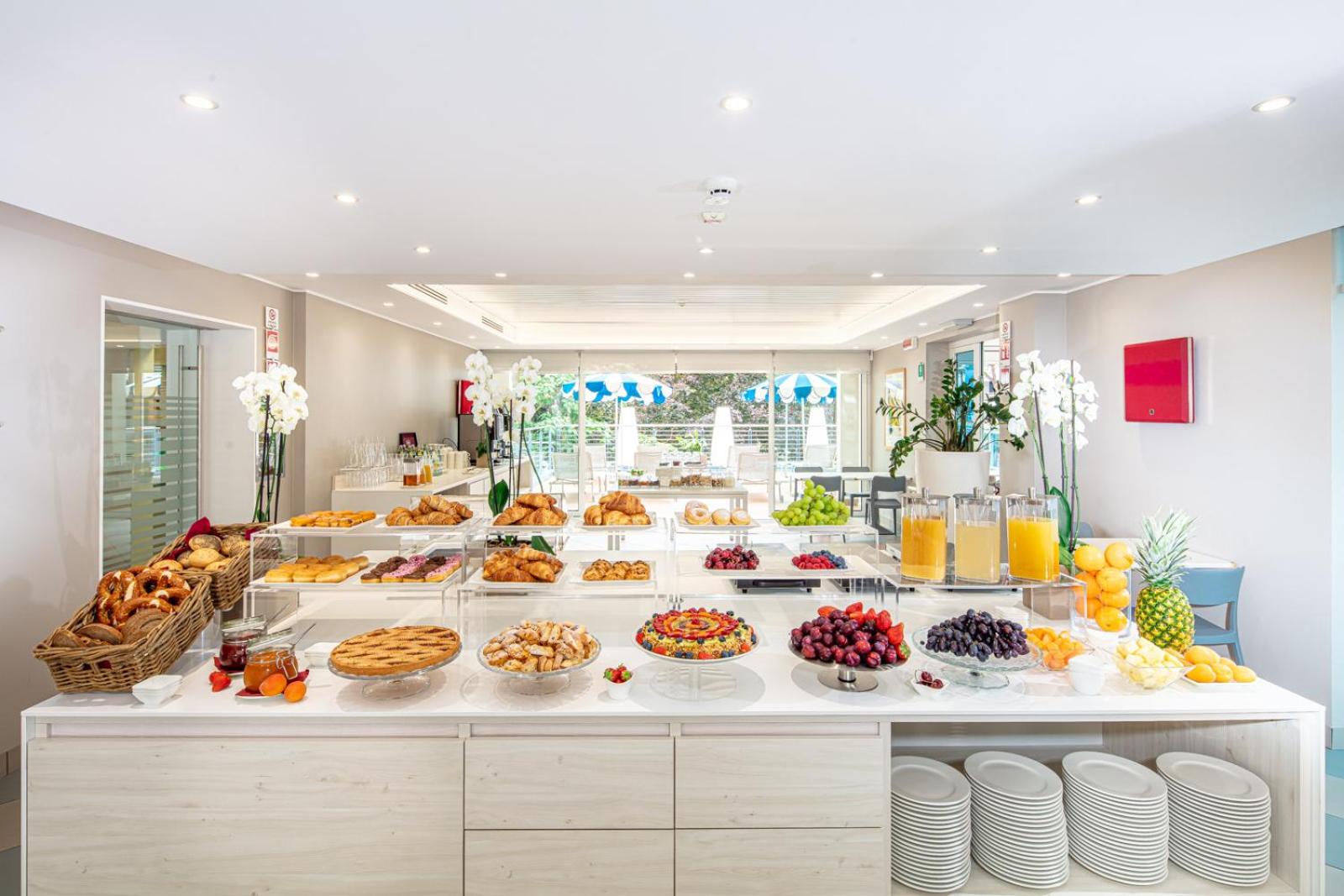 Super lækkert hotel (det er vores 4. Hotel i Bibione og klart favorit) i kort gåafstand til byen og stranden, og hvert værelse har 2 strandstole og en parasol tildelt. Morgenmaden var mega lækker og har lidt af hvert og de var rigtig gode til at fylde op løbende.