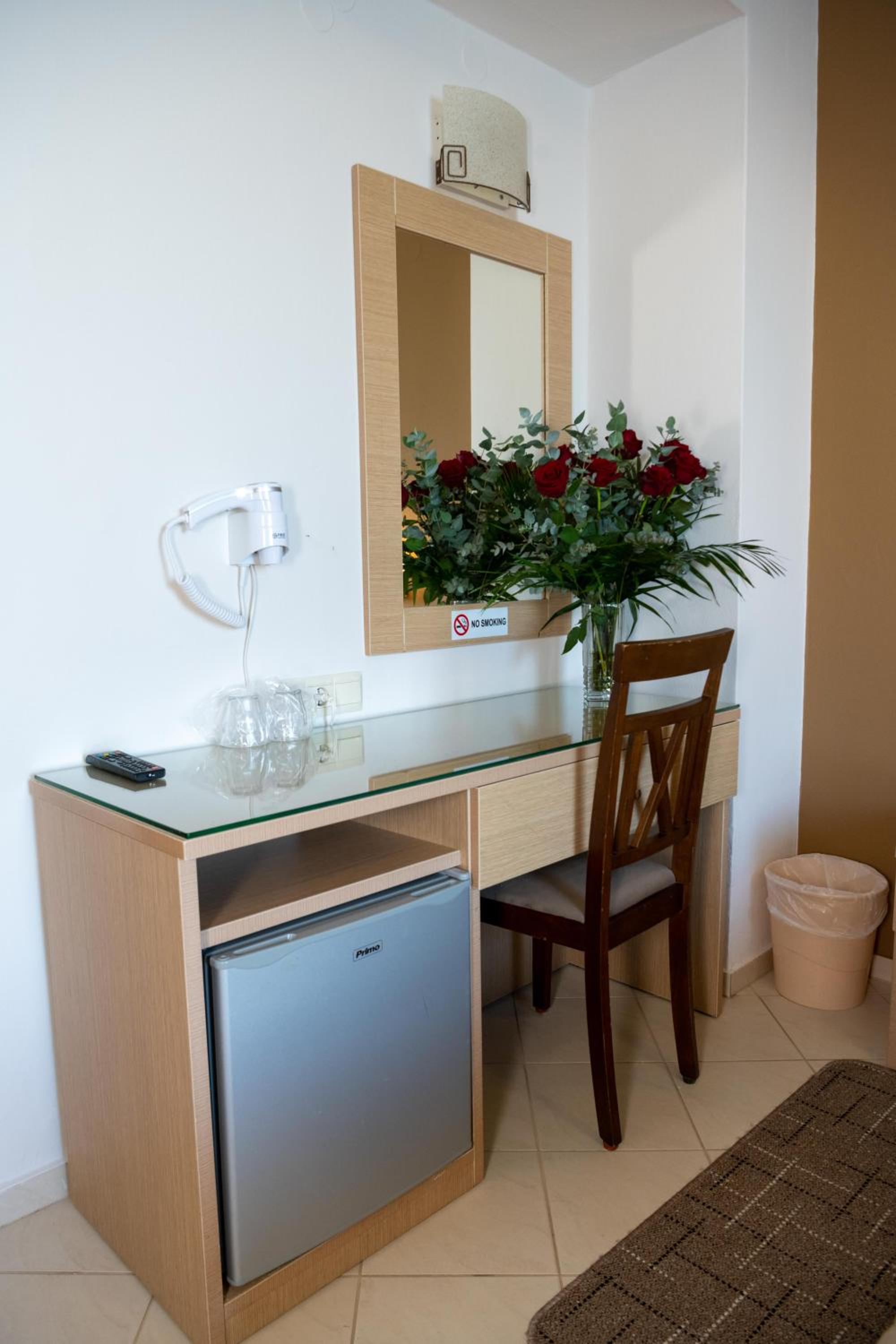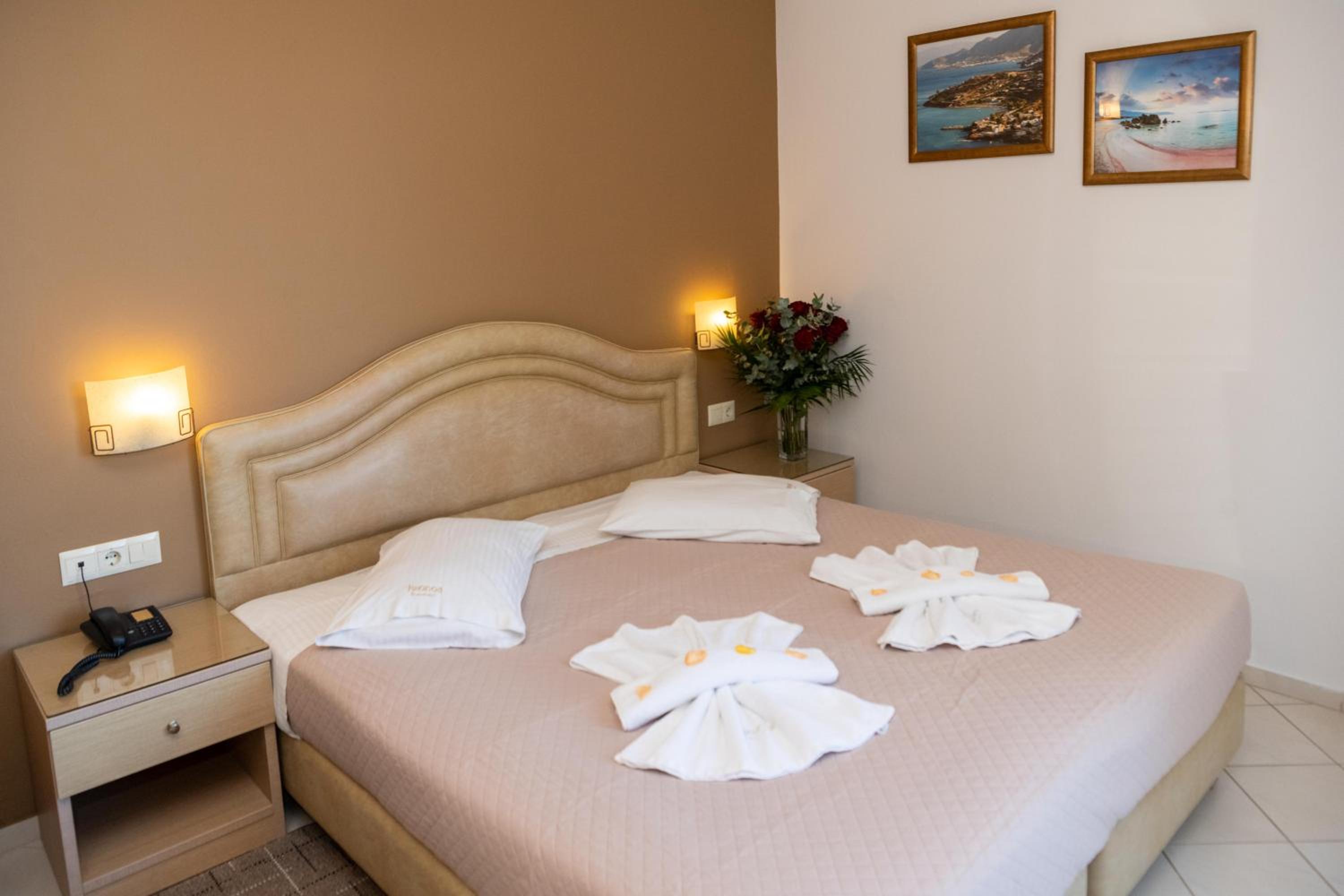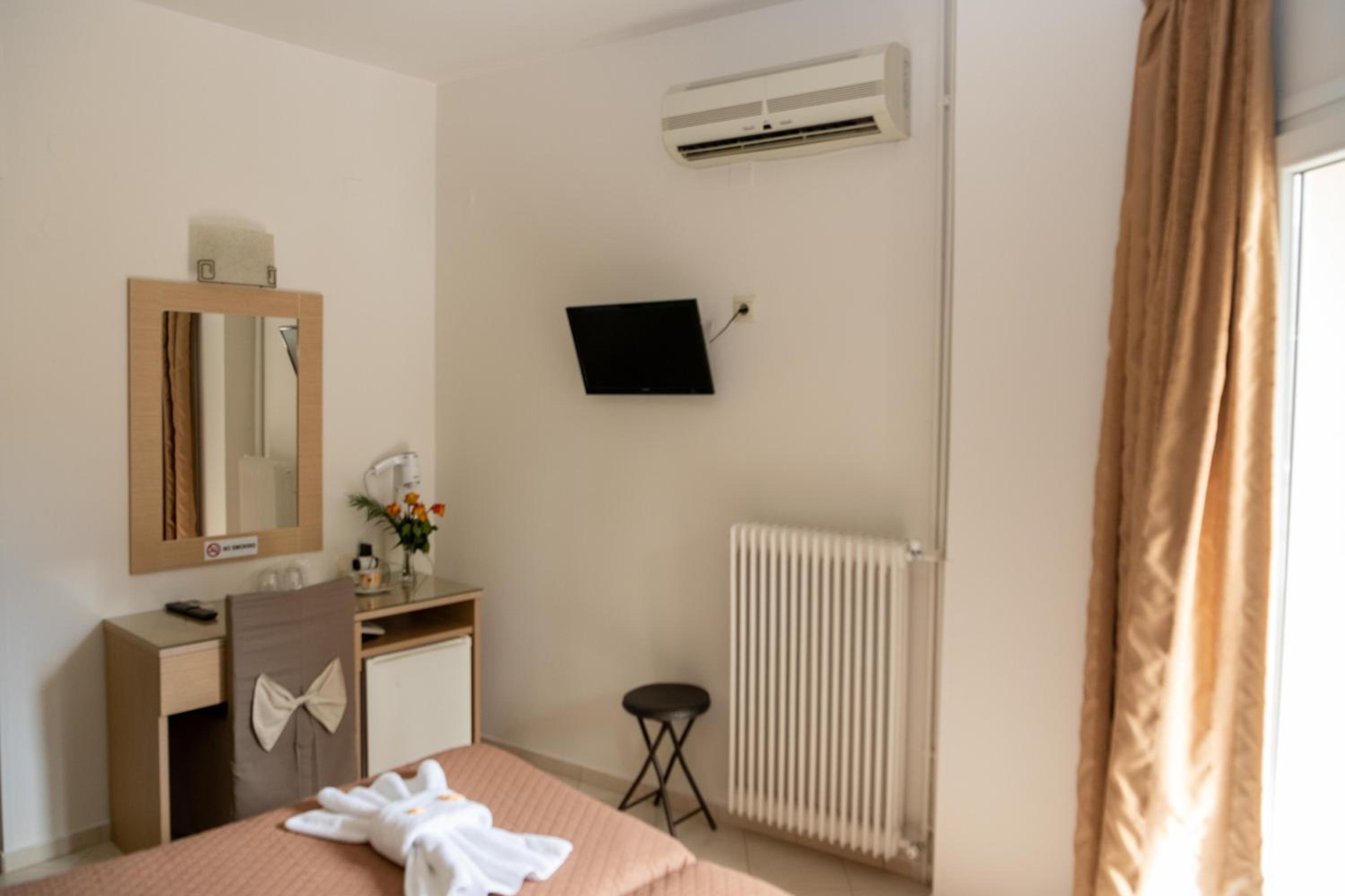 Charming Rooms with Modern Amenities: Kronos Hotel offers simply furnished rooms with private balconies and views of the sea. Each room is equipped with a TV, air conditioning, and a mini fridge for utmost comfort during your stay.