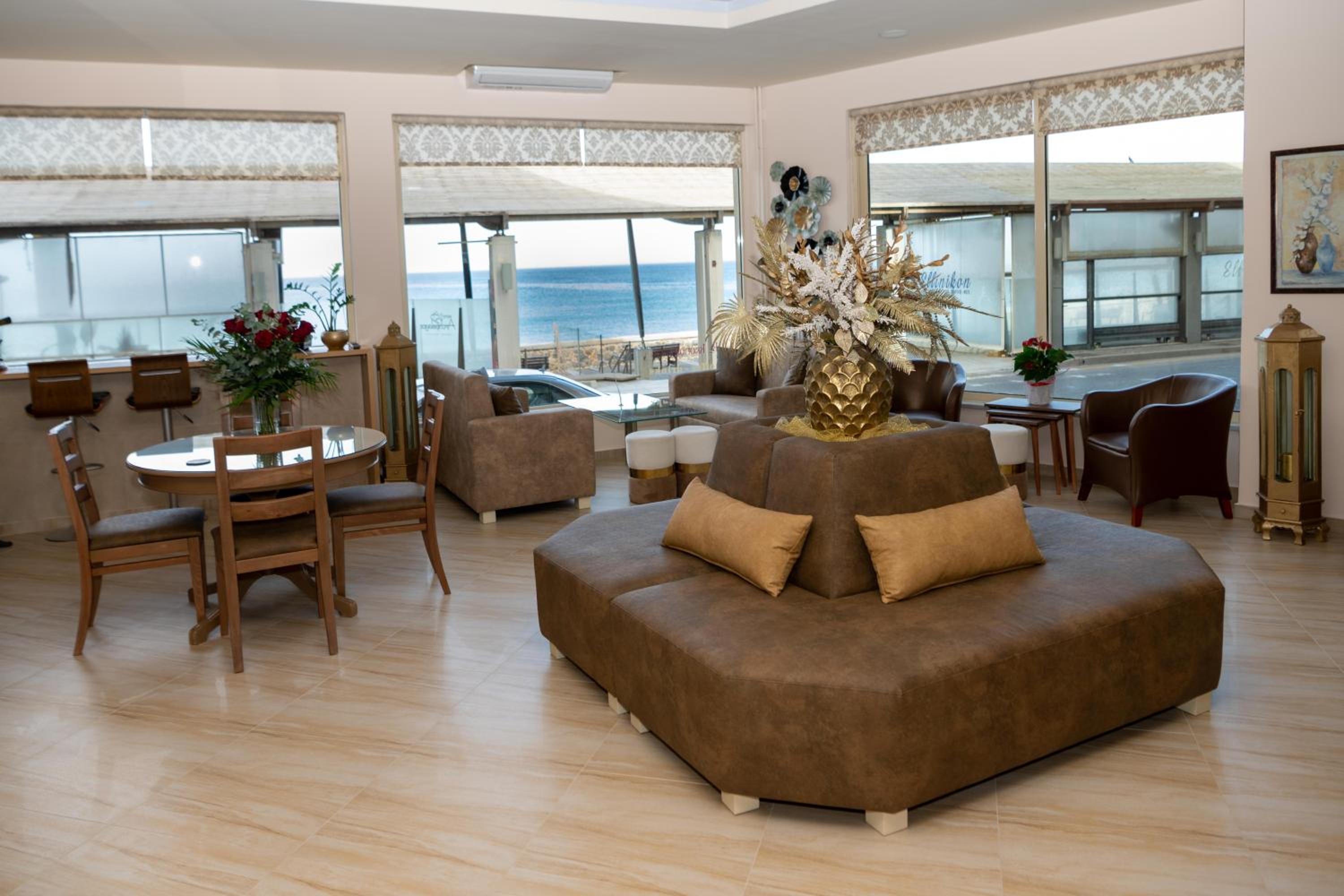 Elegant Dining and Lounge Experience: Start your day with a delicious buffet breakfast in the dining area. Unwind in the evening at the stylish lounge area with leather furnishings while enjoying panoramic views of the Cretan Sea and sipping on your favorite drink or cocktail.