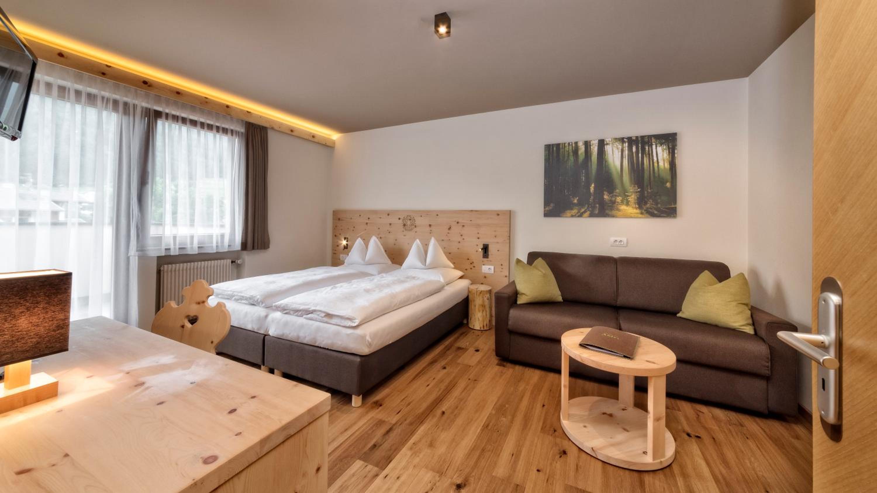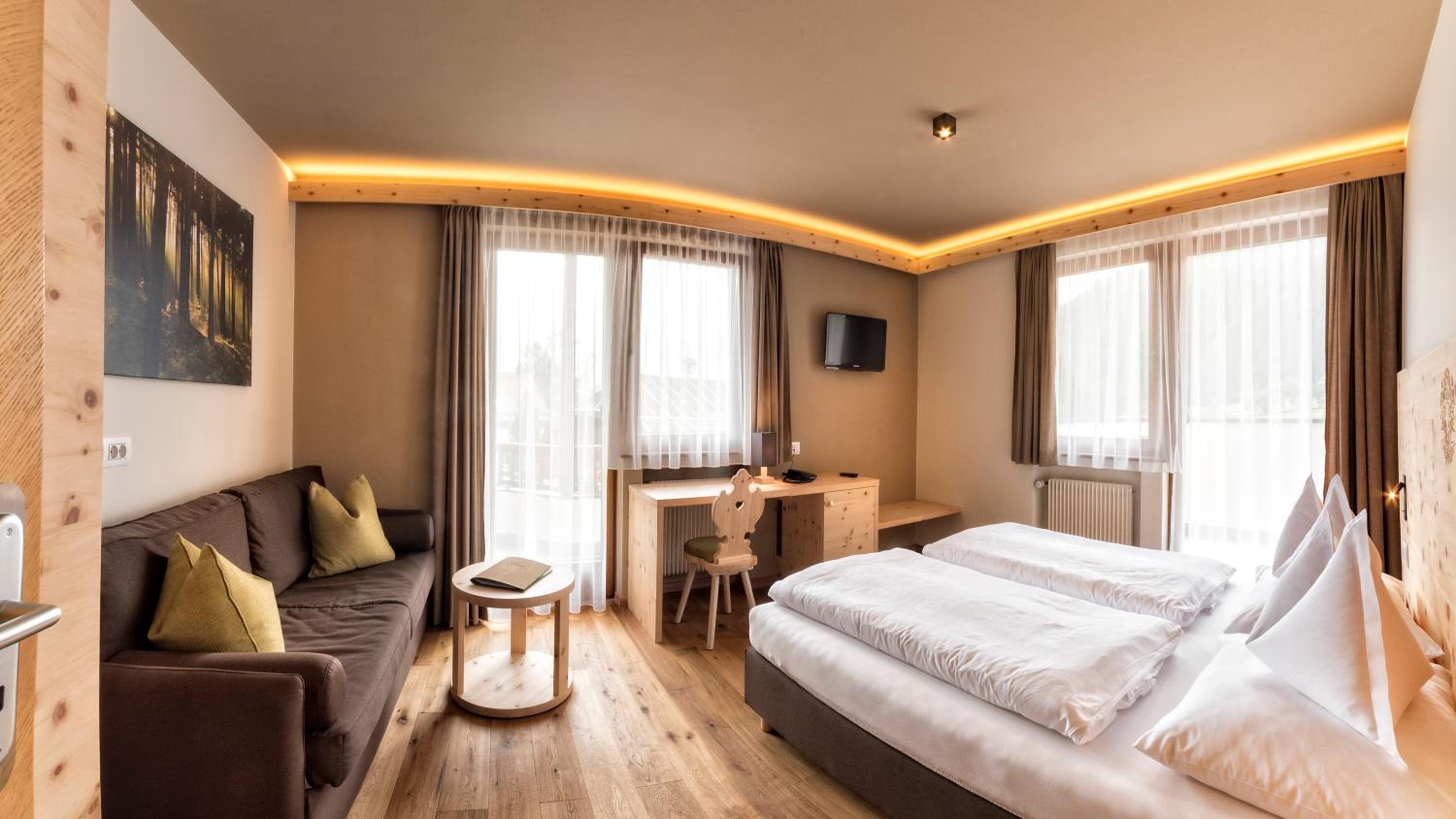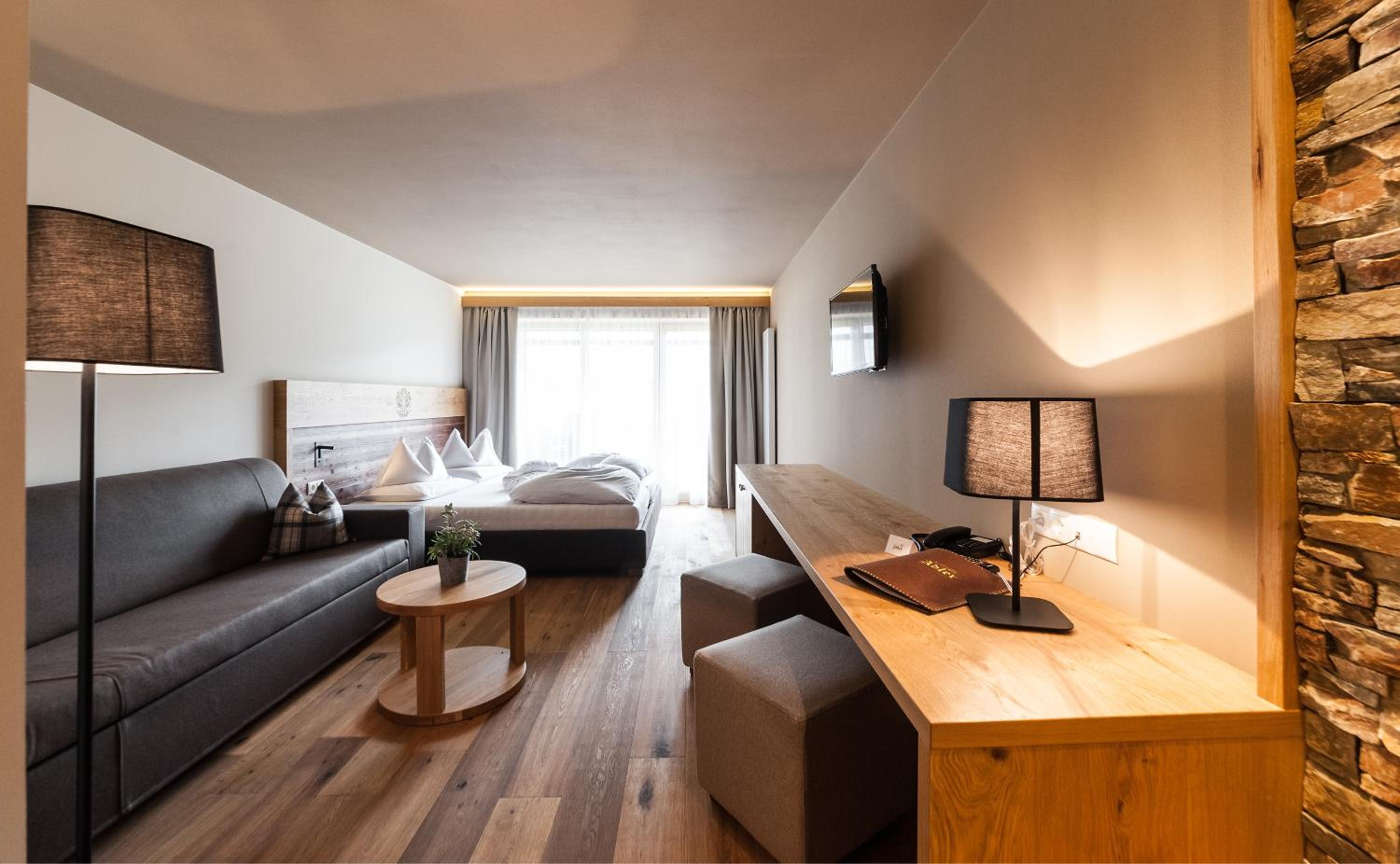 Indulge in Alpine Comfort: The spacious themed rooms at Adler offer a cozy retreat with Dolomite views, wooden or carpeted floors, and modern amenities like satellite TV. Some rooms even feature a private balcony to soak in the stunning surroundings.
