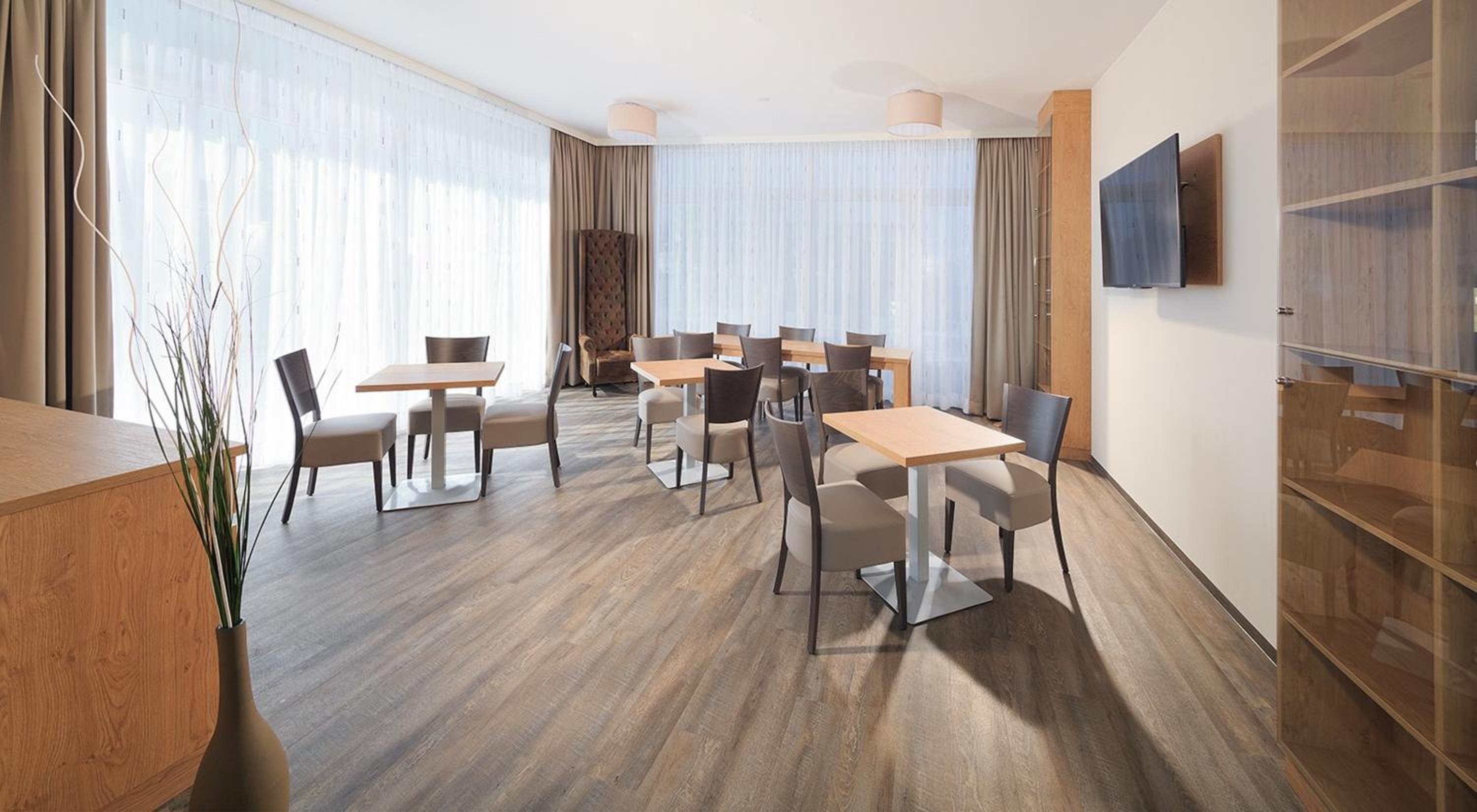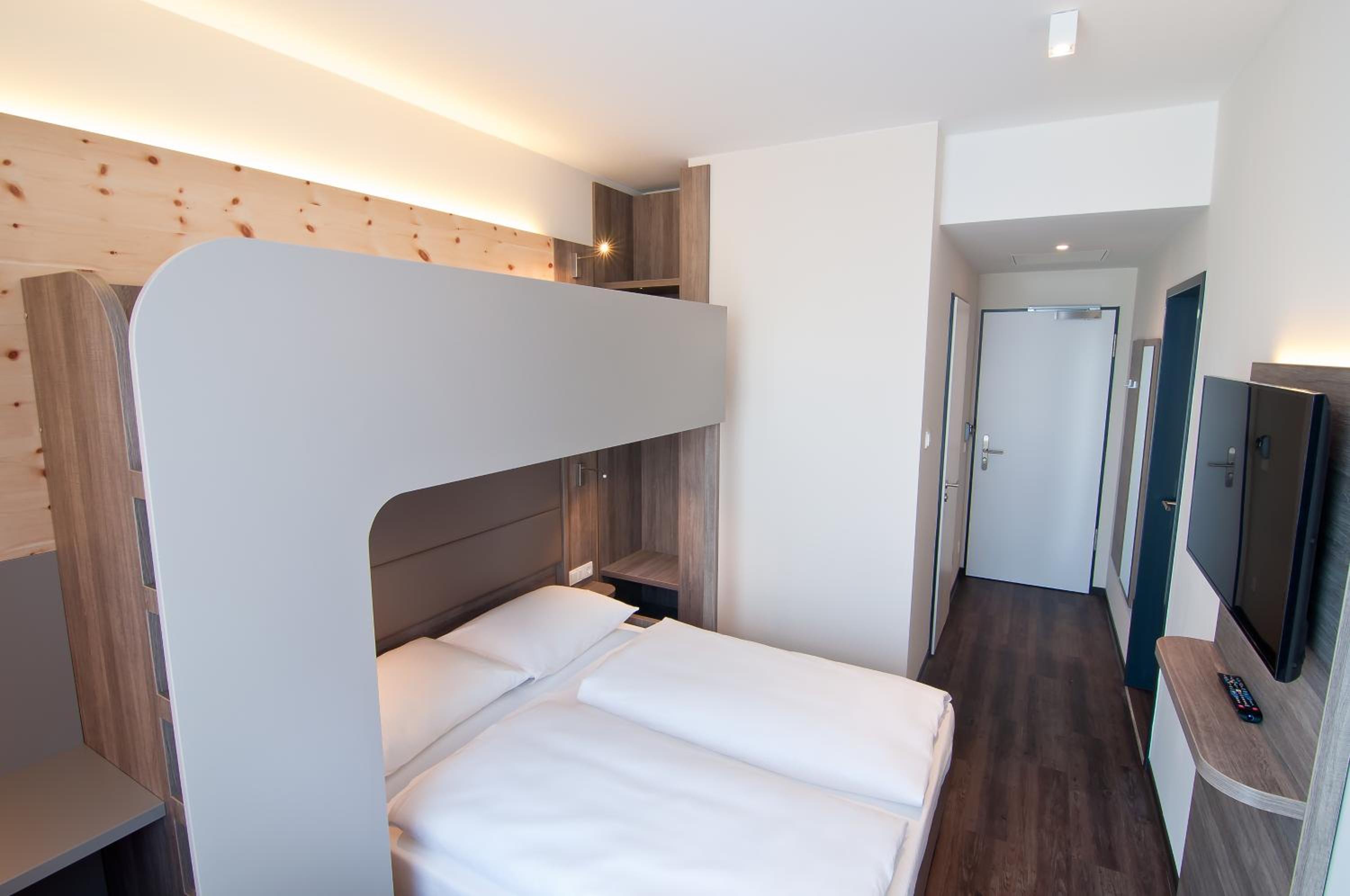 The Amaro Hotel boasts bright and modern rooms decorated with Swiss pine wood interiors. Each room features a 40-inch flat-screen TV and a modern bathroom with a spacious rain shower, ensuring a comfortable and relaxing stay for guests.