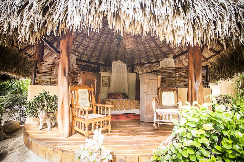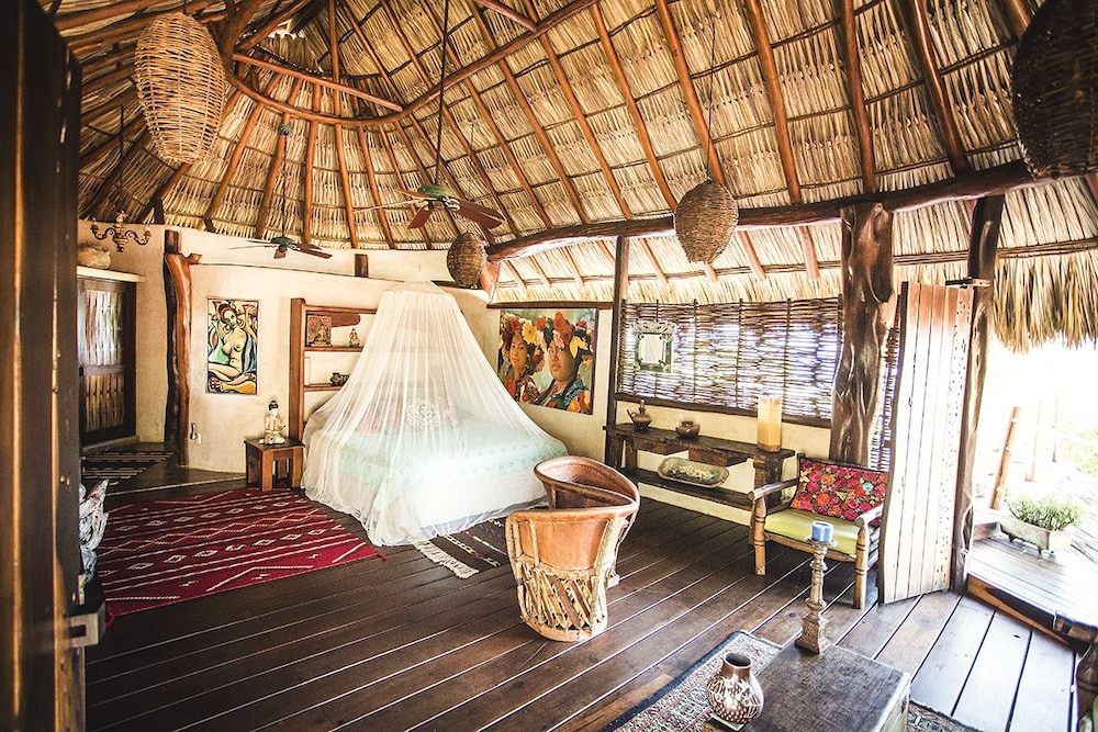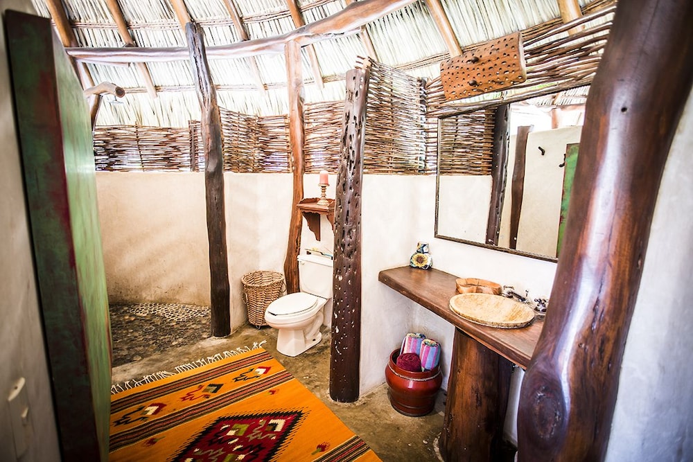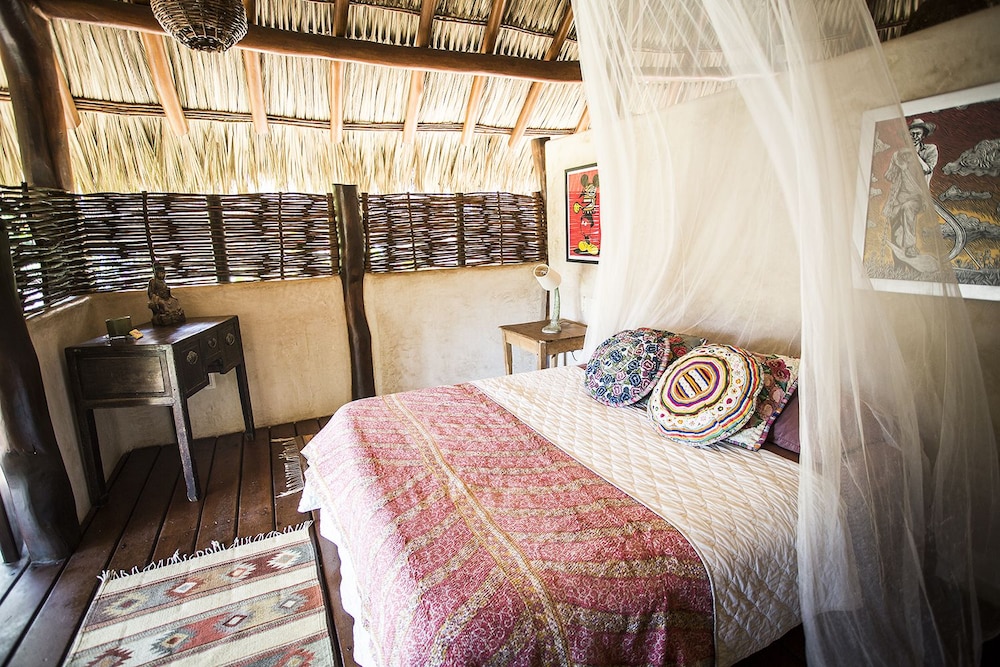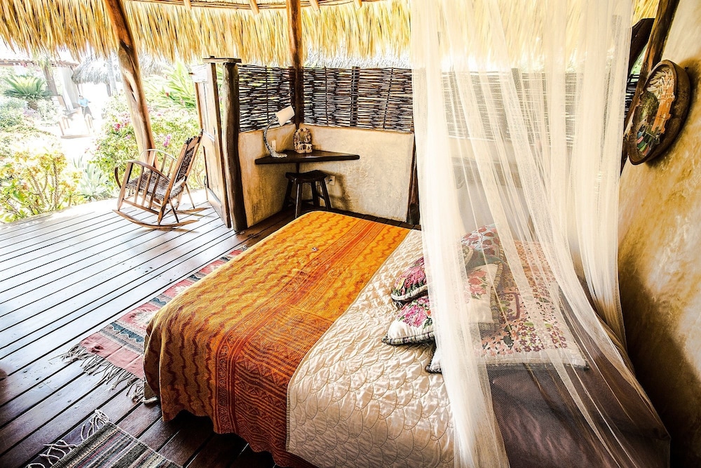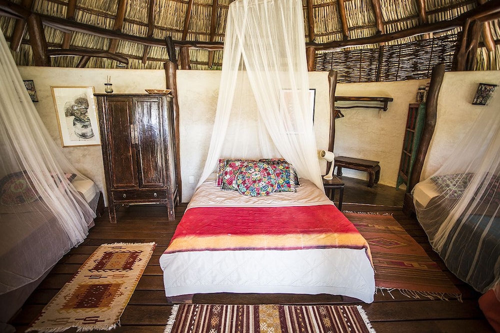 I have roughed it in the Amazon and stayed in posh "tents" in Africa....this is something in between. The grounds are immaculate and I was pleasantly surprised to have my suitcase brought to a large, open-air, palapa-style room, before I had even found the front desk. I felt like I had stumbled into the style of vacation I see in the movies, but never can afford in reality. Mosquito nets graced the beds but were never *really* needed. Colorful wool rugs accent the floors and although their is room to store you belongings the room still felt spacious and free-flowing. The shower is divine. I would always prefer a bit more lighting for personal grooming but I got along fine, contact lenses and all. While the food is not inexpensive, it is top-notch and mouth-watering. The entire staff is very hard-working, kind and generous and they seem to be treated as family. Meditation and yoga activities go on throughout the day and there is something for everyone. My only wish would have been for a bit of music to be quietly played in the restaurant while no practices were going on. At least occasionally. They did have fun music in the evenings, either live or the staff's. I would also warn those travelers that are used to sleeping in complete quiet to bring earplugs! Although the rooms are set back from the ocean, you are still hearing the waves quite well. I should have thought ahead and was a little surprised at how much that aspect affected my sleep!