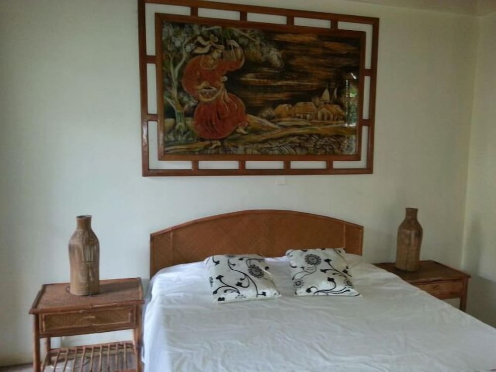 This place is down a little back road off the loud main street. The rooms were beautiful and very comfortable! We loved walking back from the beach from surfing for a few hours, rinsing off and relaxing in the pool. There is a small bar to get drinks to help with the relaxation. They play loud music during the day, but it was turned off @ about 8pm and it was very quiet at night. Beds were very comfortable and A/C was so nice to have in the humid night. Oh and when eating there free breakfast wait to see the HUGE iguanas!