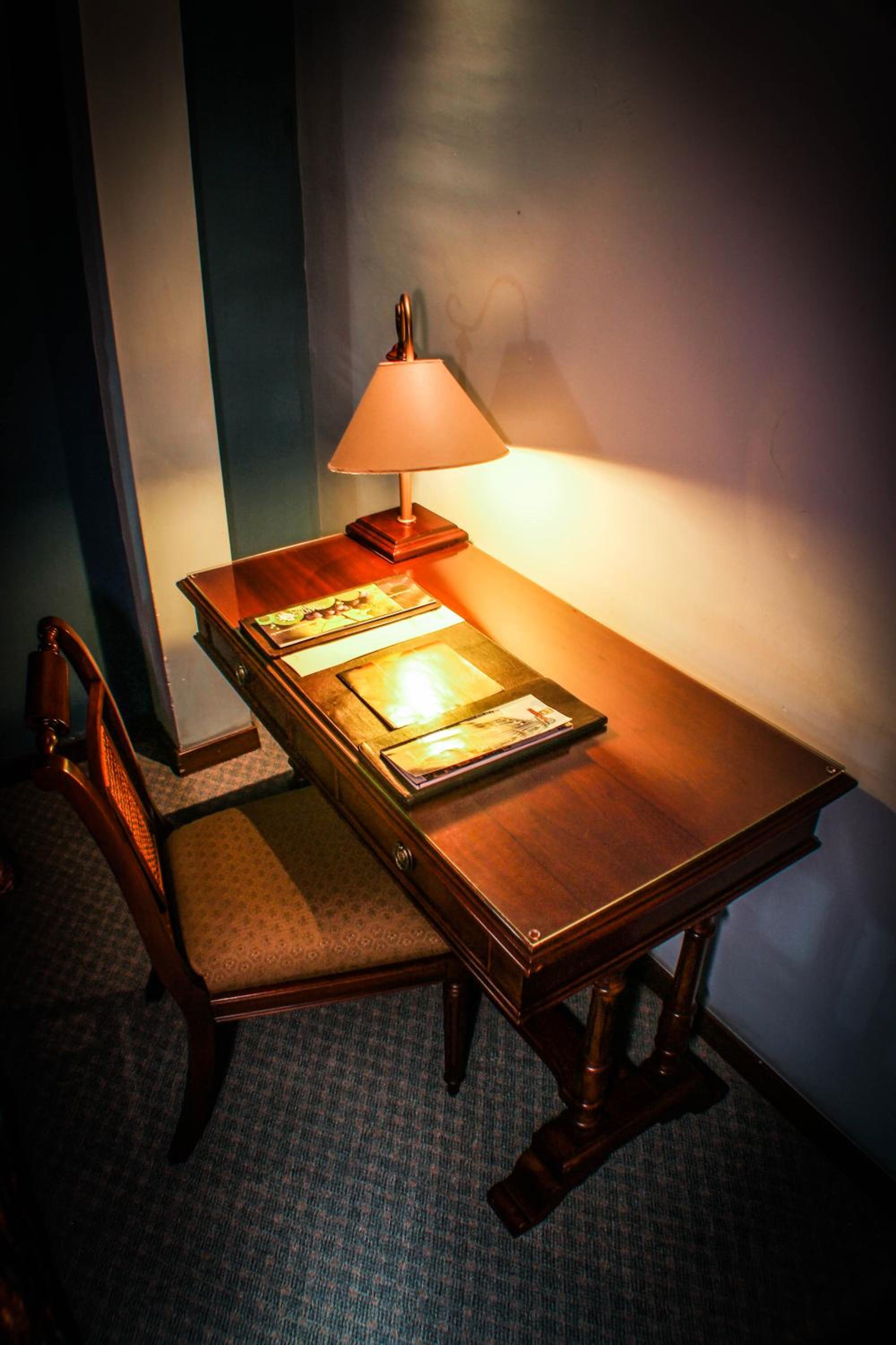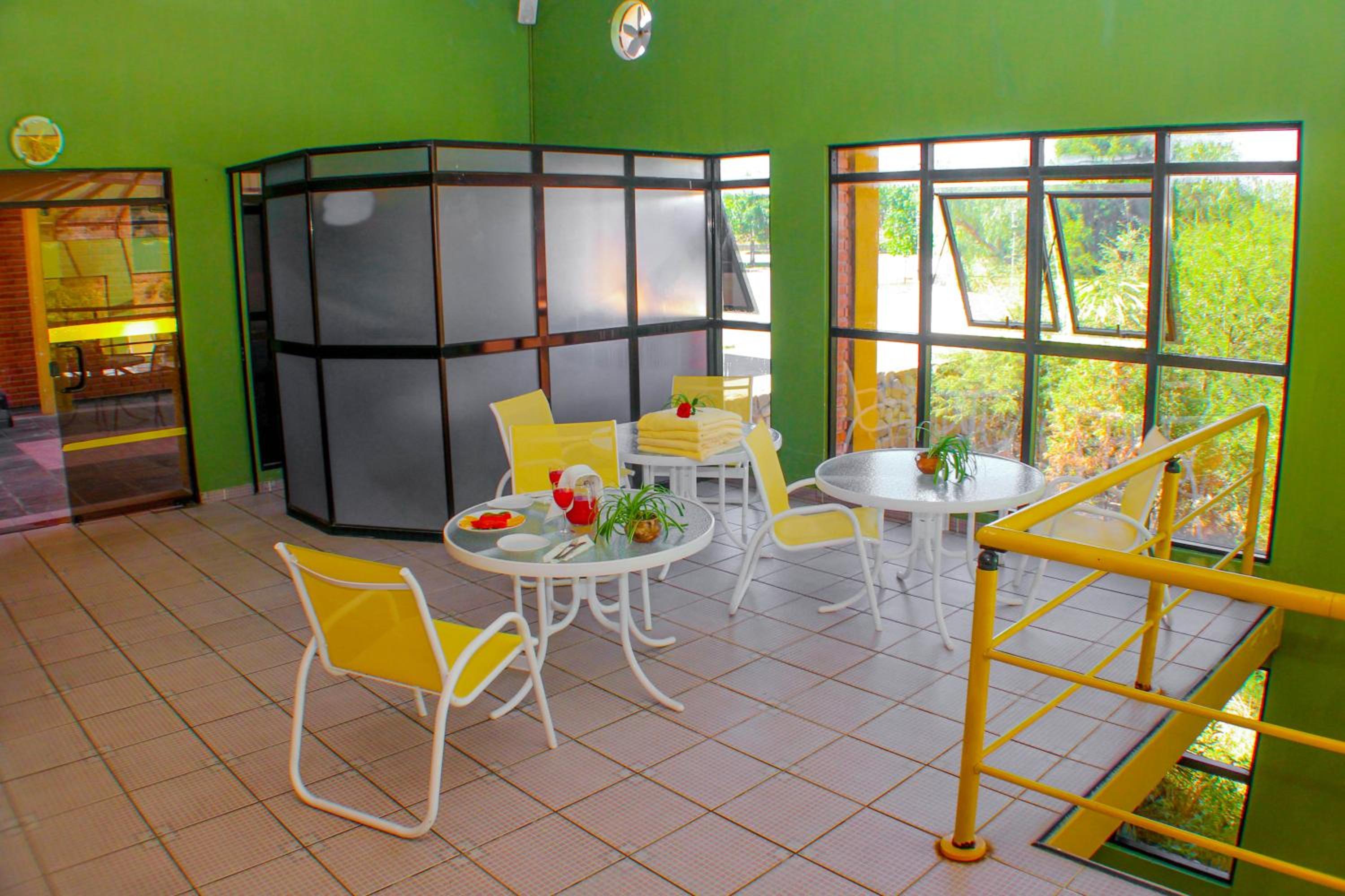 Mesas espalhadas por todas as áreas comuns do hotel, forçavam os hóspedes a usar somente os seus quartos.