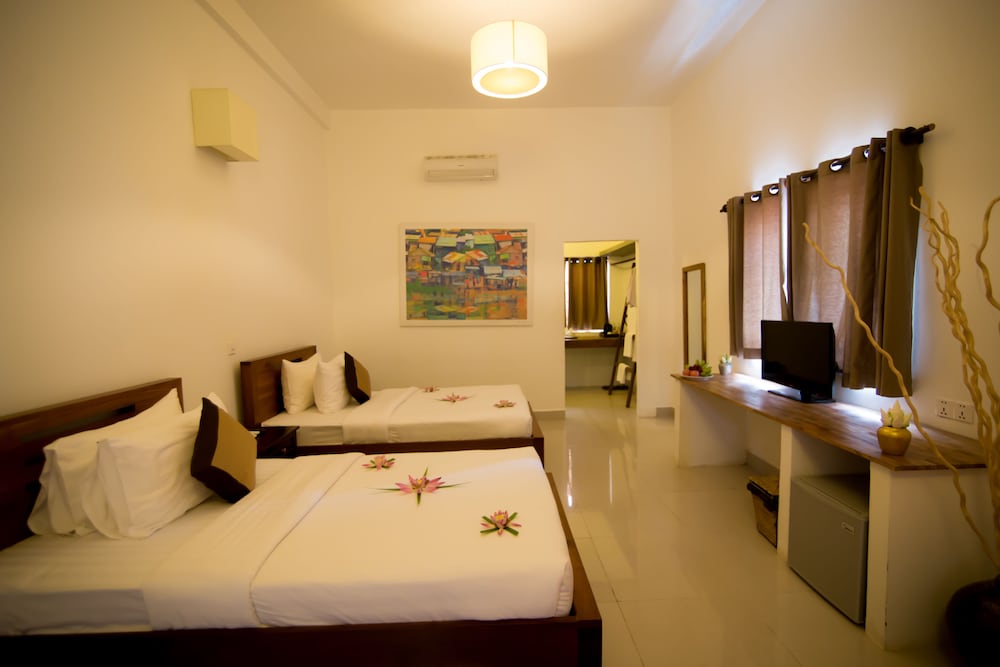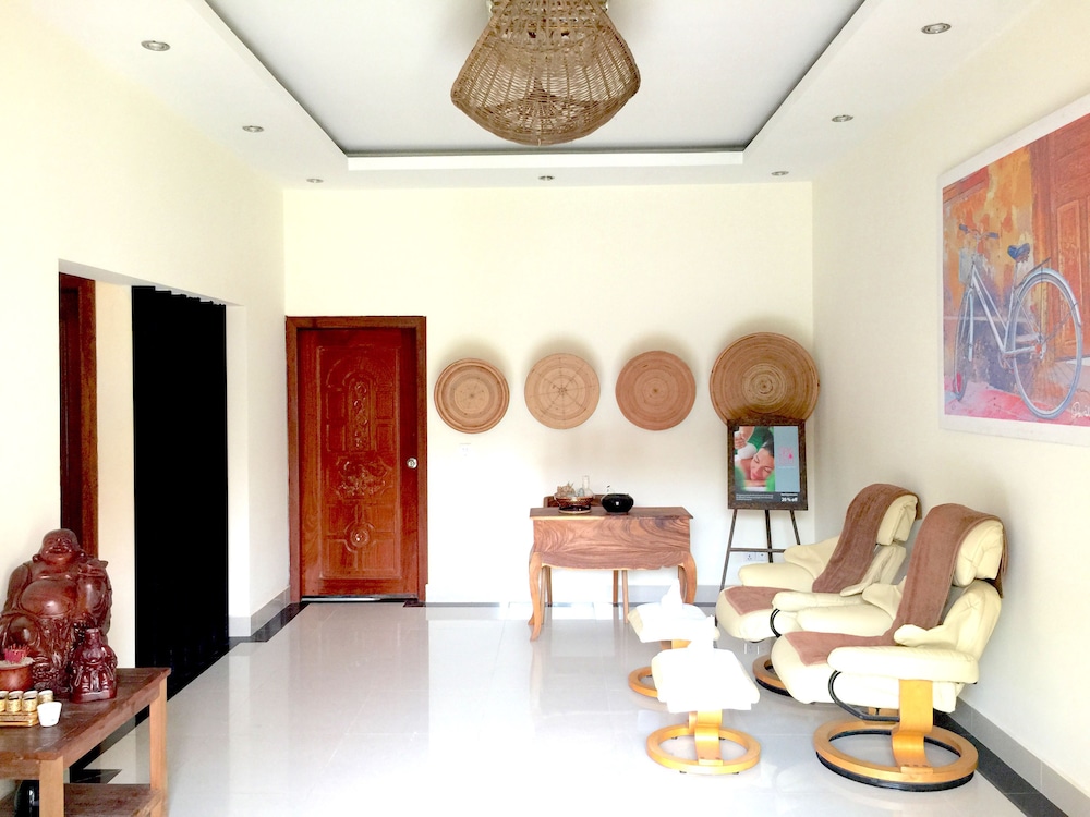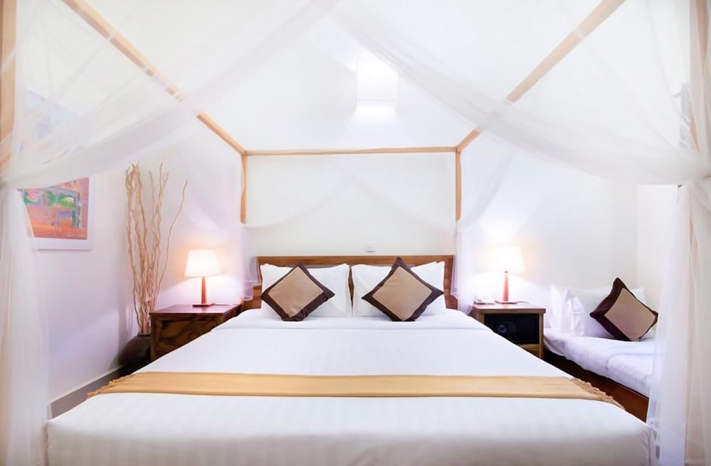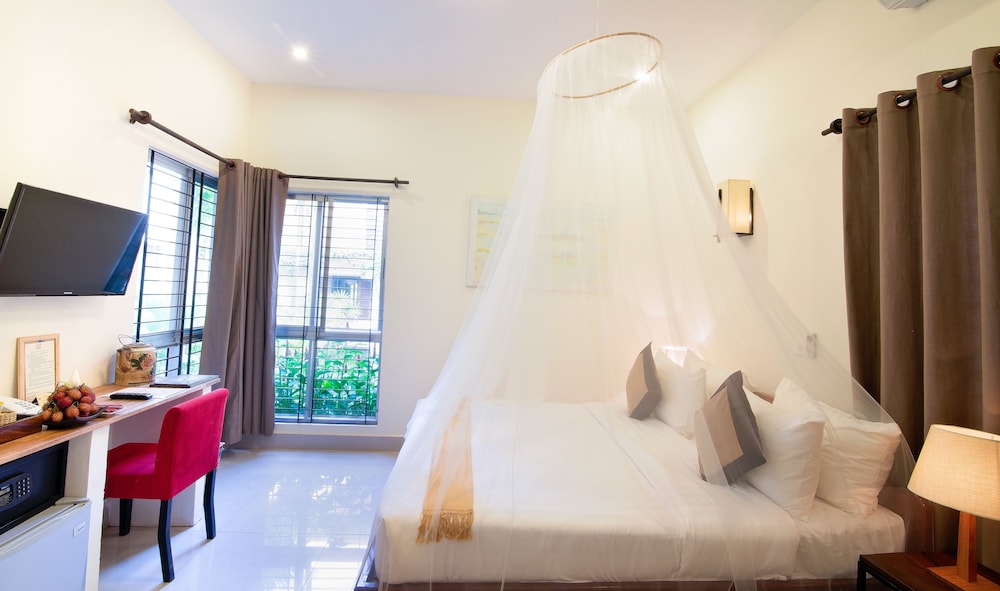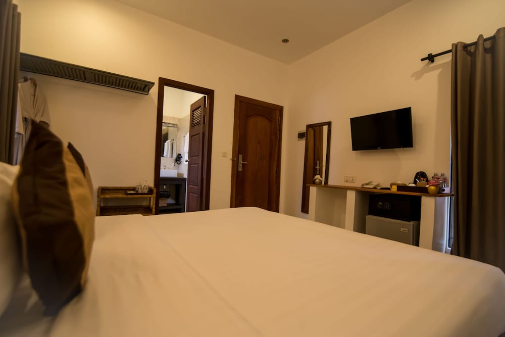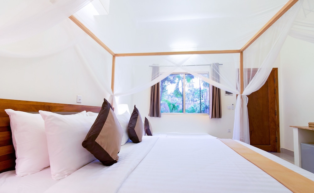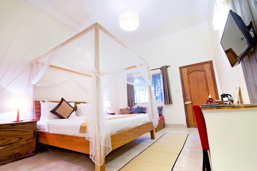 1. Отель расположен не в центре, но пешком вдоль реки 20-30 минут пешком или за 2-3 доллара на тук-туке. Но в этом есть плюсы. Тишина. Если идти в сторону центра, то есть два рынка через один и два квартала, где можно купить фрукты по ценам ниже, чем в центре. В Олюторский кварталах есть массажный салон - чистый, массаж делают хорошо и, опять же, в два -три раза дешевле, чем в центре или на центральных улицах. 2. Отель всего на 12 номеров, небольшой зелёный дворик с хорошим и чистым бассейном. Персонал отличный. Принимают карты. Можно у них же взять тук-тук для посещения Храмов Ангкор: малый круг -15 долларов, большой-18. 3. Ресторан сильно распиарен в отзывах, народу нет никогда. Дорого и не вкусно. 4. Номера приличные, кровати удобные, душевая требует обновления, но все чисто. Интернет хороший. В целом за свои деньги (у нас в конце декабря стоимость была 33 доллара без завтрака) отель отличный